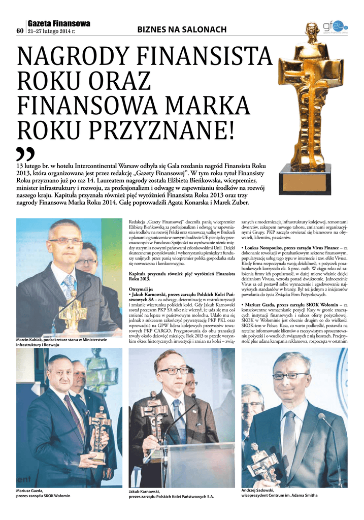 60 21–27 lutego 2014 r. biznes na salonach Nagrody Finansista Roku oraz Finansowa Marka Roku przyznane! 13 lutego br. w hotelu Intercontinental Warsaw odbyła się Gala rozdania nagród Finansista Roku 2013, która organizowana jest przez redakcję „Gazety Finansowej”. W tym roku tytuł Finansisty Roku przyznano już po raz 14. Laureatem nagrody została Elżbieta Bieńkowska, wicepremier, minister infrastruktury i rozwoju, za profesjonalizm i odwagę w zapewnianiu środków na rozwój naszego kraju. Kapituła przyznała również pięć wyróżnień Finansista Roku 2013 oraz trzy nagrody Finansowa Marka Roku 2014. Galę poprowadzili Agata Konarska i Marek Zuber. Redakcja „Gazety Finansowej” doceniła panią wicepremier Elżbietę Bieńkowską za profesjonalizm i odwagę w zapewnianiu środków na rozwój Polski oraz stanowczą walkę w Brukseli z planami ograniczenia w nowym budżecie UE pieniędzy przeznaczonych w Funduszu Spójności na wyrównanie różnic między starymi a nowymi państwami członkowskimi Unii. Dzięki skutecznemu pozyskiwaniu i wykorzystaniu pieniędzy z funduszy unijnych przez panią wicepremier polska gospodarka stała się nowoczesna i konkurencyjna. Kapituła przyznała również pięć wyróżnień Finansista Roku 2013. Marcin Kubiak, podsekretarz stanu w Ministerstwie Infrastruktury i Rozwoju Mariusz Gazda, prezes zarządu SKOK Wołomin Otrzymali je: • Jakub Karnowski, prezes zarządu Polskich Kolei Państwowych SA – za odwagę, determinację w restrukturyzacji i zmianie wizerunku polskich kolei. Gdy Jakub Karnowski został prezesem PKP SA nikt nie wierzył, że uda się mu coś zmienić na lepsze w państwowym molochu. Udało mu się jednak z sukcesem zakończyć prywatyzację PKP PKL oraz wprowadzić na GPW lidera kolejowych przewozów towarowych PKP CARGO. Przygotowania do obu transakcji trwały około dziewięć miesięcy. Rok 2013 to przede wszystkim okres historycznych inwestycji i zmian na kolei – zwią- Jakub Karnowski, prezes zarządu Polskich Kolei Państwowych S.A. zanych z modernizacją infrastruktury kolejowej, remontami dworców, zakupem nowego taboru, zmianami organizacyjnymi Grupy. PKP zaczęło otwierać się biznesowo na obywateli, klientów, pasażerów. • Loukas Notopoulos, prezes zarządu Vivus Finance – za dokonanie rewolucji w pozabankowym sektorze finansowym, popularyzację usług tego typu w internecie i tzw. efekt Vivusa. Kiedy firma rozpoczynała swoją działalność, z pożyczek pozabankowych korzystało ok. 6 proc. osób. W ciągu roku od założenia firmy ich popularność, w dużej mierze właśnie dzięki działaniom Vivusa, wzrosła ponad dwukrotnie. Jednocześnie Vivus za cel postawił sobie wyznaczenie i egzekwowanie najwyższych standardów w branży. Był też jednym z inicjatorów powołania do życia Związku Firm Pożyczkowych. • Mariusz Gazda, prezes zarządu SKOK Wołomin – za konsekwentne wzmacnianie pozycji Kasy w gronie znaczących instytucji finansowych i sukces oferty pożyczkowej. SKOK w Wołominie jest obecnie drugim co do wielkości SKOK-iem w Polsce. Kasa, co warto podkreślić, postawiła na rzetelne informowanie klientów o rzeczywistym oprocentowaniu pożyczki i o wszelkich związanych z nią kosztach. Przejrzystość plus udana kampania reklamowa, rozpoczęta w ostatnim Andrzej Sadowski, wiceprezydent Centrum im. Adama Smitha biznes na salonach Michał Wojciechowski, zastępca dyrektora Domu Maklerskiego BOŚ kwartale ubiegłego roku, przyniosły efekt w postaci dużego zainteresowania klientów. • Centrum im. Adama Smitha – za zasługi na rzecz rozwoju polskiej gospodarki i działania na rzecz przywrócenia w Polsce wolności gospodarczej. Centrum im. Adama Smitha zawsze zabiera głos w najbardziej newralgicznych momentach dla polskiej gospodarki i proponuje konkretne rozwiązania systemowe. W roku 2013 Centrum, zajmując stanowisko m.in. w sprawie zmian w systemie emerytalnym czy ustawy refundacyjnej, zwracało uwagę rządzącym i opinii publicznej na zagrożenia, które są skutkiem złego prawa. • Agencja Informacyjna Newseria – za spełnienie wymogów, jakie stawia przed mediami XXI wiek. Stworzenie nowoczesnego medium biznesowego wykorzystującego rosnącą rolę internetu i multimediów. Depesze Agencji Informacyjnej Newseria przygotowywane jednocześnie w formie tekstowej, audio i wideo stały się źródłem informacji dla najważniejszych mediów w Polsce. W serwisach internetowych, telewizyjnych, radiowych oraz w prasie codziennie pojawiają się newsy przygotowane przez dziennikarzy Newserii – a to wszystko efekt zaledwie dwóch lat obecności na rynku. 21–27 lutego 2014 r. 61 Mariusz Pazio, dyrektor Oddziału Warszawa EFL Podczas Gali wręczono nagrody „Finansowa Marka Roku 2014”. Kapituła konkursu wyróżniła trzech laureatów w kategoriach: Leasing, Dom Maklerski oraz Bank. Redakcja „Gazety Finansowej” doceniła umiejętności przedsiębiorców, którzy na trudnym terenie, jakim niewątpliwie jest polski rynek, potrafią z sukcesem zadbać o dobre imię marki, którą reprezentują Bogusz Niewiadomski, dyrektor Makroregionu Północno– Wschodniego Banku Credit Agricole Nagrodę Finansowa Marka Roku 2014 otrzymali: • w kategorii: Leasing – Finansową Marką Roku 2014 został Europejski Fundusz Leasingowy SA, za dostarczanie kompleksowej oferty instrumentów finansowych (leasing, pożyczka, faktoring, wynajem flot, ubezpieczenia) wspierających inwestycje polskich przedsiębiorców. • w kategorii: Dom Maklerski – Finansową Marką roku 2014 został Dom Maklerski Banku Ochrony Środowiska, za najwyższej jakości innowacyjne usługi internetowe oraz zbudowanie pozycji eksperta rynku finansowego. • w kategorii: Bank – Finansową Marką Roku 2014 został Credit Agricole Bank Polska, za zakończoną sukcesem zmianę profilu działalności i efektywną przemianę z banku specjalizującego się w kredytach konsumenckich. Artur Woliński,
