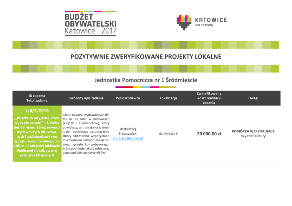 POZYTYWNIE ZWERYFIKOWANE PROJEKTY LOKALNE Jednostka Pomocnicza nr 1 Śródmieście ID zadania Tytuł zadania L/4/1/2016 „Książka to przyjaciel, który nigdy nie zdradzi” – J. Vallee des Barreaux. Zakup nowości wydawniczych (drukowanych i audiobooków) oraz sprzętu komputerowego dla Filii nr 13 Miejskiej Biblioteki Publicznej zlokalizowanej przy ulicy Młyńskiej 5 Skrócony opis zadania Wnioskodawca Zakup nowości wydawniczych dla filii nr 13 MBP w Katowicach (książek i audiobooków), który powiększy, uatrakcyjni oraz urozBartłomiej maici dotychczas zgromadzone Błaszczyński zbiory biblioteczne wypożyczane mieszkańcom Katowic. Zakup no- [email protected] wego sprzętu komputerowego, który podniesie jakość usług oraz usprawni obsługę czytelników. Lokalizacja Zweryfikowany koszt realizacji zadania Uwagi ul. Młyńska 5 20 000,00 zł KOMÓRKA WERYFIKUJĄCA Wydział Kultury L/5/1/2016 Ustawienie stojaków na rowery i słupków w dzielnicy Śródmieście L/6/1/2016 Zakup nowych książek dla Filii Nr 4 Miejskiej Biblioteki Publicznej w Katowicach, przy ul. Poniatowskiego 14 Ustawienie 34 stojaków na rowery i 32 słupków ograniczających nielegalne parkowanie na chodnikach w 14 miejscach na terenie śródmieścia. Stojaki zapewnią możliwość przypięcia roweru w pobliżu miejsca, do którego chcemy dojechać. Słupki zapewnią większe bezpieczeństwo dzięki postawieniu ich w miejscu gdzie parkujące nielegalnie samochody ograniczają widoczność pieszych wchodzących na przejścia. Magdalena Jochemczyk Mjochemczyk @gmail.com 1. Rejon rogu Gliwickiej/Sobieskiego (3 stojaki na rowery) • 2. Rejon rogu Sobieskiego/Zabrskiej (2 stojaki na rowery i 6 słupków) • 3. Rejon rogu Sokolskiej/Zabrskiej (2 stojaki na rowery) • 4. Rejon rogu Sokolskiej/Opolskiej (2 stojaki na rowery) • 5. Rejon Placu Wolności (5 stojaków na rowery) • 6. Rejon rogu Słowackiego/Opolskiej (3 stojaki na rowery i 4 słupki) • 7. Rejon rogu Słowackiego/Chopina (3 stojaki na rowery) • 8. Rejon rogu Francuskiej/Warszawskiej (3 stojaki na rowery) • 9. Rejon rogu Francuskiej/Wojewódzkiej (2 stojaki na rowery) • 10. Rejon rogu Kilińskiego/Stalmacha (2 stojaki na rowery i 4 słupki) • 11. Rejon rogu Skłodowskiej - Curie/Rymera (1 stojak na rowery i 1 słupek) • 12. Rejon rogu PCK/Kościuszki (2 stojaki na rowery i 5 słupków) • 13. Rejon rogu Kopernika/Skłodowskiej – Curie (2 stojaki na rowery i 2 słupki) • 14. Rejon rogu Wojewódzkiej/Lompy (2 stojaki na rowery i 2 słupki). Zakup nowych książek dla Filii nr 4 Miejskiej Biblioteki Publicznej w Katowicach, przy ul. Poniatowskiego 14. Zakup wzbogaci ofertę filii, która pozwoli mieszkańcom w pobliżu swojego domu na korzystanie z większej liczby nowych, interesujących, reprezentujących zróżnicowane upodobania tytułów. Urszula Węgrzyk wegrzyk.urszula @interia.eu Miejska Biblioteka Publiczna Filia nr 4 ul. Poniatowskiego 14 KOMÓRKA WERYFIKUJĄCA Miejski Zarząd Ulic i Mostów 19 600,00 zł 10 000,00 zł • Szacunkowy koszt eksploatacji to 5 000,00 zł/rok. • Szczegółowe usytuowanie stojaków na rowery oraz słupków zostanie ustalone z wnioskodawcą po ewentualnym wyborze zadania do realizacji w glosowaniu mieszkańców. KOMÓRKA WERYFIKUJĄCA Wydział Kultury L/7/1/2016 Uatrakcyjnienie zajęć lekcyjnych pozadydaktycznych i świetlicowych poprzez zakup sprzętu multimedialnego oraz aranżacje wnętrz L/8/1/2016 Budowa miejsc parkingowych wraz z restrukturyzacją trawnika przy Placu Rostka L/9/1/2016 CZYTAM - WYPOŻYCZAM w Filii nr 1 Miejskiej Biblioteki Publicznej przy ulicy Ligonia 7 Celem projektu jest uatrakcyjnienie zajęć lekcyjnych pozadydaktycznych i świetlicowych poprzez aranżację wnętrz oraz zakup sprzętu multimedialnego spełniającego wymogi współczesnej Katarzyna Dziech oświaty na miarę XXI wieku. 721 165 757 Chcemy dokonać wymiany w pra690 340 366 cowni komputerowej wyeksploapalagat towanego sprzętu [email protected] wego na nowy, wysokiej jakości, zakupić sprzęt komputerowy Szkoła Podstawowa i projektory multimedialne do sal nr 15 im. Jana Pawła II, ul. Ks. Bpa St. świetlicowych oraz sal lekcyjnych Adamskiego 24 nauczania zintegrowanego. Zakup nowych mebli do sal świetlicowych oraz sal zabaw pozwoli dzieciom w sposób atrakcyjny i ciekawy spędzać czas oczekiwania na rodziców. Szkoła Podstawowa nr 15 im. Jana Pawła II ul. Ks. Bpa St. Adamskiego 24 99 999,00 zł KOMÓRKA WERYFIKUJĄCA Wydział Edukacji Budowa miejsc parkingowych na nieużywanym przez pieszych chodniku wraz z restrukturyzacją przylegającego trawnika na skwerze. Po rozbiórce chodnika, na wyrównanym terenie zbudowana zostanie nawierzchnia parkingu z kostki brukowej. Przyległy trawnik na skwerze należy obsiać trawą odporną na deptanie i utworzyć utwardzone przejście przez skwer. Danuta Ożarowska danutaozarowska @gmail.com Plac Rostka 55 385,00 zł KOMÓRKA WERYFIKUJĄCA Miejski Zarząd Ulic i Mostów Dofinansowanie Biblioteki – Filii nr 1 z Oddziałem Książki Mówionej przy ul. Ligonia 7. Zakup nowości książkowych, audiobooków, sprzętu komputerowego, wyposażenia promocyjnego Filii. Ingeborga Greiner-Otręba [email protected] Miejska Biblioteka Publiczna Filia nr 1 z Oddziałem Książki Mówionej ul. Ligonia 7 18 000,00 zł KOMÓRKA WERYFIKUJĄCA Wydział Kultury L/10/1/2016 Słoneczna Biblioteka Jedynki – modernizacja wypożyczalni i sali audiowizualnej L/11/1/2016 Zielone okolice ul. Mikołowskiej Projekt „Słoneczna Biblioteka Jedynki” – ma na celu polepszenie warunków korzystania przez uczniów, rodziców, nauczycieli i wszystkich pracowników szkoły z biblioteki szkolnej poprzez podwyższenie standardów estetycznych oraz modernizację wyposażenia sali audiowizualnej i wypożyczalni. Program zakłada odmalowanie pomieszczeń oraz zakup regałów na książki, siedzisk do czytania, stolików i krzeseł oraz tablicy multimedialnej i sprzętu audiowizualnego (odtwarz