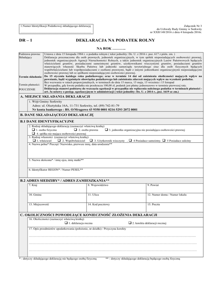 1.Numer Identyfikacji Podatkowej składającego deklarację Załącznik Nr 3 do Uchwały Rady Gminy w Sorkwity nr XXII/148/2016 z dnia 4 listopada 2016r. ............................................................................................... DR – 1 DEKLARACJA NA PODATEK ROLNY NA ROK ……….. Podstawa prawna: Składający Ustawa z dnia 15 listopada 1984 r. o podatku rolnym ( tekst jednolity: Dz. U. z 2016 r. poz. 617 z późn. zm. ) Deklaracja przeznaczona dla osób prawnych, jednostek organizacyjnych, w tym spółek nieposiadających osobowości prawnej, jednostek organizacyjnych Agencji Nieruchomości Rolnych, a także jednostek organizacyjnych Lasów Państwowych będących właścicielami gruntów, posiadaczami samoistnymi gruntów, użytkownikami wieczystymi gruntów, posiadaczami gruntów stanowiących własność Skarbu Państwa lub jednostki samorządu terytorialnego oraz dla osób fizycznych będących współwłaścicielami lub współposiadaczami z osobami prawnymi, bądź z innymi jednostkami organizacyjnymi nieposiadającymi osobowości prawnej lub ze spółkami nieposiadającymi osobowości prawnej. Termin składania: Do 15 stycznia każdego roku podatkowego; oraz w terminie 14 dni od zaistnienia okoliczności mających wpływ na powstanie, bądź wygaśnięcie obowiązku podatkowego lub zaistnienia zdarzeń mających wpływ na wysokość podatku. Bez wezwania w ratach proporcjonalnych, w terminach do dnia 15 marca, 15 maja, 15 września i 15 listopad Termin płatności: W przypadku, gdy kwota podatku nie przekracza 100,00 zł, podatek jest płatny jednorazowo w terminie pierwszej raty. Deklaracja stanowi podstawę do wszczęcia egzekucji w przypadku nie wpłacenia należnego podatku w terminach płatności POUCZENIE art. 3a ustawy o postęp. egzekucyjnym w administracji ( tekst jednolity: Dz. U. z 2014 r., poz. 1619 ze zm.) A. MIEJSCE SKŁADANIA DEKLARACJI 1. Wójt Gminy Sorkwity Adres: ul. Olsztyńska 16A, 11-731 Sorkwity, tel. (89) 742-81-79 Nr konta bankowego : BS. O/Mrągowo 43 9350 0001 0216 5293 2072 0001 B. DANE SKŁADAJĄCEGO DEKLARACJĘ B.1 DANE IDENTYFIKACYJNE 2. Rodzaj składającego deklarację (zaznaczyć właściwą kratkę) 1. osoba fizyczna 2. osoba prawna 3. jednostka organizacyjna nie posiadająca osobowości prawnej 4. spółka nie mająca osobowości prawnej 3. Rodzaj własności (zaznaczyć właściwą kratkę) 1. właściciel 2. Współwłaściciel 3. Użytkownik wieczysty . 4 Posiadacz samoistny. 5 Posiadacz zależny 4. Nazwa pełna* Pieczęć/ Nazwisko, pierwsze imię, data urodzenia** 5. Nazwa skrócona* / imię ojca, imię matki** 6. Identyfikator REGON* / Numer PESEL** B.2 ADRES SIEDZIBY* / ADRES ZAMIESZKANIA** 7. Kraj 8. Województwo 9. Powiat 10. Gmina 11. Ulica 12. Numer domu / Numer lokalu 13. Miejscowość 14. Kod pocztowy 15. Poczta C. OKOLICZNOŚCI POWODUJĄCE KONIECZNOŚĆ ZŁOŻENIA DEKLARACJI 16. Okoliczności (zaznaczyć właściwą kratkę) 1. deklaracja roczna 2. korekta deklaracji rocznej 17. Opis przedmiotów opodatkowania (położenie, nr działki) / Przyczyna korekty …………………………………………………………………………………………………………………………………………………… ……………………………………………………………………………………………………………………………………………………. ……………………………………………………………………………………………………………………………………………………. * - dotyczy składającego deklarację nie będącego osobą fizyczną ** - dotyczy składającego deklarację będącego osobą fizyczną D. DANE DOTYCZĄCE PRZEDMIOTÓW OPODATKOWANIA Klasy użytków Powierzchnia gruntu w hektarach wynikające fizycznych z ewidencji gruntów Przelicznik (z wyłączeniem gruntów zwolnionych z opodatkowania) Liczba ha przeliczeniowych Liczba miesięcy Stawka z 1 ha opodatkowania (przeliczeniowego np. 1/12, 3/12, lub fizycznego) 12/12. w zł,gr Grunty orne I 1,80 II 1,65 IIIa 1,50 IIIb 1,25 IVa 1 IVb 0,75 V 0,30 VI 0,15 Sady I 1,80 II 1,65 IIIa 1,50 IIIb 1,25 IVa 1,00 IVb 0,75 V 0,30 VI 0,15 Użytki zielone I 1,60 II 1,35 III 1,15 IV 0,70 V 0,20 VI 0,15 Grunty rolne bez względu na klasę zabudowane 1 zadrzewione i zakrzewione 0,2 Rowy 0,2 Grunty pod stawami Zarybionymi łososiem, trocią, głowacicą, palią i pstrągiem zarybione innymi gatunkami ryb, oraz pod stawami niezarybionymi Razem ( bez zwolnień) 1 0,2 Wymiar podatku rolnego w zł,gr E. INNE ZWOLNIENIA W PODATKU ROLNYM OD GRUNTÓW (podać rodzaj, klasę, pow .gruntów, nr działki oraz przepis prawa z jakiego tytułu występuje zwolnienie) 1. 2. 3. Razem F. ULGI W PODATKU ROLNYM OD GRUNTÓW 1. z tytułu nabycia lub objęcia w zagospodarowanie gruntów 2. inwestycyjne 3. górskie 4. inne Razem G. ŁĄCZNA KWOTA PODATKU Kwota podatku (kwotę deklarowanego podatku należy zaokrąglić do pełnych złotych) Różnica kwot z D – (E + F) H. OŚWIADCZENIE I PODPIS SKŁADAJĄCEGO / OSOBY REPREZENTUJĄCEJ SKŁADAJĄCEGO Oświadczam, że podane przeze mnie dane są zgodne z prawdą. Imię, nazwisko osoby odpowiedzialnej za prawidłowe obliczenie podatku, nr telefonu Podpis (pieczęć) głównego księgowego Data wypełnienia (dzień - miesiąc - rok) Podpis (pieczęć) składającego / osoby reprezentującej składającego I. ADNOTACJE ORGANU PODATKOWEGO Uwagi organu podatkowego Identyfikator przyjmującego formularz Podpis przyjmującego formularz