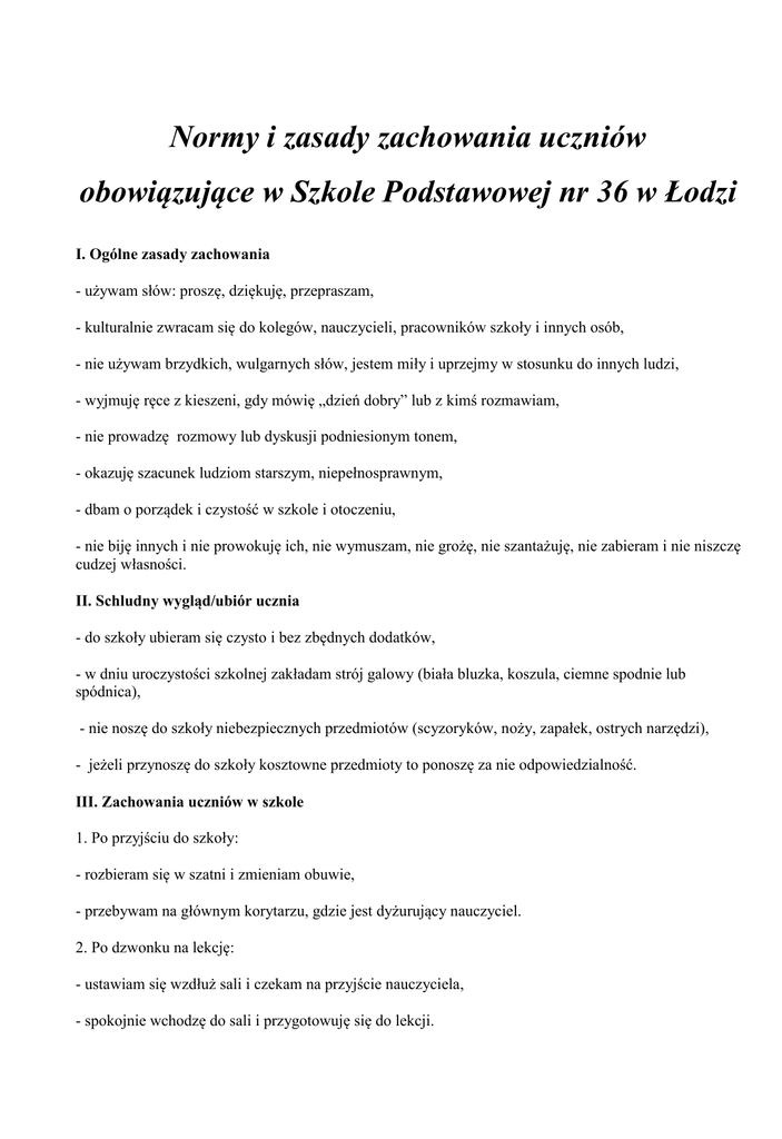 Normy i zasady zachowania uczniów obowiązujące w Szkole Podstawowej nr 36 w Łodzi I. Ogólne zasady zachowania - używam słów: proszę, dziękuję, przepraszam, - kulturalnie zwracam się do kolegów, nauczycieli, pracowników szkoły i innych osób, - nie używam brzydkich, wulgarnych słów, jestem miły i uprzejmy w stosunku do innych ludzi, - wyjmuję ręce z kieszeni, gdy mówię „dzień dobry” lub z kimś rozmawiam, - nie prowadzę rozmowy lub dyskusji podniesionym tonem, - okazuję szacunek ludziom starszym, niepełnosprawnym, - dbam o porządek i czystość w szkole i otoczeniu, - nie biję innych i nie prowokuję ich, nie wymuszam, nie grożę, nie szantażuję, nie zabieram i nie niszczę cudzej własności. II. Schludny wygląd/ubiór ucznia - do szkoły ubieram się czysto i bez zbędnych dodatków, - w dniu uroczystości szkolnej zakładam strój galowy (biała bluzka, koszula, ciemne spodnie lub spódnica), - nie noszę do szkoły niebezpiecznych przedmiotów (scyzoryków, noży, zapałek, ostrych narzędzi), - jeżeli przynoszę do szkoły kosztowne przedmioty to ponoszę za nie odpowiedzialność. III. Zachowania uczniów w szkole 1. Po przyjściu do szkoły: - rozbieram się w szatni i zmieniam obuwie, - przebywam na głównym korytarzu, gdzie jest dyżurujący nauczyciel. 2. Po dzwonku na lekcję: - ustawiam się wzdłuż sali i czekam na przyjście nauczyciela, - spokojnie wchodzę do sali i przygotowuję się do lekcji. 3. W czasie lekcji: - uważam, wykonuję polecenia nauczyciela i nie rozmawiam, - biorę aktywny udział w lekcji, - przez podniesienie ręki sygnalizuję chęć odpowiadania lub zapytania, -nie przerywam, gdy mówi ktoś inny, - do łazienki wychodzę tylko wtedy, kiedy to jest naprawdę konieczne (potrzebę wyjścia zgłaszam nauczycielowi), - jeżeli źle się czuję, zgłaszam to nauczycielowi, - nie jem, nie piję napojów i nie żuję gumy podczas zajęć, - pamiętam o tym, że lekcję zawsze kończy nauczyciel (nie pakuję się i nie wychodzę z klasy bez wyraźnego sygnału z jego strony). 4. W czasie przerwy: - nie biegam, nie stwarzam zagrożenia dla siebie i innych, - na boisku i przed szkołą mogę przebywać w wyznaczonym okresie, gdy jest obecny nauczyciel dyżurujący, - zgodnie z przeznaczeniem korzystam z toalety, - nie uczestniczę, ani nie inspiruję lekkomyślnych zabaw, które mogą zagrażać mojemu zdrowiu lub innych osób, - nie opuszczam budynku szkoły (poza wyznaczonymi okresami) ani terenu szkoły, - ze wszystkimi sprawami zwracam się do nauczycieli dyżurujących, - unikam hałaśliwego zachowania, - nie biegnę na stołówkę szkolną w czasie przerw obiadowych, - z telefonu komórkowego mogę skorzystać jedynie za zgodą nauczyciela w wyznaczonym przez niego miejscu. 5. Po skończonych lekcjach: - spokojnie schodzę do szatni pod opieką nauczyciela (ubieram się, zmieniam obuwie), - nie wdaję się w żadne bójki i przepychanki, - nie oddalam się z osobami nieznajomymi i nie biorę od nich żadnych produktów. IV. Staram się być koleżeński - nie ujawniam powierzonych mi tajemnic (chyba, że tajemnice te zagrażałyby bezpieczeństwu ucznia lub innych osób), - pomagam w nauce słabszym, - służę pomocą, gdy kolega jej potrzebuje (np. w czasie choroby lub trudnych sytuacjach losowych), - nie umieszczam obraźliwych tekstów, zdjęć lub opinii w Internecie, - nie wyśmiewam się z innych dzieci i ich nie obgaduję, - nie dyskutuję na temat rodziców kolegów. V. Jestem prawdomówny i odpowiedzialny - ponoszę odpowiedzialność za siebie i swoje czyny, - przyznaję się do swojej winy, jestem prawdomówny, - obiektywnie oceniam konfliktowe sytuacje, - o niebezpiecznych zdarzeniach natychmiast informuję nauczyciela lub inne dorosłe osoby, - nie oskarżam innych, - nie wyłudzam pieniędzy i nie przywłaszczam sobie żadnych cudzych rzeczy, - dotrzymuję ustalonych terminów (zwrot książek, sprzętu sportowego, sprawdzianów, usprawiedliwień), - jestem punktualny, szanuję czas i pracę własną i innych, - nie chodzę na wagary. VI. W czasie uroczystości, imprez i akcji szkolnych - zawsze zachowuję się kulturalnie i taktownie, - godnie reprezentuję szkołę, - podczas śpiewania hymnu szkoły lub hymnu państwowego stoję w pozycji „baczność”, - kulturalnie zachowuję się w środkach komunikacji miejskiej, nie zakłócając spokoju innym podróżnym - ubieram się stosownie do sytuacji. VII. Staram się pracować nad własnym charakterem i postępować zgodnie z przyjętymi normami VIII. Przestrzeganie i stosowanie się do norm może być nagradzane, a nie przestrzeganie karane (nagrody i kary wymierza nauczyciel, wychowawca klasy, Dyrektor Szkoły)
