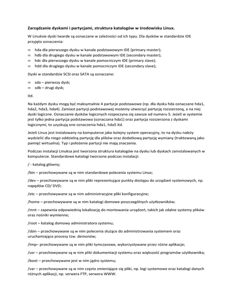 Zarządzanie dyskami i partycjami, struktura katalogów w środowisku Linux. W Linuksie dyski twarde są oznaczane w zależności od ich typu. Dla dysków w standardzie IDE przyjęto oznaczenia: • • • • hda dla pierwszego dysku w kanale podstawowym IDE (primary master); hdb dla drugiego dysku w kanale podstawowym IDE (secondary master); hdc dla pierwszego dysku w kanale pomocniczym IDE (primary slave); hdd dla drugiego dysku w kanale pomocniczym IDE (secondary slave); Dyski w standardzie SCSI oraz SATA są oznaczane: • • sda – pierwszy dysk; sdb – drugi dysk; itd. Na każdym dysku mogą być maksymalnie 4 partycje podstawowe (np. dla dysku hda oznaczane hda1, hda2, hda3, hda4). Zamiast partycji podstawowej możemy utworzyć partycję rozszerzoną, a na niej dyski logiczne. Oznaczanie dysków logicznych rozpoczyna się zawsze od numeru 5. Jeżeli w systemie jest tylko jedna partycja podstawowa (oznaczana hda1) oraz partycja rozszerzona z dyskami logicznymi, to uzyskują one oznaczenia hda1, hda5 itd. Jeżeli Linux jest instalowany na komputerze jako kolejny system operacyjny, to na dysku należy wydzielić dla niego oddzielną partycję dla plików oraz dodatkową partycję wymiany (traktowaną jako pamięć wirtualna). Typ i położenie partycji nie mają znaczenia. Podczas instalacji Linuksa jest tworzona struktura katalogów na dysku lub dyskach zainstalowanych w komputerze. Standardowe katalogi tworzone podczas instalacji: / - katalog główny; /bin – przechowywane są w nim standardowe polecenia systemu Linux; /dev – przechowywane są w nim pliki reprezentujące punkty dostępu do urządzeń systemowych, np. napędów CD/ DVD; /etc – przechowywane są w nim administracyjne pliki konfiguracyjne; /home – przechowywane są w nim katalogi domowe poszczególnych użytkowników; /mnt – zapewnia odpowiednią lokalizację do montowania urządzeń, takich jak zdalne systemy plików oraz nośniki wymienne; /root – katalog domowy administratora systemu; /sbin – przechowywane są w nim polecenia służące do administrowania systemem oraz uruchamiające procesy tzw. demonów; /tmp– przechowywane są w nim pliki tymczasowe, wykorzystywane przez różne aplikacje; /usr – przechowywane są w nim pliki dokumentacji systemu oraz większość programów użytkownika; /boot – przechowywane jest w nim jądro systemu; /var – przechowywane są w nim często zmieniające się pliki, np. logi systemowe oraz katalogi danych różnych aplikacji, np. serwera FTP, serwera WWW. System plików w Linuksie możemy traktować jak pojedyncze drzewo. Jeżeli dołączymy do systemu plików jakiś dodatkowy nośnik danych, np. pamięć flash, to system plików tego urządzenia zostanie doczepiony do systemu głównego. Miejsce doczepienia jest nazywane punktem montowania. Jako punkt montowania można wybrać dowolny katalog w głównym systemie plików (jeżeli w katalog są dane, to zostaną one przesłonięte przez zawartość nośnika). Zwykle do montowania nośników używa się katalogów /mnt i /media.