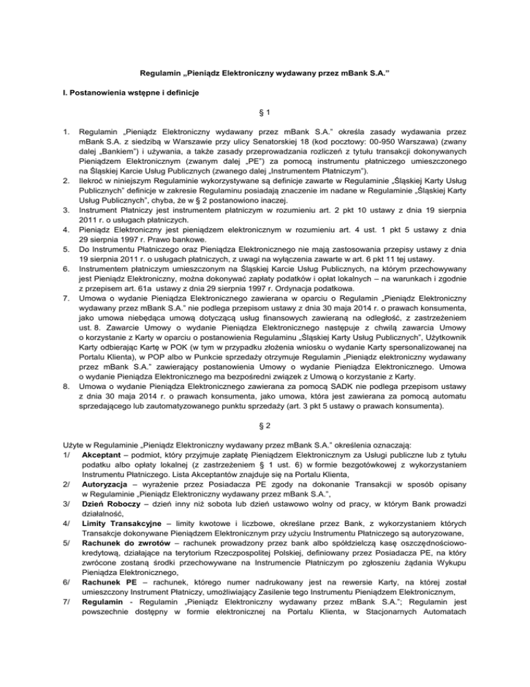 Regulamin „Pieniądz Elektroniczny wydawany przez mBank S.A.” I. Postanowienia wstępne i definicje §1 1. 2. 3. 4. 5. 6. 7. 8. Regulamin „Pieniądz Elektroniczny wydawany przez mBank S.A.” określa zasady wydawania przez mBank S.A. z siedzibą w Warszawie przy ulicy Senatorskiej 18 (kod pocztowy: 00-950 Warszawa) (zwany dalej „Bankiem”) i używania, a także zasady przeprowadzania rozliczeń z tytułu transakcji dokonywanych Pieniądzem Elektronicznym (zwanym dalej „PE”) za pomocą instrumentu płatniczego umieszczonego na Śląskiej Karcie Usług Publicznych (zwanego dalej „Instrumentem Płatniczym”). Ilekroć w niniejszym Regulaminie wykorzystywane są definicje zawarte w Regulaminie „Śląskiej Karty Usług Publicznych” definicje w zakresie Regulaminu posiadają znaczenie im nadane w Regulaminie „Śląskiej Karty Usług Publicznych”, chyba, że w § 2 postanowiono inaczej. Instrument Płatniczy jest instrumentem płatniczym w rozumieniu art. 2 pkt 10 ustawy z dnia 19 sierpnia 2011 r. o usługach płatniczych. Pieniądz Elektroniczny jest pieniądzem elektronicznym w rozumieniu art. 4 ust. 1 pkt 5 ustawy z dnia 29 sierpnia 1997 r. Prawo bankowe. Do Instrumentu Płatniczego oraz Pieniądza Elektronicznego nie mają zastosowania przepisy ustawy z dnia 19 sierpnia 2011 r. o usługach płatniczych, z uwagi na wyłączenia zawarte w art. 6 pkt 11 tej ustawy. Instrumentem płatniczym umieszczonym na Śląskiej Karcie Usług Publicznych, na którym przechowywany jest Pieniądz Elektroniczny, można dokonywać zapłaty podatków i opłat lokalnych – na warunkach i zgodnie z przepisem art. 61a ustawy z dnia 29 sierpnia 1997 r. Ordynacja podatkowa. Umowa o wydanie Pieniądza Elektronicznego zawierana w oparciu o Regulamin „Pieniądz Elektroniczny wydawany przez mBank S.A.” nie podlega przepisom ustawy z dnia 30 maja 2014 r. o prawach konsumenta, jako umowa niebędąca umową dotyczącą usług finansowych zawieraną na odległość, z zastrzeżeniem ust. 8. Zawarcie Umowy o wydanie Pieniądza Elektronicznego następuje z chwilą zawarcia Umowy o korzystanie z Karty w oparciu o postanowienia Regulaminu „Śląskiej Karty Usług Publicznych”, Użytkownik Karty odbierając Kartę w POK (w tym w przypadku złożenia wniosku o wydanie Karty spersonalizowanej na Portalu Klienta), w POP albo w Punkcie sprzedaży otrzymuje Regulamin „Pieniądz elektroniczny wydawany przez mBank S.A.” zawierający postanowienia Umowy o wydanie Pieniądza Elektronicznego. Umowa o wydanie Pieniądza Elektronicznego ma bezpośredni związek z Umową o korzystanie z Karty. Umowa o wydanie Pieniądza Elektronicznego zawierana za pomocą SADK nie podlega przepisom ustawy z dnia 30 maja 2014 r. o prawach konsumenta, jako umowa, która jest zawierana za pomocą automatu sprzedającego lub zautomatyzowanego punktu sprzedaży (art. 3 pkt 5 ustawy o prawach konsumenta). §2 Użyte w Regulaminie „Pieniądz Elektroniczny wydawany przez mBank S.A.” określenia oznaczają: 1/ Akceptant – podmiot, który przyjmuje zapłatę Pieniądzem Elektronicznym za Usługi publiczne lub z tytułu podatku albo opłaty lokalnej (z zastrzeżeniem § 1 ust. 6) w formie bezgotówkowej z wykorzystaniem Instrumentu Płatniczego. Lista Akceptantów znajduje się na Portalu Klienta, 2/ Autoryzacja – wyrażenie przez Posiadacza PE zgody na dokonanie Transakcji w sposób opisany w Regulaminie „Pieniądz Elektroniczny wydawany przez mBank S.A.”, 3/ Dzień Roboczy – dzień inny niż sobota lub dzień ustawowo wolny od pracy, w którym Bank prowadzi działalność, 4/ Limity Transakcyjne – limity kwotowe i liczbowe, określane przez Bank, z wykorzystaniem których Transakcje dokonywane Pieniądzem Elektronicznym przy użyciu Instrumentu Płatniczego są autoryzowane, 5/ Rachunek do zwrotów – rachunek prowadzony przez bank albo spółdzielczą kasę oszczędnościowokredytową, działające na terytorium Rzeczpospolitej Polskiej, definiowany przez Posiadacza PE, na który zwrócone zostaną środki przechowywane na Instrumencie Płatniczym po zgłoszeniu żądania Wykupu Pieniądza Elektronicznego, 6/ Rachunek PE – rachunek, którego numer nadrukowany jest na rewersie Karty, na której został umieszczony Instrument Płatniczy, umożliwiający Zasilenie tego Instrumentu Pieniądzem Elektronicznym, 7/ Regulamin - Regulamin „Pieniądz Elektroniczny wydawany przez mBank S.A.”; Regulamin jest powszechnie dostępny w formie elektronicznej na Portalu Klienta, w Stacjonarnych Automatach 8/ 9/ 10/ 11/ 12/ 13/ 14/ 15/ Doładowania Kart oraz w formie papierowej w POK i POP. Wraz z Regulaminem „Pieniądz Elektroniczny wydawany przez mBank S.A.” dostępny jest Regulamin „Śląska Karta Usług Publicznych”, Saldo Dostępnych Środków – kwotę środków przechowywanych na Rachunku PE, do wysokości, której możliwe jest dokonywanie Transakcji, z zastrzeżeniem obowiązujących Limitów Transakcyjnych, Terminal – elektroniczny terminal płatniczy umieszczony w miejscu wchodzącym w skład Sieci Akceptacji ŚKUP, umożliwiający Posiadaczowi PE dokonywanie Transakcji, Transakcja – płatność bezgotówkową Pieniądzem Elektronicznym za Usługi publiczne lub z tytułu podatku albo opłaty lokalnej (z zastrzeżeniem § 1 ust. 6) dokonaną przy użyciu PE, realizowaną poprzez zbliżenie Instrumentu Płatniczego do czytnika w Terminalu umożliwiającym dokonanie takiej płatności, Umowa – umowę o wydanie Pieniądza Elektronicznego zawieraną w oparciu o Regulamin w momencie zawarcia Umowy o korzystanie z Karty i obowiązującą maksymalnie do terminu upływu ważności Karty (a tym samym do upływu terminu ważności Instrumentu Płatniczego). Okres obowiązywania Umowy nie może zostać przedłużony. Rozwiązanie Umowy o korzystanie z Karty powoduje Zastrzeżenie Instrumentu Płatniczego i rozwiązanie umowy o wydanie Pieniądza Elektronicznego. Umowa o wydanie Pieniądza Elektronicznego zawie