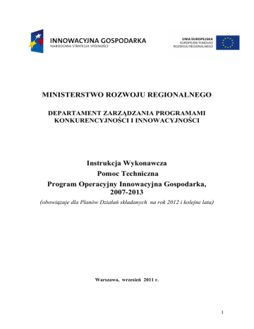 PRojet MINISTERSTWO ROZWOJU REGIONALNEGO DEPARTAMENT ZARZĄDZANIA PROGRAMAMI KONKURENCYJNOŚCI I INNOWACYJNOŚCI Instrukcja Wykonawcza Pomoc Techniczna Program Operacyjny Innowacyjna Gospodarka, 2007-2013 (obowiązuje dla Planów Działań składanych na rok 2012 i kolejne lata) Warszawa, wrzesień 2011 r. 1 Spis treści Spis treści .................................................................................................................................. 2 Używane skróty......................................................................................................................... 3 Słowniczek ................................................................................................................................ 4 1. Informacje wstępne ............................................................................................................... 6 2. Wnioskowanie do pomocy technicznej PO IG ..................................................................... 6 2.1 Zasady kwalifikowalności operacji i wydatków w ramach PT PO IG ............................... 8 2.1.1 Wydatki niekwalifikowane ............................................................................................ 10 2.1.2 Działanie 9.1 Wsparcie zarządzania............................................................................... 12 2.1.2.1. Finansowanie kosztów podnoszenia kwalifikacji zawodowych ................................ 13 2.1.2.2 Finansowanie kosztów administracyjnych spotkań, konferencji, seminariów/warsztatów oraz szkoleń............................................................................................................................. 15 2.1.2.3 Finansowanie kosztów zatrudnienia............................................................................ 17 2.1.3 Działanie 9.2 Wyposażenie instytucji ............................................................................ 19 2.1.3.1 Zasady rozliczania wydatków ponoszonych w ramach działania 9.2 kwalifikowalnych w całości lub częściowo .......................................................................................................... 20 2.1.3.2 Szczegółowe zasady kwalifikowania i rozliczania wydatków za usługi telekomunikacyjne i internet ................................................................................................... 21 2.1.3.3 Szczegółowe zasady kwalifikowania wydatków związanych z najmem, eksploatacją i remontem pomieszczeń biurowych ......................................................................................... 22 2.1.4 Działanie 9.3 Informacja i promocja.............................................................................. 22 2.1.5 Działanie 9.4 Ewaluacja ................................................................................................. 23 2.2 Tryb składania i zatwierdzania Planów Działań (wniosków o dofinansowanie) ............. 24 2.3 Lista wskaźników dla Priorytetu Pomoc Techniczna PO IG ............................................ 27 3. Tryb sprawozdawczości i rozliczania wniosków o płatność............................................... 36 2 Używane skróty DKI – Departament Zarządzania Programami Konkurencyjności i Innowacyjności w Ministerstwie Rozwoju Regionalnego GR – Grupy Robocze powoływane przez Instytucję Zarządzającą lub inne instytucje zaangażowane we wdrażanie PO IG EFRR – Europejski Fundusz Rozwoju Regionalnego IK NSRO – Instytucja Koordynująca Narodowe Strategiczne Ramy Odniesienia IP – Instytucja Pośrednicząca IW – Instytucja Pośrednicząca II stopnia/Instytucja Wdrażająca IZ PO IG/IZ – Instytucja Zarządzająca Programem Operacyjnym Innowacyjna Gospodarka KM PO IG – Komitet Monitorujący Program Operacyjny Innowacyjna Gospodarka PD – Plan Działań PO – Programy Operacyjne PO IG – Program Operacyjny Innowacyjna Gospodarka PO PT – Program Operacyjny Pomoc Techniczna 2007-2013 POT – Polska Organizacja Turystyczna PT PO IG – Pomoc Techniczna Programu Operacyjnego Innowacyjna Gospodarka SPO-WKP 2004-2006 – Sektorowy Program Operacyjny Wzrost Konkurencyjności Przedsiębiorstw na lata 2004-2006 Uszczegółowienie PO IG – Szczegółowy opis priorytetów Programu Operacyjnego Innowacyjna Gospodarka WB – Wydział Budżetu (w Departamencie Zarządzania Programami Konkurencyjności i Innowacyjności) WPT – Wydział Pomocy Technicznej (w Departamencie Zarządzania Programami Konkurencyjności i Innowacyjności) 3 Słowniczek Decyzja o przyznaniu dofinansowania – decyzja na podstawie której zostaje przyznane dofinansowanie ze środków pomocy technicznej PO IG, określająca prawa i obowiązku wnioskodawcy wynikające z uzyskanego dofinansowania projektu z pomocy technicznej PO IG. Decyzja obowiązuje IZ oraz MG w przypadku przyznawania dofinansowania komórce organizacyjnej w MG pełniącej funkcję IW (DPO), zwana „decyzją o dofinansowaniu”; Plan Działań – dokument przygotowywany przez IZ, IP, IW na realizację własnych projektów na wzorze opracowanym przez IZ, na który składa się część zasadnicza (formularz Planu Działań; inaczej wniosek o dofinansowanie Projektu) oraz wymagane załączniki; Projekt – należy przez to rozumieć przedsięwzięcia określone w Planie Działań i załącznikach, realizowane przez beneficjenta pomocy technicznej PO IG; Sprawozdanie z realizacji projektu – część wniosku o płatność dotycząca postępu rzeczowo-finansowego projektu; Porozumienie o dofinansowanie projektu – porozumienie zawarte pomiędzy instytucjami występującymi w systemie wdrażania PO IG w przypadku, gdy instytucja otrzymująca dofinansowanie jest państwową jednostką budżetową oraz porozumienie zawierane pomiędzy IZ a IP na podstawie którego zostaje przyznane dofinansowanie ze środków pomocy technicznej PO IG, porozumienie określa prawa i obowiązki wnioskodawcy wynikające z uzyskanego dofinansowania pr