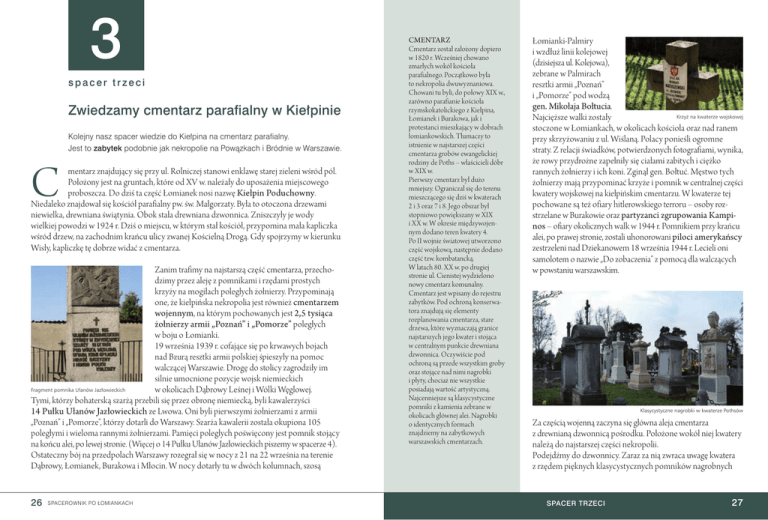 3 spacer trzeci Zwiedzamy cmentarz parafialny w Kiełpinie Kolejny nasz spacer wiedzie do Kiełpina na cmentarz parafialny. Jest to zabytek podobnie jak nekropolie na Powązkach i Bródnie w Warszawie. C mentarz znajdujący się przy ul. Rolniczej stanowi enklawę starej zieleni wśród pól. Położony jest na gruntach, które od XV w. należały do uposażenia miejscowego proboszcza. Do dziś ta część Łomianek nosi nazwę Kiełpin Poduchowny. Niedaleko znajdował się kościół parafialny pw. św. Małgorzaty. Była to otoczona drzewami niewielka, drewniana świątynia. Obok stała drewniana dzwonnica. Zniszczyły je wody wielkiej powodzi w 1924 r. Dziś o miejscu, w którym stał kościół, przypomina mała kapliczka wśród drzew, na zachodnim krańcu ulicy zwanej Kościelną Drogą. Gdy spojrzymy w kierunku Wisły, kapliczkę tę dobrze widać z cmentarza. Zanim trafimy na najstarszą część cmentarza, przechodzimy przez aleję z pomnikami i rzędami prostych krzyży na mogiłach poległych żołnierzy. Przypominają one, że kiełpińska nekropolia jest również cmentarzem wojennym, na którym pochowanych jest 2,5 tysiąca żołnierzy armii „Poznań” i „Pomorze” poległych w boju o Łomianki. 19 września 1939 r. cofające się po krwawych bojach nad Bzurą resztki armii polskiej śpieszyły na pomoc walczącej Warszawie. Drogę do stolicy zagrodziły im silnie umocnione pozycje wojsk niemieckich Fragment pomnika Ułanów Jazłowieckich w okolicach Dąbrowy Leśnej i Wólki Węglowej. Tymi, którzy bohaterską szarżą przebili się przez obronę niemiecką, byli kawalerzyści 14 Pułku Ułanów Jazłowieckich ze Lwowa. Oni byli pierwszymi żołnierzami z armii „Poznań” i „Pomorze”, którzy dotarli do Warszawy. Szarża kawalerii została okupiona 105 poległymi i wieloma rannymi żołnierzami. Pamięci poległych poświęcony jest pomnik stojący na końcu alei, po lewej stronie. (Więcej o 14 Pułku Ułanów Jazłowieckich piszemy w spacerze 4). Ostateczny bój na przedpolach Warszawy rozegrał się w nocy z 21 na 22 września na terenie Dąbrowy, Łomianek, Burakowa i Młocin. W nocy dotarły tu w dwóch kolumnach, szosą 26 SPACEROWNIK PO ŁOMIANKACH CMENTARZ Cmentarz został założony dopiero w 1820 r. Wcześniej chowano zmarłych wokół kościoła parafialnego. Początkowo była to nekropolia dwuwyznaniowa. Chowani tu byli, do połowy XIX w., zarówno parafianie kościoła rzymskokatolickiego z Kiełpina, Łomianek i Burakowa, jak i protestanci mieszkający w dobrach łomiankowskich. Tłumaczy to istnienie w najstarszej części cmentarza grobów ewangelickiej rodziny de Poths – właścicieli dóbr w XIX w. Pierwszy cmentarz był dużo mniejszy. Ograniczał się do terenu mieszczącego się dziś w kwaterach 2 i 3 oraz 7 i 8. Jego obszar był stopniowo powiększany w XIX i XX w. W okresie międzywojennym dodano teren kwatery 4. Po II wojnie światowej utworzono część wojskową, następnie dodano część tzw. kombatancką. W latach 80. XX w. po drugiej stronie ul. Cienistej wydzielono nowy cmentarz komunalny. Cmentarz jest wpisany do rejestru zabytków. Pod ochroną konserwatora znajdują się elementy rozplanowania cmentarza, stare drzewa, które wyznaczają granice najstarszych jego kwater i stojąca w centralnym punkcie drewniana dzwonnica. Oczywiście pod ochroną są przede wszystkim groby oraz stojące nad nimi nagrobki i płyty, chociaż nie wszystkie posiadają wartość artystyczną. Najcenniejsze są klasycystyczne pomniki z kamienia zebrane w okolicach głównej alei. Nagrobki o identycznych formach znajdziemy na zabytkowych warszawskich cmentarzach. Łomianki-Palmiry i wzdłuż linii kolejowej (dzisiejsza ul. Kolejowa), zebrane w Palmirach resztki armii „Poznań” i „Pomorze” pod wodzą gen. Mikołaja Bołtucia. Krzyż na kwaterze wojskowej Najcięższe walki zostały stoczone w Łomiankach, w okolicach kościoła oraz nad ranem przy skrzyżowaniu z ul. Wiślaną. Polacy ponieśli ogromne straty. Z relacji świadków, potwierdzonych fotografiami, wynika, że rowy przydrożne zapełniły się ciałami zabitych i ciężko rannych żołnierzy i ich koni. Zginął gen. Bołtuć. Męstwo tych żołnierzy mają przypominać krzyże i pomnik w centralnej części kwatery wojskowej na kiełpińskim cmentarzu. W kwaterze tej pochowane są też ofiary hitlerowskiego terroru – osoby rozstrzelane w Burakowie oraz partyzanci zgrupowania Kampinos – ofiary okolicznych walk w 1944 r. Pomnikiem przy krańcu alei, po prawej stronie, zostali uhonorowani piloci amerykańscy zestrzeleni nad Dziekanowem 18 września 1944 r. Lecieli oni samolotem o nazwie „Do zobaczenia” z pomocą dla walczących w powstaniu warszawskim. Klasycystyczne nagrobki w kwaterze Pothsów Za częścią wojenną zaczyna się główna aleja cmentarza z drewnianą dzwonnicą pośrodku. Położone wokół niej kwatery należą do najstarszej części nekropolii. Podejdźmy do dzwonnicy. Zaraz za nią zwraca uwagę kwatera z rzędem pięknych klasycystycznych pomników nagrobnych SPACER TRZECI 27 wykutych w piaskowcu. Pomniki są po konserwacji, napisy dają się bez trudu odczytać. Jest to kwatera rodziny Pothsów, właścicieli Młocin i Łomianek w XIX w., o którą dbają mieszkający w Łomiankach potomkowie. Przyjrzyjmy się symbolice pomników, która wraz z inskrypcjami przybliża nam postacie zmarłych z tej rodziny. Pierwsza spoczęła tu w 1831 r. Elżbieta z Heigelinów Poths, żona Henryka. Jej kamienny nagrobek, ozdobiony tylko symbolami śmierci – czaszką spoczywającą na skrzyżowanych piszczelach, opatrzony jest tablicą z tekstem z bardzo finezyjnie wykutym liternictwem. Napis, oprócz nestorki rodu, upamiętnia pochowane tu w latach 1830–1834 jej wnuczki zmarłe w niemowlęcTablica z nagrobka Elżbiety Poths twie – dwoje dzieci jedynej córki Emilii oraz aż czworo – syna Fryderyka i Leontyny z Bojarskich. Trzy lata po żonie zmarł Henryk 