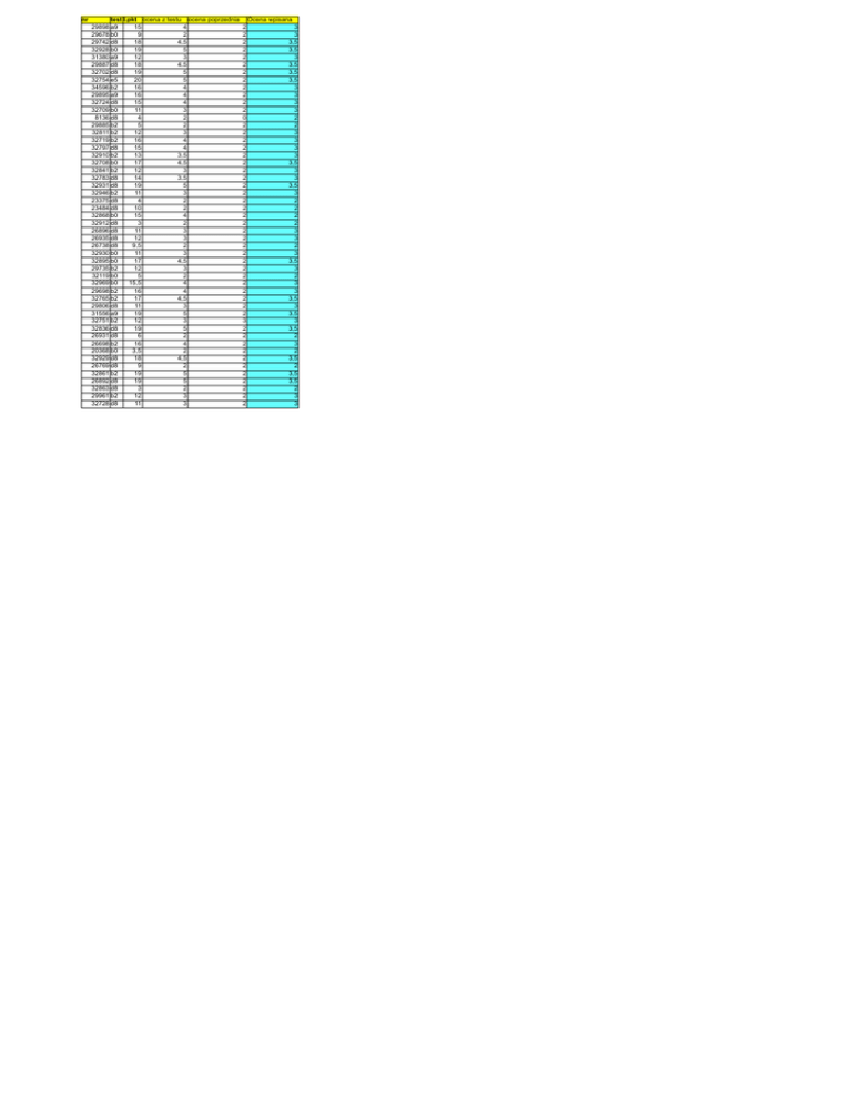 nr test l.pkt ocena z testu ocena poprzednia 29898 a9 15 4 29678 b0 9 2 29742 d8 18 4,5 32928 b0 19 5 31380 a9 12 3 29887 d8 18 4,5 32702 d8 19 5 32754 e5 20 5 34596 b2 16 4 29895 a9 16 4 32724 d8 15 4 32709 b0 11 3 8136 d8 4 2 29885 b2 5 2 32811 b2 12 3 32719 b2 16 4 32797 d8 15 4 32910 b2 13 3,5 32708 b0 17 4,5 32841 b2 12 3 32783 d8 14 3,5 32931 d8 19 5 32946 b2 11 3 23375 d8 4 2 23484 d8 10 2 32868 b0 15 4 32912 d8 3 2 26896 d8 11 3 26935 d8 12 3 26738 d8 9,5 2 32930 b0 11 3 32895 b0 17 4,5 29735 b2 12 3 32119 b0 5 2 32969 b0 15,5 4 29698 b2 16 4 32765 b2 17 4,5 29806 d8 11 3 31556 a9 19 5 32751 b2 12 3 32836 d8 19 5 26931 d8 6 2 26698 b2 16 4 20368 b0 3,5 2 32929 d8 18 4,5 26769 d8 9 2 32861 b2 19 5 26892 d8 19 5 32863 d8 3 2 29961 b2 12 3 32728 d8 11 3 Ocena wpisana 2 2 2 2 2 2 2 2 2 2 2 2 0 2 2 2 2 2 2 2 2 2 2 2 2 2 2 2 2 2 2 2 2 2 2 2 2 2 2 3 2 2 2 2 2 2 2 2 2 2 2 3 3 3,5 3,5 3 3,5 3,5 3,5 3 3 3 3 2 2 3 3 3 3 3,5 3 3 3,5 3 2 2 2 2 3 3 2 3 3,5 3 2 3 3 3,5 3 3,5 3 3,5 2 3 2 3,5 2 3,5 3,5 2 3 3