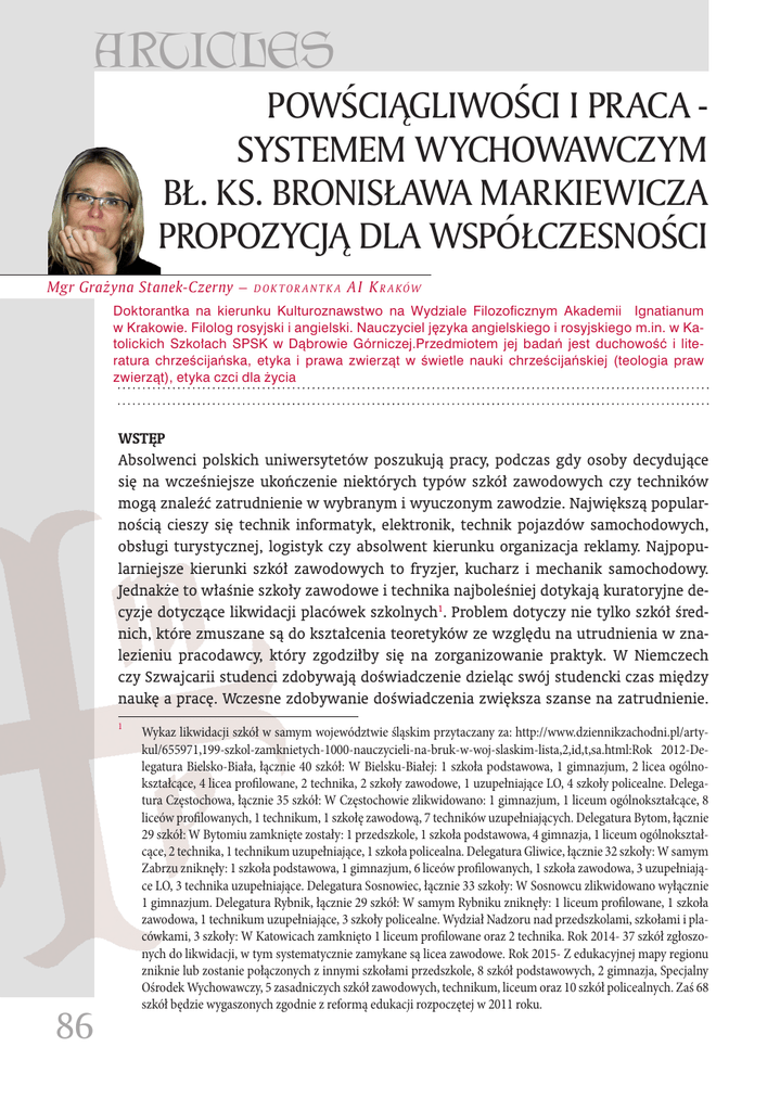 ARTICLES POWŚCIĄGLIWOŚCI I PRACA SYSTEMEM WYCHOWAWCZYM BŁ. KS. BRONISŁAWA MARKIEWICZA PROPOZYCJĄ DLA WSPÓŁCZESNOŚCI Mgr Grażyna Stanek-Czerny – dok tor antk a A I K r a ków Doktorantka na kierunku Kulturoznawstwo na Wydziale Filozoficznym Akademii Ignatianum w Krakowie. Filolog rosyjski i angielski. Nauczyciel języka angielskiego i rosyjskiego m.in. w Katolickich Szkołach SPSK w Dąbrowie Górniczej.Przedmiotem jej badań jest duchowość i literatura chrześcijańska, etyka i prawa zwierząt w świetle nauki chrześcijańskiej (teologia praw zwierząt), etyka czci dla życia WSTĘP Absolwenci polskich uniwersytetów poszukują pracy, podczas gdy osoby decydujące się na wcześniejsze ukończenie niektórych typów szkół zawodowych czy techników mogą znaleźć zatrudnienie w wybranym i wyuczonym zawodzie. Największą popularnością cieszy się technik informatyk, elektronik, technik pojazdów samochodowych, obsługi turystycznej, logistyk czy absolwent kierunku organizacja reklamy. Najpopularniejsze kierunki szkół zawodowych to fryzjer, kucharz i mechanik samochodowy. Jednakże to właśnie szkoły zawodowe i technika najboleśniej dotykają kuratoryjne decyzje dotyczące likwidacji placówek szkolnych1. Problem dotyczy nie tylko szkół średnich, które zmuszane są do kształcenia teoretyków ze względu na utrudnienia w znalezieniu pracodawcy, który zgodziłby się na zorganizowanie praktyk. W Niemczech czy Szwajcarii studenci zdobywają doświadczenie dzieląc swój studencki czas między naukę a pracę. Wczesne zdobywanie doświadczenia zwiększa szanse na zatrudnienie. 1 86 Wykaz likwidacji szkół w samym województwie śląskim przytaczany za: http://www.dziennikzachodni.pl/artykul/655971,199-szkol-zamknietych-1000-nauczycieli-na-bruk-w-woj-slaskim-lista,2,id,t,sa.html:Rok 2012-Delegatura Bielsko-Biała, łącznie 40 szkół: W Bielsku-Białej: 1 szkoła podstawowa, 1 gimnazjum, 2 licea ogólnokształcące, 4 licea profilowane, 2 technika, 2 szkoły zawodowe, 1 uzupełniające LO, 4 szkoły policealne. Delegatura Częstochowa, łącznie 35 szkół: W Częstochowie zlikwidowano: 1 gimnazjum, 1 liceum ogólnokształcące, 8 liceów profilowanych, 1 technikum, 1 szkołę zawodową, 7 techników uzupełniających. Delegatura Bytom, łącznie 29 szkół: W Bytomiu zamknięte zostały: 1 przedszkole, 1 szkoła podstawowa, 4 gimnazja, 1 liceum ogólnokształcące, 2 technika, 1 technikum uzupełniające, 1 szkoła policealna. Delegatura Gliwice, łącznie 32 szkoły: W samym Zabrzu zniknęły: 1 szkoła podstawowa, 1 gimnazjum, 6 liceów profilowanych, 1 szkoła zawodowa, 3 uzupełniające LO, 3 technika uzupełniające. Delegatura Sosnowiec, łącznie 33 szkoły: W Sosnowcu zlikwidowano wyłącznie 1 gimnazjum. Delegatura Rybnik, łącznie 29 szkół: W samym Rybniku zniknęły: 1 liceum profilowane, 1 szkoła zawodowa, 1 technikum uzupełniające, 3 szkoły policealne. Wydział Nadzoru nad przedszkolami, szkołami i placówkami, 3 szkoły: W Katowicach zamknięto 1 liceum profilowane oraz 2 technika. Rok 2014- 37 szkół zgłoszonych do likwidacji, w tym systematycznie zamykane są licea zawodowe. Rok 2015- Z edukacyjnej mapy regionu zniknie lub zostanie połączonych z innymi szkołami przedszkole, 8 szkół podstawowych, 2 gimnazja, Specjalny Ośrodek Wychowawczy, 5 zasadniczych szkół zawodowych, technikum, liceum oraz 10 szkół policealnych. Zaś 68 szkół będzie wygaszonych zgodnie z reformą edukacji rozpoczętej w 2011 roku. ARTYKUŁY Płynne przejście młodych z systemu edukacji na rynek pracy będzie możliwe, gdy pracodawcy aktywnie zaangażują się w edukację praktyczną młodego pokolenia. Jest to założenie słuszne, aczkolwiek wychowanie i edukacja młodego pokolenia przez pracę straciło wartość społeczną w okresie panowania hedonistycznego konsumpcjonizmu. Obserwując młodzież szkół ponadgimnazjalnych można wyraźnie zauważyć spadek poziomu poszanowania wysiłku, pracy fizycznej przy jednoczesnym poczuciu utraty wartości moralnych i autorytetów. W przestrzeni polskiego szkolnictwa pojawiały się wyjątkowe postaci rozumiejące wagę problematyki wykształcenia zawodowego w wychowaniu młodzieży, szeroki wymiar konsekwencji braku możliwości zdobycia umiejętności zawodowych w połączeniu z zaniedbaniem moralnym, wśród których znamienną rolę odegrał system wychowawczy zaproponowany przez błogosławionego księdza Bronisława Markiewicza, założyciela Zgromadzenia Świętego Michała Archanioła. 1. KRÓTKI ŻYCIORYS2 Błogosławiony ks. Bronisław Markiewicz urodził się 13 lipca 1842 roku w Pruchniku koło Jarosławia. Był ofiarnym i cenionym duszpasterzem i profesorem Seminarium Duchownego, szczególnie wrażliwym na religijne, moralne i materialne zaniedbanie dzieci i młodzieży. W swoim systemie wychowawczym zawarł nie tylko śmiałe propozycje związane z nauczaniem młodzieży ale również oficjalnie wypowiedział walkę wadom narodowym Polaków. Rozwiązanie problemów społecznych widział w dobrym wychowaniu młodzieży i podniesieniu moralnym całego społeczeństwa. W latach 1867-1885 pełnił posługę wikariusza w Harcie i przy katedrze w Przemyślu, studiował filozofię na Uniwersytecie we Lwowie i w Krakowie, był proboszczem w dwóch parafiach: Gać i Błażowa. Od 1882 roku wykładał teologię pastoralnej w Seminarium Duchownym w Przemyślu. W 1885 rozpoczął nowicjat u księży salezjanów w Turynie, gdzie złożył profesję na ręce Jana Bosko. Pierwszy zakład wychowawczy w Miejscu Piastowym zakłada ksiądz Markiewicz tuż po powrocie do Polski. We wrześniu 1897 roku odłącza się od Salezjanów w Turynie i jednocześnie wnosi prośbę do ordynariusza przemyskiego oraz do papieża o zezwolenie na założenie nowego zgromadzenia zakonnego. Przełożeni salezjańscy w Turynie za pośrednictwem biskupa Sołeckiego uwalniają Markiewicza z dniem 19 grudnia 1897 roku od ślubów wie