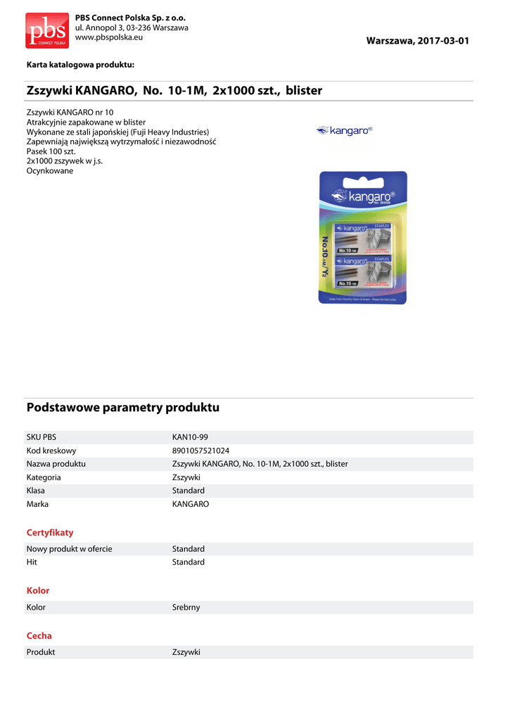 PBS Connect Polska Sp. z o.o. ul. Annopol 3, 03-236 Warszawa www.pbspolska.eu Karta katalogowa produktu: Zszywki KANGARO, No. 10-1M, 2x1000 szt., blister Zszywki KANGARO nr 10 Atrakcyjnie zapakowane w blister Wykonane ze stali japońskiej (Fuji Heavy Industries) Zapewniają największą wytrzymałość i niezawodność Pasek 100 szt. 2x1000 zszywek w j.s. Ocynkowane Podstawowe parametry produktu SKU PBS KAN10-99 Kod kreskowy 8901057521024 Nazwa produktu Zszywki KANGARO, No. 10-1M, 2x1000 szt., blister Kategoria Zszywki Klasa Standard Marka KANGARO Certyfikaty Nowy produkt w ofercie Standard Hit Standard Kolor Kolor Srebrny Cecha Produkt Zszywki Warszawa, 2017-03-01 PBS Connect Polska Sp. z o.o. ul. Annopol 3, 03-236 Warszawa www.pbspolska.eu Warszawa, 2017-03-01 Karta katalogowa produktu cd. Zszywki KANGARO, No. 10-1M, 2x1000 szt., blister Podstawowe parametry produktu Typ Metalowe Rodzaj Blister Materiał Stal W ofercie od 2015-10 Wymiary Rozmiar 10/5 Wspólny słownik zamówień CPV 30197100-7 Zszywki, gwoździki z szerokim łebkiem, pinezki kreślarskie