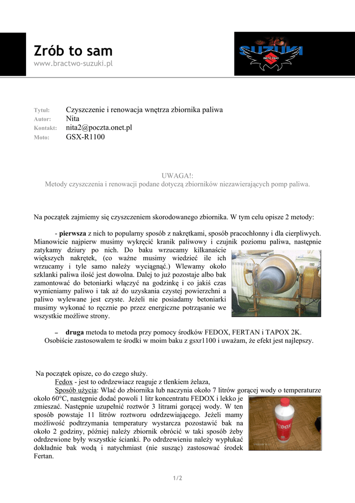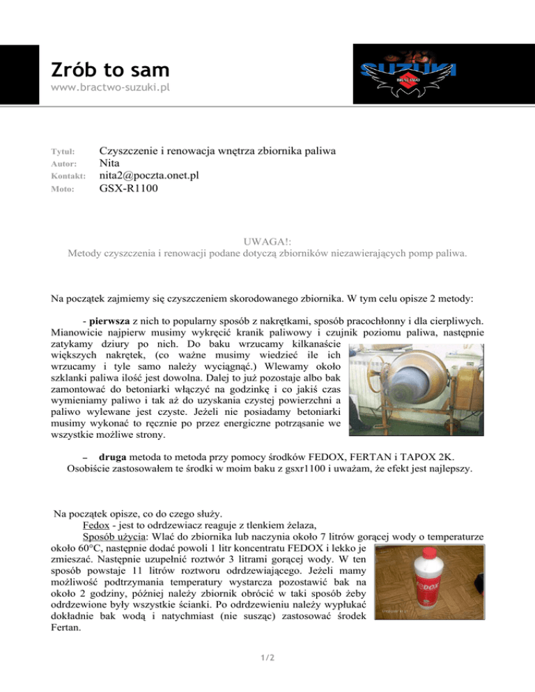 Zrób to sam www.bractwo-suzuki.pl Tytuł: Autor: Kontakt: Moto: Czyszczenie i renowacja wnętrza zbiornika paliwa Nita [email protected] GSX-R1100 UWAGA!: Metody czyszczenia i renowacji podane dotyczą zbiorników niezawierających pomp paliwa. Na początek zajmiemy się czyszczeniem skorodowanego zbiornika. W tym celu opisze 2 metody: - pierwsza z nich to popularny sposób z nakrętkami, sposób pracochłonny i dla cierpliwych. Mianowicie najpierw musimy wykręcić kranik paliwowy i czujnik poziomu paliwa, następnie zatykamy dziury po nich. Do baku wrzucamy kilkanaście większych nakrętek, (co ważne musimy wiedzieć ile ich wrzucamy i tyle samo należy wyciągnąć.) Wlewamy około szklanki paliwa ilość jest dowolna. Dalej to już pozostaje albo bak zamontować do betoniarki włączyć na godzinkę i co jakiś czas wymieniamy paliwo i tak aż do uzyskania czystej powierzchni a paliwo wylewane jest czyste. Jeżeli nie posiadamy betoniarki musimy wykonać to ręcznie po przez energiczne potrząsanie we wszystkie możliwe strony. – druga metoda to metoda przy pomocy środków FEDOX, FERTAN i TAPOX 2K. Osobiście zastosowałem te środki w moim baku z gsxr1100 i uważam, że efekt jest najlepszy. Na początek opisze, co do czego służy. Fedox - jest to odrdzewiacz reaguje z tlenkiem żelaza, Sposób użycia: Wlać do zbiornika lub naczynia około 7 litrów gorącej wody o temperaturze około 60°C, następnie dodać powoli 1 litr koncentratu FEDOX i lekko je zmieszać. Następnie uzupełnić roztwór 3 litrami gorącej wody. W ten sposób powstaje 11 litrów roztworu odrdzewiającego. Jeżeli mamy możliwość podtrzymania temperatury wystarcza pozostawić bak na około 2 godziny, później należy zbiornik obrócić w taki sposób żeby odrdzewione były wszystkie ścianki. Po odrdzewieniu należy wypłukać dokładnie bak wodą i natychmiast (nie susząc) zastosować środek Fertan. 1/2 www.Bractwo-Suzuki.pl Czyszczenie i renowacja wnętrza zbiornika paliwa Fertan - środek rozkładający rdzę i pozostawiający podkład pod farbę. Sposób użycia: z tym środkiem nie ma żadnego problemu jedyne, na co trzeba zwrócić uwagę to, aby nie stosować go na sucho. Powierzchnia malowana powinna być mokra. W zależności od dojścia można malować pędzlem lub w inny sposób. W zbiorniku najlepiej wlać trochę preparatu i energicznie potrząsać tak żeby dostał się do każdej szczeliny. Następnie nadmiar wylewamy, można go użyć ponownie, więc najlepiej spowrotem do butelki i po kłopocie. Tapox 2K - Jest to antykorozyjne, dwuskładnikowe pokrycie wnętrza zbiornika paliwa, odporne na działanie wszystkich znanych paliw silnikowych. Po zaschnięciu pozostaje żywiczna warstwa, co ciekawe nawet w przypadku głębokich wżerów i obawy, że zbiornik może przeciekać tapox wypełnia dziury i szczeliny. Sposób użycia: Do puszki wlewamy utwardzacz dokładnie mieszamy powstaje nam około 540g lakieru, producent twierdzi, że to powinno wystarczyć na zbiornik nawet około 40litrów. Czyli można rozrobić tylko połowę. I tak jak poprzednio wlewamy zatykamy zbiornik i wirujemy w betoniarce albo ręcznie. Po zakończeniu należy zapewnić swobodny odpływ nadmiaru lakieru, jak wiadomo zbyt gruba warstwa też nie jest dobra, a lakier jest gęsty i lubi zaschnąć gruba warstwa na dnie. Uwaga pełne zaschnięcie lakieru następuje po około 5 dniach, dopiero wtedy można wlać paliwo. Podczas schnięcia należy zapewnić wentylacje wewnątrz zbiornika. W RAZIE PYTAŃ ODSYŁAM NA STRONE SPRZEDAWCY. http://www.lr.pl/fertan.html http://www.lr.pl/renowacja_zbiornika.html A to efekt mojej pracy. PRZED PO Pozostał mi Fedox i Fertan mogę odstąpić. !! 2/2