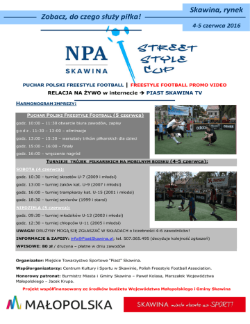 Zo a z, do zego służy piłka! Skawina, rynek 4-5 czerwca 2016 30 – PUCHAR POLSKI FREESTYLE FOOTBALL RELACJA NA | FREESTYLE FOOTBALL PROMO VIDEO YWO w internecie PIAST SKAWINA TV HARMONOGRAM IMPREZY: PUCHAR POLSKI FREESTYLE FOOTBALL (5 czerwca) godz. 10:00 – 11:30 otwarcie biura zawodów, zapisy g o d z . 11:30 – 13:00 – eliminacje godz. 13:00 – 15:30 – warsztaty trików piłkarskich dla dzieci godz. 15:00 – 16:00 – finały godz. 16:00 – wr czenie nagród TURNIEJE TRÓJEK PIŁKARSKICH NA MOBILNYM BOISKU (4-5 czerwca): SOBOTA (4 czerwca): godz. 10:30 – turniej skrzatów U-7 (2009 i młodsi) godz. 13:00 – turniej aków kat. U-9 (2007 i młodsi) godz. 16:00 – turniej trampkarzy kat. U-15 (2001 i młodsi) godz. 18:30 – turniej seniorów (1999 i starsi) NIEDZIELA (5 czerwca): godz. 09:30 – turniej młodzików U-13 (2003 i młodsi) godz. 12:30 – turniej chłopców U-11 (2005 i młodsi) UWAGA! DRU YNY MOż SI ZżŁASZAĆ W SKŁADACH o liczebności 4-6 zawodników! INFORMACJE & ZAPISY: [email protected]; tel. 507.065.495 (decyduje kolejność zgłoszeń) WPISOWE: 80 zł / dru yna – płatne w dniu zawodów Organizator: Miejskie Towarzystwo Sportowe "Piast" Skawina. Współorganizatorzy: Centrum Kultury i Sportu w Skawinie, Polish Freestyle Football Association. Honorowy patronat: Burmistrz Miasta i Gminy Skawina – Paweł Kolasa, Marszałek Województwa Małopolskiego – Jacek Krupa. Projekt współfinansowany ze środków bud etu Województwa Małopolskiego i Gminy Skawina REGULAMIN TURNIEJU TRÓJEK PIŁKARSKICH NPA SKAWINA STREET STYLE CUP 2016: 1. Zawody odbywaj si na boisku mobilnym z zielon nawierzchni o wymiarach 10 *15 m, i bramkami o wymiarach 1,2*1,8 m. wykładzinow , z bandami, 2. W turnieju uczestniczyć mog dru yny licz ce 4-6 zawodników; jednocześnie na boisku przebywa 3 zawodników w ka dej z dru yn. 3. Zawodnicy jednej dru yny powinni być ubrani w jednakowe stroje, w innym przypadku – b d rozgrywać mecze w znacznikach. 4. Turniej organizowany jest z podziałem na kategorie wiekowe do lat: 7, 9, 11, 13, 15 oraz turniej dorosłych 18 +, wg harmonogramu jak wy ej. 5. W ka dym turnieju uczestniczy maksymalnie 9 dru yn. 6. Mecze rozgrywane s w wymiarze czasowym 6-8 minut, bez przerw i zmiany stron boiska; zmiany w składzie dokonywane s w sposób „lotny”. Mecze w finale A (patrz: pkt. 8) rozgrywane s w wymiarze czasowym 8 minut. 7. W fazie eliminacyjnej turnieju rywalizacja odbywa si z podziałem na grupy 3-dru ynowe lub 2 grupy 4-dru ynowe, przy 8 zespołach. 8. Zwyci zcy poszczególnych grup tworz grup finałow A (3 dru yny), zdobywcy 2. miejsc w grupach eliminacyjnych – tworz grup finałow B, dru yny, dru yny z 3. miejsc – zagraj w finale C – w finale D. W przypadku dwóch grup – dwie najlepsze dru yny awansuj do półfinałów, a dwie słabsze – rywalizuj w play-off o miejsca 5-8. 9. Wszyscy uczestnicy turniejów otrzymaj upominki rzeczowe od organizatorów. 10. Zawodnicy trzech pierwszych zwyci zcy – nagrody rzeczowe. dru yn otrzymaj pami tkowe puchary (statuetki), a 11. Ka dy uczestnik turnieju piłkarskiego ma prawo do nieodpłatnego uczestnictwa we wszystkich pokazach i konkursach organizowanych w ramach NPA Skawina Street Style. 12. Przewidziano organizacj i nie tylko. konkursów: onglerki, dryblingu, trików piłkarskich, wiedzy o futbolu