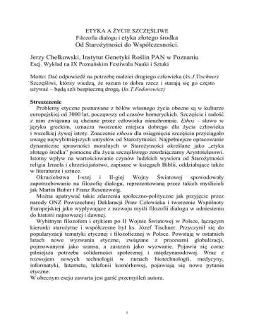 ETYKA A ŻYCIE SZCZĘŚLIWE Filozofia dialogu i etyka złotego środka Od Starożytności do Współczesności. Jerzy Chełkowski, Instytut Genetyki Roślin PAN w Poznaniu Esej. Wykład na IX Poznańskim Festiwalu Nauki i Sztuki Motto: Dać odpowiedź na potrzebę nadziei drugiego człowieka (ks.J.Tischner) Szczęśliwi, którzy wiedzą, że rozum to dobra rzecz i starają się go często używać – będą szli bezpieczną drogą. (ks.T.Fedorowicz) Streszczenie Problemy etyczne poznawane z bólów własnego życia obecne są w kulturze europejskiej od 3000 lat, począwszy od czasów homeryckich. Szczęście i radość z nim związana są chciane przez człowieka nieuchronnie. Ethos - słowo w języku greckim, oznacza tworzenie miejsca dobrego dla życia człowieka i wszelkiej żywej istoty. Znaczenie ethosu dla osiągnięcia szczęścia przyciągało uwagę najwybitniejszych umysłów od Starożytności. Najpełniejsze opracowanie dynamiczne sprawności moralnych w Starożytności określane jako „etyka złotego środka” pomocne dla życia szczęśliwego zawdzięczamy Arystotelesowi. Istotny wpływ na wartościowanie czynów ludzkich wywiera od Starożytności religia Izraela i chrześcijaństwo, zapisane w księgach Biblii, oddziałujące także w literaturze i sztuce. Okrucieństwa I-szej i II-giej Wojny Światowej spowodowały zapotrzebowanie na filozofię dialogu, reprezentowaną przez takich myślicieli jak Martin Buber i Franz Resenzweig. Można upatrywać takie zdarzenia społeczno-polityczne jak przyjęcie przez narody ONZ Powszechnej Deklaracji Praw Człowieka i tworzenie Wspólnoty Europejskiej jako wypływające z rozwoju myśli filozofii dialogu w odniesieniu do historii najnowszej i dawnej. Wybitnym filozofem i etykiem po II Wojnie Światowej w Polsce, łączącym kierunki starożytne i współczesne był ks. Józef Tischner. Przyczynił się do popularyzacji tematyki etycznej i filozoficznej w Polsce. Powstają w ostatnich latach nowe wyzwania etyczne, związane z procesami globalizacji, pojmowanymi jako szansa, a zarazem jako wyzwanie. Pojawia się coraz pilniejsza potrzeba solidarności społecznej i międzynarodowej. Wraz z rozwojem nowych technologii w ramach biotechnologii, medycyny, informatyki, Internetu, telefonii komórkowej, pojawiają się nowe pytania etyczne. W obecnym eseju zawarta jest garść przemyśleń autora. 1 Wprowadzenie. Być szczęśliwym to kwestia bardzo podstawowa dla każdego człowieka. Czy można znaleźć takiego, kto nie chciałby być szczęśliwym? Pytanie to zadaje w swym komentarzu do psalmu 119 św. Augustyn z Hippony w V-tym wieku. Nieraz jednak potocznie szczęście bywa utożsamiane z przyjemnością lub szczęśliwym trafem. Jaka jest zależność między szczęściem i radością? Nie jestem w zakresie etyki „fachowcem” czy „specjalistą”, jednak temat etyki można uznać za interesujący i ważny dla każdego człowieka. Z obszernego materiału jaki istnieje postanowiłem wybrać zagadnienie szczęścia. Zagadnienia zamieszczone w tym eseju zaprezentowano w ramach wykładów na IX i X-tym Poznańskim Festiwalu Nauki i Sztuki. Przednaukowe doświadczenia i pytania egzystencjalne i filozoficzne obecne są w najstarszych cywilizacjach. Pytania o szczęście i sprawności moralne człowieka pojawiają się w czasach przedhistorycznych. Według Jaspersa dzieje się to przede wszystkim w obliczu „sytuacji granicznych” – wobec cierpienia, walki, śmierci, w sytuacji winy. Do zadawania pytań filozoficznych skłaniają dwa bodźce: zdziwienie i wątpienie. Platon stwierdza, że dziwić się to stan znamienny dla filozofa, a zdziwienie to początek filozofii. Może to być na przykład podziw wywołany takim zjawiskiem jak tęcza. Dla Sokratesa filozofowanie uświadamia mu, że nic nie wie. Słynne jest to powiedzenie Sokratesa: wiem, że nic nie wiem. Arystoteles podziwia powstanie Wszechświata i zauważa, że bezradność wobec trudniejszych pytań pozwala mu poznać swoją niewiedzę, a ludzie filozofują, żeby zaradzić swojej niewiedzy. Kanta napełnia podziwem niebo gwiaździste i prawo moralne obecne w człowieku. Zainteresowania etyczne w kulturze europejskiej obejmują czasokres bliski 3000 lat, trzeba więc z tej ogromnej całości wybrać tylko przykładowe elementy. Chodzi o etykę pojmowaną nie jako formułki, definicje, zalecenia – lecz jako drogę budowania życia możliwie szczęśliwego, nie tylko osobistego lecz we wspólnocie ludzkiej. Bardzo istotne były dla mnie opracowania Józefa Bocheńskiego, Władysława Tatarkiewicza, a ostatnio Józefa Tischnera, Arno Anzenbachera i Leszka Kołakowskiego. którzy swoją pracę naukową i popularyzacyjną pojmowali jako posługę myślenia. Jest to szczególnie istotna posługa w obecnym czasie, bo myślenie zastępowane jest ilościową wiedzą encyklopedyczną. Uczący się człowiek traktowany bywa instrumentalnie, podobnie jak komputer, przysposabiany do wchłaniania dużej liczby informacji, często bez położenia akcentu na ich zrozumienie. Wszak student czy uczeń szkoły to przecież podmiot, a nie przedmiot nauczania. Nie zawsze tak bywa – uczniów, a nawet studentów traktuje się jak przedmiot – jak numer w dzienniku lub indeksie. 2 Współczesność znajduje się w nurcie syntezy, którą określamy globalizacją. Czujemy prąd rzeki globalizacji, która unosi nas w kierunku, który czasami może nam wydawać się niewiadomą. Bywamy przytłoczeni nadmiarem informacji i szybkością zmian. Czy jest to trend dobroczynny, czy może zagrożenie, pytamy? Globalizacja to fenomen, który dominuje w większości światowych zasad ekonomicznych. Oznacza przyspieszoną integrację gospodarki poprzez produkcję, handel, wpływy finansowe, rozwój technologiczny, sieci informacyjne i prądy kulturowe. W wyniku tych przemian kraje takie jak Japonia, Korea Południowa, Turcja, Chiny i Brazylia podwoiły dochód na osobę w ciągu 10-20 lat. Inny feno