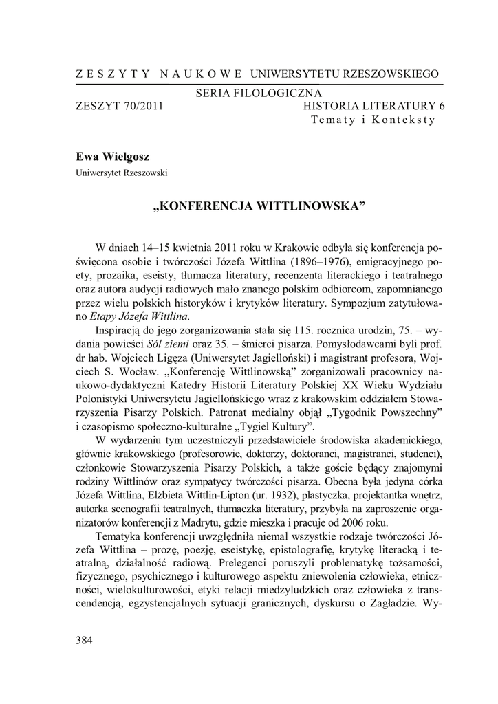 Z E S Z Y T Y N A U K O W E UNIWERSYTETU RZESZOWSKIEGO ZESZYT 70/2011 SERIA FILOLOGICZNA HISTORIA LITERATURY 6 Tema t y i K o nt ek s t y Ewa Wielgosz Uniwersytet Rzeszowski „KONFERENCJA WITTLINOWSKA” W dniach 14–15 kwietnia 2011 roku w Krakowie odbyła się konferencja poświęcona osobie i twórczości Józefa Wittlina (1896–1976), emigracyjnego poety, prozaika, eseisty, tłumacza literatury, recenzenta literackiego i teatralnego oraz autora audycji radiowych mało znanego polskim odbiorcom, zapomnianego przez wielu polskich historyków i krytyków literatury. Sympozjum zatytułowano Etapy Józefa Wittlina. Inspiracją do jego zorganizowania stała się 115. rocznica urodzin, 75. – wydania powieści Sól ziemi oraz 35. – śmierci pisarza. Pomysłodawcami byli prof. dr hab. Wojciech Ligęza (Uniwersytet Jagielloński) i magistrant profesora, Wojciech S. Wocław. „Konferencję Wittlinowską” zorganizowali pracownicy naukowo-dydaktyczni Katedry Historii Literatury Polskiej XX Wieku Wydziału Polonistyki Uniwersytetu Jagiellońskiego wraz z krakowskim oddziałem Stowarzyszenia Pisarzy Polskich. Patronat medialny objął „Tygodnik Powszechny” i czasopismo społeczno-kulturalne „Tygiel Kultury”. W wydarzeniu tym uczestniczyli przedstawiciele środowiska akademickiego, głównie krakowskiego (profesorowie, doktorzy, doktoranci, magistranci, studenci), członkowie Stowarzyszenia Pisarzy Polskich, a także goście będący znajomymi rodziny Wittlinów oraz sympatycy twórczości pisarza. Obecna była jedyna córka Józefa Wittlina, Elżbieta Wittlin-Lipton (ur. 1932), plastyczka, projektantka wnętrz, autorka scenografii teatralnych, tłumaczka literatury, przybyła na zaproszenie organizatorów konferencji z Madrytu, gdzie mieszka i pracuje od 2006 roku. Tematyka konferencji uwzględniła niemal wszystkie rodzaje twórczości Józefa Wittlina – prozę, poezję, eseistykę, epistolografię, krytykę literacką i teatralną, działalność radiową. Prelegenci poruszyli problematykę tożsamości, fizycznego, psychicznego i kulturowego aspektu zniewolenia człowieka, etniczności, wielokulturowości, etyki relacji miedzyludzkich oraz człowieka z transcendencją, egzystencjalnych sytuacji granicznych, dyskursu o Zagładzie. Wy384 stąpienia konferencyjne objęły ponadto Wittlinową sztukę podróżowania oraz radiowy, krytyczny i epistolograficzny profil działalności pisarza. Pierwsza część sympozjum rozpoczęła się 14 kwietnia w salonie Stowarzyszenia Pisarzy Polskich w Krakowie. Przedstawiono trzy 25-minutowe referaty. Dwa z nich poświęcone były najbardziej znanemu i cenionemu dziełu twórcy, powieści pacyfistycznej Sól ziemi. Konferencję otworzyło wystąpienie dr Doroty Siwor (Uniwersytet Jagielloński) zatytułowane Dokąd zmierza Piotr Niewiadomski – o bohaterze „Soli ziemi” w kontekście mityczno-rytualnym. Referat pomyślany został jako weryfikacja tez Ewy Wiegandt i Krystyny Jakowskiej dotyczących kontekstu mityczno-rytualnego i sytuacji mitologizującej świat przedstawiony Soli ziemi. W sposobie przedstawienia Piotra Niewiadomskiego referentka dostrzegła zrytualizowane gesty i działania. Przywołując odpowiednie epizody z powieści, udowodniła, iż tworzą one schemat procesu inicjacyjnego, rytuał inicjacji, rite de passage, a konstrukcja bohatera jest symboliczna. Omówiono także szczegóły stylizacji – biblijnej i sakralizacji wojny oraz związek takiego sposobu przedstawienia świata ze schematem inicjacyjnym. Wojna rozumiana jako sacrum, ukazana z ironicznym dystansem, będąca parodią wtajemniczania umożliwia jednak postawienie pytania: dokąd zmierza Piotr Niewiadomski? To za jej przyczyną bohater usiłuje rozpoznać własną sytuację w świecie, przechodzi przemianę, dokonuje autoanalizy. W Wittlinowej ironii referentka zauważyła niewiarę w dojrzałość bohatera do wzięcia odpowiedzialności za rzeczywistość, czyli zdolność, która miałaby być rezultatem inicjacji. Jej zdaniem bez „idealizującej aury prostaczka” losy Piotra są parodią rytuału. Zaprawiony ironią tytuł powieści i „gorzko przewrotny opis przestrzeni rozpoczynający powieść” podważają mit wspólnoty czystej etycznie ludzkości. W miejscu konkluzji postawione zostało pytanie: czy, niezależnie od czasu, w którym żyjemy, Wittlin nie stawia przed naszymi oczyma lustra, abyśmy mogli lub musieli się w nim przejrzeć? Wojciech S. Wocław (Uniwersytet Jagielloński), autor odczytu pt. Świat – igrzysko ironisty. Rozważania o „Soli ziemi” Józefa Wittlina, skoncentrował uwagę na ironii rozumianej jako trop, stylizacja i postawa prezentowana w powieści Wittlina. Sformułowana została przestroga przed trwałym łączeniem ironii ze śmiechem, grożącym trywializacją. Zalecono w to miejsce bachtinowską, różnorodną w wyrazie „karnawalizację wewnętrzną”. Ironia Wittlina wyrażająca osobistą postawę oraz stan świata ufundowana została na pacyfizmie oraz franciszkanizmie i doświadczeniu wojny. Dalekowschodnia afirmacja życia mająca swój początek w zamyśleniu nad kulturą i własną duchowością, europejskość pisarza dodane do wymienionych postaw ideowych ukształtowały – na zasadzie kontrastu – jego stosunek do konfliktów zbrojnych. Wittlinowa ironia wywołana przez wojnę okazała się gorzka. W świecie wojny, w „świecie na opak” priorytet w hierarchii wartości stanowi bowiem śmierć. Afirmacja życia cechująca pisarza przerodziła się więc w sceptycyzm i spowodowała 385 „konstruowanie takiej rzeczywistości, w którą nie chce się wierzyć, której nie chce się zaakceptować, ale wobec której – ze względu na jej obiektywne istnienie – nie sposób tak postąpić”. W ironii Wittlina referent dostrzegł obronę przed nihilizmem, wiarę w nadrzędne, choć umowne prawo moralne, otwarcie „spektaklu sensów” wizjonerskich, ale również wytworzenie bariery komunikacy