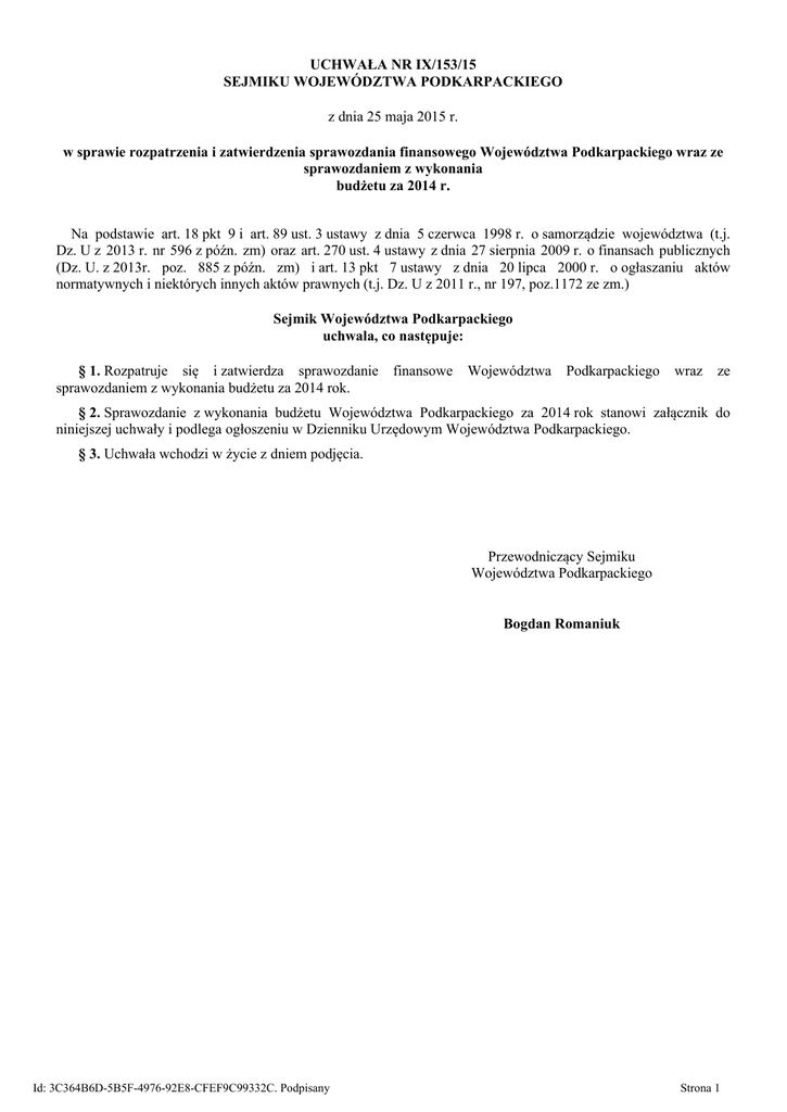 UCHWAŁA NR IX/153/15 SEJMIKU WOJEWÓDZTWA PODKARPACKIEGO z dnia 25 maja 2015 r. w sprawie rozpatrzenia i zatwierdzenia sprawozdania finansowego Województwa Podkarpackiego wraz ze sprawozdaniem z wykonania budżetu za 2014 r. Na podstawie art. 18 pkt 9 i art. 89 ust. 3 ustawy z dnia 5 czerwca 1998 r. o samorządzie województwa (t.j. Dz. U z 2013 r. nr 596 z późn. zm) oraz art. 270 ust. 4 ustawy z dnia 27 sierpnia 2009 r. o finansach publicznych (Dz. U. z 2013r. poz. 885 z późn. zm) i art. 13 pkt 7 ustawy z dnia 20 lipca 2000 r. o ogłaszaniu aktów normatywnych i niektórych innych aktów prawnych (t.j. Dz. U z 2011 r., nr 197, poz.1172 ze zm.) Sejmik Województwa Podkarpackiego uchwala, co następuje: § 1. Rozpatruje się i zatwierdza sprawozdanie sprawozdaniem z wykonania budżetu za 2014 rok. finansowe Województwa Podkarpackiego wraz ze § 2. Sprawozdanie z wykonania budżetu Województwa Podkarpackiego za 2014 rok stanowi załącznik do niniejszej uchwały i podlega ogłoszeniu w Dzienniku Urzędowym Województwa Podkarpackiego. § 3. Uchwała wchodzi w życie z dniem podjęcia. Przewodniczący Sejmiku Województwa Podkarpackiego Bogdan Romaniuk Id: 3C364B6D-5B5F-4976-92E8-CFEF9C99332C. Podpisany Strona 1 Załącznik do uchwały Nr IX/153/15 Sejmiku Województwa Podkarpackiego z dnia 25 maja 2015 r. WOJEWÓDZTWO PODKARPACKIE SPRAWOZDANIE ROCZNE Z WYKONANIA BUDŻETU WOJEWÓDZTWA PODKARPACKIEGO ZA 2014 ROK Id: 3C364B6D-5B5F-4976-92E8-CFEF9C99332C. Podpisany Strona 2 WSTĘP Przedłożone sprawozdanie swoim zakresem i szczegółowością wypełnia wymogi ustawowe zawarte w art. 267 ust. 1 pkt 1 oraz art. 269 ustawy z dnia 27 sierpnia 2009 r. o finansach publicznych /Dz. U. z 2013 poz. 885 z późn. zm./ oraz stanowi podstawę do głosowania w sprawie absolutorium dla Zarządu Województwa Podkarpackiego za 2014 r. Sprawozdanie z wykonania budżetu Województwa Podkarpackiego za 2014 r. składa się z części tabelarycznej i opisowej. Część tabelaryczna została sporządzona na podstawie sprawozdań jednostkowych złożonych przez jednostki organizacyjne i zawiera zestawienia wykonania planu: dochodów według działów, rozdziałów, paragrafów klasyfikacji budżetowej oraz źródeł pochodzenia i rodzajów dochodów, wydatków według działów, rozdziałów, paragrafów klasyfikacji budżetowej oraz rodzajów wydatków, dochodów i wydatków zadań z zakresu administracji rządowej wykonywanych przez samorząd Województwa, dochodów i wydatków związanych ze szczególnymi zasadami wykonywania budżetu Województwa wynikającymi z odrębnych ustaw, dochodów gromadzonych na wyodrębnionym rachunku przez wojewódzkie oświatowe jednostki budżetowe oraz wydatków nimi finansowanych, dochodów i wydatków związanych z realizacją zadań wykonywanych w drodze umów lub porozumień między jednostkami samorządu terytorialnego na dofinansowanie własnych zadań bieżących oraz zadań inwestycyjnych i zakupów inwestycyjnych, dotacji udzielonych innym jednostkom samorządu terytorialnego na dofinansowanie własnych zadań bieżących oraz zadań inwestycyjnych i zakupów inwestycyjnych, przychodów i rozchodów budżetu. Część opisowa została sporządzona na podstawie materiałów złożonych przez Departamenty Urzędu Marszałkowskiego i obejmuje objaśnienia do źródeł dochodów budżetu w ramach poszczególnych działów oraz objaśnienia do wykonanych zadań w ramach poszczególnych działów i rozdziałów wydatków budżetu. Id: 3C364B6D-5B5F-4976-92E8-CFEF9C99332C. Podpisany Strona 3 Budżet Województwa Podkarpackiego na 2014 r. przyjęty Uchwałą Nr XLI/815/13 Sejmiku Województwa Podkarpackiego w Rzeszowie z dnia 30 grudnia 2013 r. wynosił: Plan dochodów 1.406.948.843,- zł, Plan wydatków 1.443.644.441,- zł, Planowany deficyt Plan przychodów na finansowanie planowanego deficytu budżetu Województwa - 36.695.598,- zł, 36.695.598,- zł, z tytułu: spłaty pożyczek udzielanych z budżetu 1.166.652,- zł, wolnych środków jako nadwyżki środków pieniężnych na rachunku bieżącym budżetu jednostki samorządu terytorialnego wynikających z rozliczeń wyemitowanych papierów wartościowych, kredytów i pożyczek z lat ubiegłych 35.528.946,- zł, Plan przychodów na spłatę wcześniej zaciągniętych zobowiązań z tytułu zaciąganego kredytu długoterminowego 7.962.868,- zł, Plan rozchodów z tytułu spłaty rat kredytów długoterminowych zaciągniętych w latach ubiegłych 7.962.868,- zł. W trakcie 2014 r. zachodziły zmiany w planie dochodów i wydatków, dokonywane Uchwałami Sejmiku oraz w ramach posiadanych uprawnień uchwałami Zarządu. Na dzień 31.12.2014 r. budżet po zmianach wynosił: Plan dochodów 1.373.223.565,- zł, Plan wydatków 1.424.317.441,- zł, Planowany deficyt Plan przychodów na finansowanie planowanego deficytu budżetu województwa - 51.093.876,- zł, 51.093.876,- zł, w tym z tytułu: - spłaty pożyczek udzielanych z budżetu 249.989,- zł, - wolnych środków jako nadwyżki środków pieniężnych na rachunku bieżącym budżetu jednostki samorządu terytorialnego wynikających z rozliczeń wyemitowanych papierów wartościowych, kredytów i pożyczek Id: 3C364B6D-5B5F-4976-92E8-CFEF9C99332C. Podpisany Strona 4 z lat ubiegłych 50.843.887,- zł, Plan przychodów na spłatę wcześniej zaciągniętych zobowiązań z tytułu wolnych środków jako nadwyżki środków pieniężnych na rachunku bieżącym budżetu jednostki samorządu terytorialnego, wynikających z rozliczeń wyemitowanych papierów wartościowych, kredytów i pożyczek z lat ubiegłych 7.962.868,- zł, Plan rozchodów z tytułu spłaty rat kredytów długoterminowych zaciągniętych w latach ubiegłych 7.962.868,- zł, Budżet za 2014 r. został wykonany w 94,96% w zakresie dochodów i w 88,37% w zakresie wydatków i wynosił: Wykonanie dochodów 1.304.001.686,- zł, Wykonanie wydatków 1.258.740.344,- zł, Nadwyżka 45.261.342,- zł, Wykonanie przyc