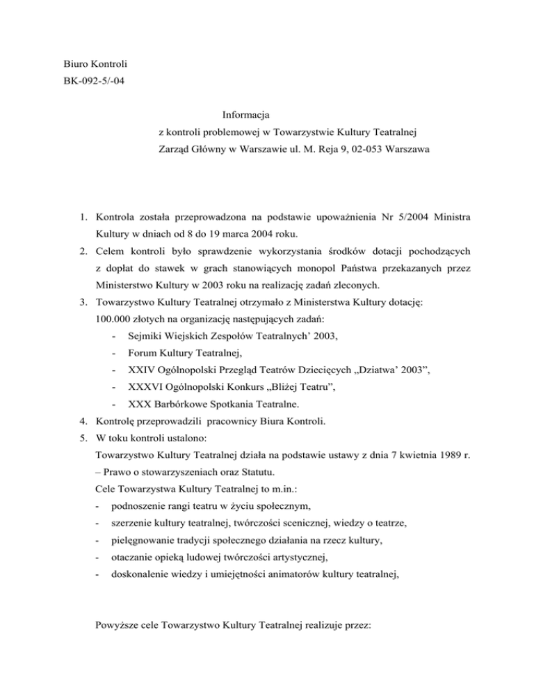 Informacja z kontroli problemowej w Towarzystwie Kultury Teatralnej