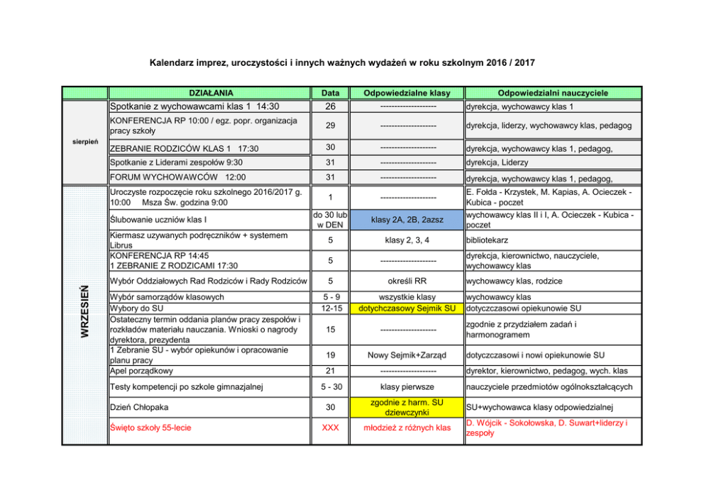 Kalendarz imprez, uroczystości i innych ważnych wydażeń w roku szkolnym 2016 / 2017 DZIAŁANIA sierpień Data Odpowiedzialne klasy Spotkanie z wychowawcami klas 1 14:30 26 -------------------- dyrekcja, wychowawcy klas 1 KONFERENCJA RP 10:00 / egz. popr. organizacja pracy szkoły 29 -------------------- dyrekcja, liderzy, wychowawcy klas, pedagog ZEBRANIE RODZICÓW KLAS 1 17:30 30 -------------------- dyrekcja, wychowawcy klas 1, pedagog, Spotkanie z Liderami zespołów 9:30 31 -------------------- dyrekcja, Liderzy FORUM WYCHOWAWCÓW 12:00 31 -------------------- dyrekcja, wychowawcy klas 1, pedagog, Uroczyste rozpoczęcie roku szkolnego 2016/2017 g. 10:00 Msza Św. godzina 9:00 1 -------------------- do 30 lub w DEN klasy 2A, 2B, 2azsz 5 klasy 2, 3, 4 5 -------------------- 5 określi RR Wybór samorządów klasowych Wybory do SU Ostateczny termin oddania planów pracy zespołów i rozkładów materiału nauczania. Wnioski o nagrody dyrektora, prezydenta 1 Zebranie SU - wybór opiekunów i opracowanie planu pracy Apel porządkowy 5-9 12-15 wszystkie klasy dotychczasowy Sejmik SU wychowawcy klas dotyczczasowi opiekunowie SU 15 -------------------- zgodnie z przydziałem zadań i harmonogramem 19 Nowy Sejmik+Zarząd 21 -------------------- dyrektor, kierownictwo, pedagog, wych. klas Testy kompetencji po szkole gimnazjalnej 5 - 30 klasy pierwsze nauczyciele przedmiotów ogólnokształcących 30 zgodnie z harm. SU dziewczynki XXX młodzież z różnych klas Ślubowanie uczniów klas I WRZESIEŃ Kiermasz uzywanych podręczników + systemem Librus KONFERENCJA RP 14:45 1 ZEBRANIE Z RODZICAMI 17:30 Wybór Oddziałowych Rad Rodziców i Rady Rodziców Dzień Chłopaka Święto szkoły 55-lecie Odpowiedzialni nauczyciele E. Fołda - Krzystek, M. Kapias, A. Ocieczek Kubica - poczet wychowawcy klas II i I, A. Ocieczek - Kubica poczet bibliotekarz dyrekcja, kierownictwo, nauczyciele, wychowawcy klas wychowawcy klas, rodzice dotyczczasowi i nowi opiekunowie SU SU+wychowawca klasy odpowiedzialnej D. Wójcik - Sokołowska, D. Suwart+liderzy i zespoły PAŹDZIERNIK LISTOPAD GRUDZIEŃ STYCZEŃ FORUM WYCHOWAWCÓW 14:45 Opracowanie wyników i wniosków z testów kompetencji - zwrot do Lidera i dyrektora szkoły KONFERENCJA SZKOLENIOWA 14:45 3 -------------------- dyrekcja, liderzy, wychowawcy klas, pedagog 7 klasy pierwsze nauczyciele przedmiotów ogólnokształcących 10 -------------------- dyrekcja, kierownictwo, nauczyciele Dzień Edukacji Narodowej otrzęsiny klas I Halloween FORUM WYCHOWAWCÓW 14:45 13 / 14 7 zgodnie z harm. SU zgodnie z harm. SU zgodnie z harm. SU -------------------- Rocznica Odzyskania Niepodległości 9-10 4A, 1a zsz KONFERENCJA RP 14:45 Dzień Życzliwości i Pozdrowień Andrzejki Mikołajki Zagrożenia ndst, nkl FORUM WYCHOWAWCÓW 14:45 KONFERENCJA 14:45 KONSULTACJE dla Rodziców 17:00 - 17:30 2 ZEBRANIE Z RODZICAMI 17:30 inf. o zagrożeniach 16 20 30 6 do 9 12 -------------------zgodnie z harm. SU zgodnie z harm. SU zgodnie z harm. SU --------------------------------------- 19 -------------------- Jasełka 21 uczniowie chętni z różnych klas Wigilia 22 klasy + wychowawca Dzień Maturzysty 2 klasy maturalne + wychowawcy Wystawienie ocen proponowanych do 5 ----------------------- WSZYSCY NAUCZYCIELE Sprawozdania za I półrocze, arkusze samooceny do 5 ----------------------- NAUCZYCIELE, pielegnairka, BHP, SIP, INF 9 ----------------------- dyrekcja, liderzy, wychowawcy klas, pedagog FORUM WYCHOWAWCÓW 14:45 19 31 SU+wychowawca klasy odpowiedzialnej SU+wychowawca klasy odpowiedzialnej SU+wychowawca klasy odpowiedzialnej dyrekcja, liderzy, wychowawcy klas, pedagog A. Grawoń - Woźniak, U. Strugała, A. Ocieczek - Kubica - poczet WSZYSCY NAUCZYCIELE SU+wychowawca klasy odpowiedzialnej SU+wychowawca klasy odpowiedzialnej SU+wychowawca klasy odpowiedzialnej WSZYSCY NAUCZYCIELE dyrekcja, liderzy, wychowawcy klas, pedagog dyrekcja, kierownictwo, nauczyciele, wychowawcy klas A. Koniarek, M. Herwich Wystawienie ocen śródrocznych do 13 ZAKOŃCZENIE 1 PÓŁROCZA 13 ----------------------- -------------------------------------------------- KONFERENCJA KLASYFIKACYJNA 14:45 / 3 ZEBRANIE Z RODZICAMI oceny śródroczne 17:30 30 ----------------------- dyrekcja, kierownictwo, nauczyciele, wychowawcy klas klasy maturalne RODZICE+WYCHOWAWCA STUDNIÓWKA WSZYSCY NAUCZYCIELE LUTY MARZEC Walentynki Dzień Bezpiecznego Internetu 10 do 12 zgodnie z harm. SU 1A, 1B, 1C, 1a zsz SU+wychowawca klasy odpowiedzialnej R. Matla - Kocot, Ł. Pownug 27 ----------------------- dyrekcja, kierownictwo, NAUCZYCIELE 8 10 / 13 do 10 13 Chłopcy chętni z różnych klas młodziez z różnych klas --------------------------------------- 17 1A, 1B, 1C 20 -------------------- 21 zgodnie z harm. SU 3 lub 19 wszystkie klasy Dzień Ziemi do 17 uczniowie chętni z różnych klas Wystawienie ocen proponowanych w kl. IV FORUM WYCHOWAWCÓW 14:45 Wystawienie ocen rocznych w kl. IV do 7 10 do 21 ----------------------------------------------------------------- KONFERENCJA KLASYFIKACYJNA kl IV 14:45 24 ----------------------- ZAKOŃCZENIE ROKU KL. IV - Pożegnanie klas IV 28 3A, 3B Rocznica konstytucji 3 Maja 28 KONFERENCJA - SPRAWOZDANIE Z NADZORU PEDAGOGICZNEGO I KONF. SZKOLENIOWA 14:30 Dzień Kobiet Dzień liczby Pi Zagrożenia ndst, nkl dla kl. IV FORUM WYCHOWAWCÓW 14:45 ROCZNICA POWSTAŃ ŚLĄSKICH - ŚWIĘTO PATRONA SZKOŁY KONFERENCJA 14:45 KONSULTACJE dla Rodziców 17:00 - 17:30 3 ZEBRANIE Z RODZICAMI 17:30 inf. o zagrożeniach kl. IV Pierwszy Dzień Wiosny - DZIEŃ OTWARTY KWIECIEŃ Dzień Zawodów MAJ Dzień Unii Europejskiej i jezyków Zagrożenia ndst, nkl FORUM WYCHOWAWCÓW 14:45 KONFERENCJA 14:45 KONSULTACJE dla Rodziców 17:00 - 17:30 4 ZEBRANIE Z RODZICAMI 17:30 inf. o do 19 22 uczniowie chętni z różnych klas uczniowie chętni z różnych klas --------------------------------------- 29 -------------------- 9 nauczyciele nauczyciele matematyki WSZYSCY NAUCZYCIELE dyrekcja, liderzy, wychowawcy klas, pedag