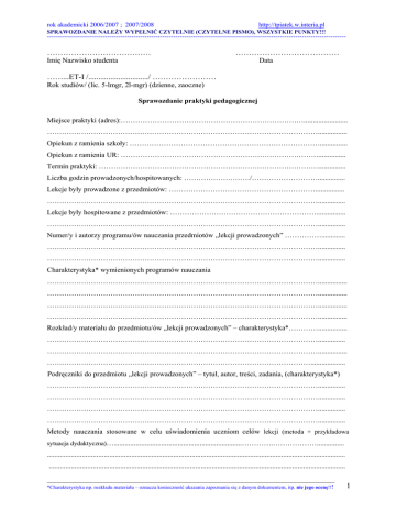 rok akademicki 2006/2007 ; 2007/2008 http://tpiatek.w.interia.pl SPRAWOZDANIE NALEŻY WYPEŁNIĆ CZYTELNIE (CZYTELNE PISMO), WSZYSTKIE PUNKTY!!! --------------------------------------------------------------------------------------------------------------------------------------- ………………………………… ………………………………… Imię Nazwisko studenta Data ……...ET-I /............................../ …………………… Rok studiów/ (lic. 5-lmgr, 2l-mgr) (dzienne, zaoczne) Sprawozdanie praktyki pedagogicznej Miejsce praktyki (adres):…………………………………………………………………........................ …………………………………………………………………………………………………................ Opiekun z ramienia szkoły: ……………………………………………………………………............... Opiekun z ramienia UR: ………………………………………………………………………............... Termin praktyki: ………………………………………………………………………………............... Liczba godzin prowadzonych/hospitowanych: ………………………/………………………............... Lekcje były prowadzone z przedmiotów: ……………………………………………………................ …………………………………………………………………………………………………............... Lekcje były hospitowane z przedmiotów: ……………………………………………………................ …………………………………………………………………………………………………............... Numer/y i autorzy programu/ów nauczania przedmiotów „lekcji prowadzonych” ……………............. …………………………………………………………………………………………………............... …………………………………………………………………………………………………............... Charakterystyka* wymienionych programów nauczania …………………………………………………………………………………………………................ …………………………………………………………………………………………………................ …………………………………………………………………………………………………................ …………………………………………………………………………………………………................ Rozkład/y materiału do przedmiotu/ów „lekcji prowadzonych” – charakterystyka*…………................ …………………………………………………………………………………………………............... …………………………………………………………………………………………………................ ………………………………………………………………………………………………................... Podręczniki do przedmiotu „lekcji prowadzonych” – tytuł, autor, treści, zadania, (charakterystyka*) …………………………………………………………………………………………………............... …………………………………………………………………………………………………............... …………………………………………………………………………………………………............... …………………………………………………………………………………………………............... Metody nauczania stosowane w celu uświadomienia uczniom celów lekcji (metoda + przykładowa sytuacja dydaktyczna)…......................................................................………….………………............... ................................................................................................................................................................... .................................................................................................................................................................. ________________________________________________________________________ *Charakterystyka np. rozkładu materiału – oznacza konieczność ukazania zapoznania się z danym dokumentem, itp. nie jego ocenę!!! 1 rok akademicki 2006/2007 ; 2007/2008 http://tpiatek.w.interia.pl SPRAWOZDANIE NALEŻY WYPEŁNIĆ CZYTELNIE (CZYTELNE PISMO), WSZYSTKIE PUNKTY!!! --------------------------------------------------------------------------------------------------------------------------------------- Sposoby oceny stopnia realizacji celów lekcji (na jakiej podstawie stwierdzono, przykłady)? ………………………………………………………………………………………………................. ...........………………………………………………………………………………………………….. ………...............……………………………………………………………………………………….. Sposoby stawiania uczniów w sytuacji problemowej na prowadzonych lekcjach (sposób + przykładowa sytuacja dydaktyczna) ............………………………………………………………………………….. …………………..................………………………………………………………………………….. ……………………………...........…………………………………………………………………….. ……………………………………...........…………………………………………………………….. Metody nauczania jakie najczęściej stosowane były w części 