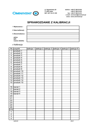 ul. Sępoleńska 20 77-420 Lipka NIP: 527-10-31-185 telefon: +48 67 266 50 86 +48 67 266 54 02 fax: +48 67 266 54 03 e-mail: [email protected] www: www.omnivent.pl SPRAWOZDANIE Z KALIBRACJI 1 Wykonawca : 2 Data kalibracji: 3 Zleceniodawca : adres NIP: nazwa obiektu 4 Nr. 1 2 3 4 5 6 7 8 9 10 11 12 13 14 15 16 17 18 19 20 21 22 23 24 25 0-IV 1 2 3 4 Kalibracja czujnik produkt 1 produkt 2 produkt 3 produkt 4 produkt 5 produkt 6 produkt 7 produkt 8 produkt 9 produkt 10 produkt 11 produkt 12 produkt 13 produkt 14 produkt 15 sekcja 1 sekcja 2 sekcja 3 sekcja 4 sekcja 5 sekcja 6 kanał 1 kanał 2 kanał 3 kanał 4 wykonał zlecił