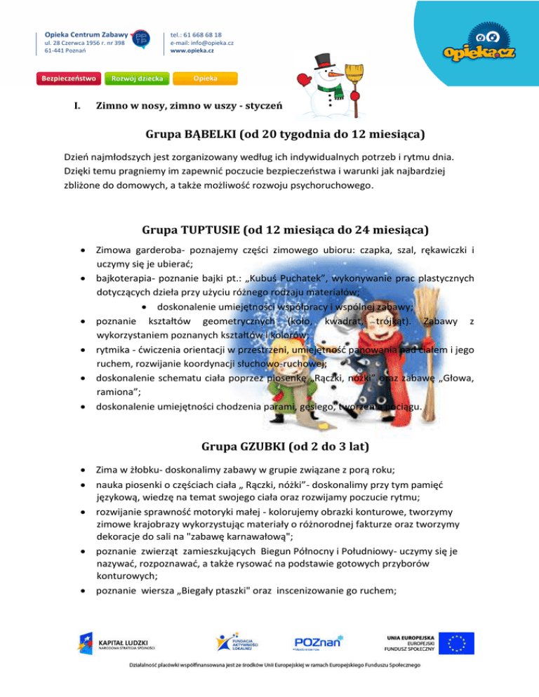 Opieka Centrum Zabawy tel.: 61 668 68 18 ul. 28 Czerwca 1956 r. nr 398 61-441 Poznań e-mail: [email protected] www.opieka.cz I. Zimno w nosy, zimno w uszy - styczeń Grupa BĄBELKI (od 20 tygodnia do 12 miesiąca) Dzień najmłodszych jest zorganizowany według ich indywidualnych potrzeb i rytmu dnia. Dzięki temu pragniemy im zapewnić poczucie bezpieczeństwa i warunki jak najbardziej zbliżone do domowych, a także możliwość rozwoju psychoruchowego. Grupa TUPTUSIE (od 12 miesiąca do 24 miesiąca) Zimowa garderoba- poznajemy części zimowego ubioru: czapka, szal, rękawiczki i uczymy się je ubierać; bajkoterapia- poznanie bajki pt.: „Kubuś Puchatek”, wykonywanie prac plastycznych dotyczących dzieła przy użyciu różnego rodzaju materiałów; doskonalenie umiejętności współpracy i wspólnej zabawy; poznanie kształtów geometrycznych (koło, kwadrat, trójkąt). Zabawy z wykorzystaniem poznanych kształtów i kolorów; rytmika - ćwiczenia orientacji w przestrzeni, umiejętność panowania nad ciałem i jego ruchem, rozwijanie koordynacji słuchowo-ruchowej; doskonalenie schematu ciała poprzez piosenkę „Rączki, nóżki” oraz zabawę „Głowa, ramiona”; doskonalenie umiejętności chodzenia parami, gęsiego, tworzenia pociągu. Grupa GZUBKI (od 2 do 3 lat) Zima w żłobku- doskonalimy zabawy w grupie związane z porą roku; nauka piosenki o częściach ciała „ Rączki, nóżki”- doskonalimy przy tym pamięć językową, wiedzę na temat swojego ciała oraz rozwijamy poczucie rytmu; rozwijanie sprawność motoryki małej - kolorujemy obrazki konturowe, tworzymy zimowe krajobrazy wykorzystując materiały o różnorodnej fakturze oraz tworzymy dekoracje do sali na "zabawę karnawałową"; poznanie zwierząt zamieszkujących Biegun Północny i Południowy- uczymy się je nazywać, rozpoznawać, a także rysować na podstawie gotowych przyborów konturowych; poznanie wiersza „Biegały ptaszki" oraz inscenizowanie go ruchem; Opieka Centrum Zabawy tel.: 61 668 68 18 ul. 28 Czerwca 1956 r. nr 398 61-441 Poznań e-mail: [email protected] www.opieka.cz doskonalenie umiejętności porządkowych - odkładanie zabawek na odpowiednie miejsce, sprzątanie zabawek przed posiłkami; bajkoterapia- czytanie i omawianie bajek: „Kubuś Puchatek”, „Pomelo”, „ Przygody Franklina”. II. Ruch to zdrowie: Ogólnorozwojowe ćwiczenia gimnastyczne, kładące nacisk na globalny rozwój mięśni, utrwalające prawidłową postawę ciała, dynamikę ruchów, ogólną aktywizację; ćwiczenia dużych grup mięśniowych: skłony, podskoki, turlanie się, przysiady; pokonywanie torów przeszkód z wykorzystaniem elementów o różnej płaszczyźnie, wielkości i kształcie; zabawy ruchowe w grupie z wykorzystaniem elementów wspólnej zabawy oraz doskonalące umiejętność nazywania poszczególnych części swojego ciała. III. Czynności samoobsługowe: Kształtowanie nawyku samodzielnego spożywania posiłków oraz prawidłowego trzymania i posługiwania się sztućcami; wyrabianie nawyku używania form grzecznościowych (Dzień dobry, Do widzenia, Przepraszam, Proszę, Dziękuję); wspieranie procesu kształtowania nawyków higienicznych i prozdrowotnych; kształtowanie umiejętności samodzielnego ubierania i rozbierania się. IV. Styczniowy kalendarz: 18 stycznia- Dzień Kubusia Puchatka 21 stycznia- Dzień Babci 22 stycznia- Dzień Dziadka 31 stycznia- Dzień Iluzjonisty V. Wydarzenia w styczniu: 23.01.2015 – Bal karnawałowy Opieka Centrum Zabawy tel.: 61 668 68 18 ul. 28 Czerwca 1956 r. nr 398 61-441 Poznań e-mail: [email protected] www.opieka.cz PIOSENKI I WIERSZYKI, KTÓRYCH SIĘ UCZYMY piosenka "Rączki, nóżki" Nóżki robią: tup tup tup, Tup tup tup, tup tup tup. Rączki robią: klasku klask, klasku klasku klask. Dwie rączki mam, dwie nóżki mam, a główkę jedną mam. Główka robi: tak tak tak, nie nie nie, tak tak tak. Główka robi: tak tak tak, nie nie nie i tak. wiersz " Biegały ptaszki" Biegały, ptaszki biegały po śniegu jak płótno białym. Stukały dzióbkiem w okienko: Rzućcie nam proszę ziarenko! Ziemia na kamień zmarznięta. Czy o nas nikt nie pamięta? Wybiegły dzieci z przedszkola, sypią ziarenka dokoła. Ptaszki ziarenka zebrały i dalej – frrr – poleciały.