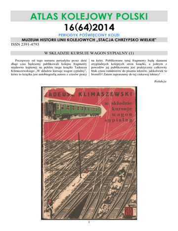 ATLAS KOLEJOWY POLSKI 16(64)2014 PERIODYK POŚWIĘCONY KOLEI MUZEUM HISTORII LINII KOLEJOWYCH „STACJA CHRZYPSKO WIELKIE" ISSN 2391-4793 W SKŁADZIE KURSUJE WAGON SYPIALNY (1) Począwszy od tego numeru periodyku przez dość długi czas będziemy publikowali kolejne fragmenty niedawno kupionej na pchlim targu książki Tadeusza Klimaszewskiego „W składzie kursuje wagon sypialny”, która to książka jest autobiografią autora z czasów pracy na kolei. Publikowane tutaj fragmenty będą skanami oryginalnych kolejnych stron książki, a jednym z powodów jej publikowania jest praktycznie całkowity brak czasu redaktorów do pisania tekstów, jakkolwiek to brzmi! Zatem zapraszamy do tej ciekawej lektury! Redakcja 1 2 3 4 5 6 UTKANE ZE STALI typ mostu: stalowy most kolejowy ilość przęseł: 1 przeszkoda: rzeka Reda konstrukcja przęsła: nitowana rodzaj przęsła: kratownica kratownica: dziewięciopolowa paraboliczna pomost jezdny: jazda górą ilość podpór: 2 materiał podpór: żelbet linia: nr 213 Reda – Hel; szlak: Reda – Mrzezino; odcinek: Reda – Reda Rekowo Most kolejowy nad rzeką Reda na linii kolejowej Reda – Hel Fotografował: Sławomir Fedorowicz (2011.03.27) GALERIA ODDZIAŁÓW NIEGOSPODAROWANIA NIERUCHOMOŚCIAMI PKP S.A. Fotografował: Sławomir Fedorowicz (2009.08.08) Linia 197. Dawny przystanek Lubsza Śląska. 7 ALBUM WIEŻ CIŚNIEŃ (64) Fotografował: Sławomir Fedorowicz (2009.05.02) Stacja wodna Kętrzyn. Periodyk redaguje zespół: Sławomir Fedorowicz, Hubert Waguła, Aldona Modrzewska, Ryszard Stankiewicz, Sylwester Pulik. Artykuły i zdjęcia do publikacji proszę przesyłać na adres e-mail: [email protected]; redakcja zastrzega sobie prawo do poprawiania tekstów i zmiany tytułów. Zapraszamy na stronę internetową www.atlaskolejowy.pl nr 64 – 2014.08.15 8