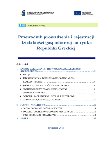 Przewodnik prowadzenia i rejestracji działalności gospodarczej na rynku Republiki Greckiej Spis treści 1. ZASADY ZAKŁADANIA I PROWADZENIA DZIAŁALNOŚCI GOSPODARCZEJ……………………………………………………………….….2 WSTĘP…………………………………………………………………………….2 JEDNOOSOBOWA DZIAŁALNOŚĆ GOSPODARCZA, SAMOZATRUDNIE…………………………………………………….………..4 SPÓŁKA CYWILNA I SPÓŁKA PARTNERSKA…………………………….5 SPÓŁKI OSOBOWE PRAWA HANDLOWEGO……………………………….6 SPÓŁKI KAPITAŁOWE………………………………………………………...13 ODDZIAŁ ZAGRANICZNEJ SPÓŁKI KAPITAŁOWEJ…………………….21 ZEZWOLENIA, KONCESJE, LICENCJE………………………………………23 2. SYSTEM PODATKOWY…………………………………………………………26 OPODATKOWANIE OSÓB PRAWNYCH……………………………………..28 PODATKI DOCHODOWE OD OSÓB FIZYCZNYCH……….……………….32 INNE REGULACJE PODATKOWE………………..……………..…………….34 3. ADRES………………………………………………………………………………37 Kwiecień 2013 1. ZASADY ZAKŁADANIA GOSPODARCZEJ I PROWADZENIA DZIAŁALNOŚCI WSTĘP Republika Grecka znajduje się w daleko odmiennej sytuacji niż pozostałe kraje członkowskie Unii Europejskiej zarówno pod względem sytuacji społeczno – gospodarczej jak i sfery regulacyjnej. Przed Grecją jest jeszcze długa droga do powrotu na ścieżkę wzrostu i zbliżenia do zasad funkcjonowania wszystkich sfer życia społecznogospodarczego do obowiązujących w pozostałych krajach UE, a szczególnie członków strefy Euro. W Grecji, podobnie jak i w innych krajach Unii Europejskiej prowadzenie działalności gospodarczej opiera się przede wszystkim na zasadzie wolności i równości, z zachowaniem przesłanek i ograniczeń określonych w obowiązujących przepisach prawa. Greckie prawo handlowe w dużej mierze nie jest skodyfikowane, nie istnieje także ustawa stanowiąca odpowiednik polskiej ustawy o działalności gospodarczej. Ogólnie system prawny składa się z wielu ustaw i rozporządzeń o charakterze szczególnym, które w ostatnim okresie ulegają bardzo licznym zmianom. W dobie poważnego kryzysu finansowego państwo greckie podejmuje wiele istotnych inicjatyw i reform ustawodawczych, aby zachęcić krajowych i zagranicznych inwestorów oraz stworzyć sprawny mechanizm w celu zmodernizowania, uproszczenia oraz znacznego skrócenia w czasie procedur rozpoczęcia działalności gospodarczej, w tym przede wszystkim w zakresie tworzenia spółek. Lata 2010-2012, to czas dużych zmian regulacyjnych, wdrażane i przygotowywane pakiety kolejnych reform mają na celu konsolidację finansów publicznych i ożywienie gospodarki. Wprowadzane zmiany legislacyjne dotyczą w szerokim zakresie zasad prowadzenia działalności gospodarczej. Pierwszym krokiem w tym kierunku była ustawa N 3853/2010, wprowadzająca bardzo istotne i pozytywne zmiany w procedurze tworzenia spółek na terenie Grecji. Główne zmiany: uproszczenie procedur zakładania przedsiębiorstw, skrócenie czasu procedur, zmiejszenie kosztów związanych z zakładaniem przedsiębiorstw, wdrożenie „One-Stop-Shop”. Od 01.04.2011 r. rozpoczął działalność Ogólny Rejestr Handlowy (ORH) odpowiadający w ograniczonym stopniu polskiemu KRS. Rejestr ten zawiera wszystkie najistotniejsze informacje odnośnie zarejestrowanych w nim spółek i jest połączony elektronicznie z greckimi urzędami, sądami, kasami ubezpieczeniowymi, stanowiąc elektroniczny obraz działalności gospodarczej w kraju. Dokonywane są w nim niezbędne publiczne ogłoszenia, które wcześniej należały do właściwości Drukarni Narodowej (np. statutu, uchwały o składzie zarządu oraz każdego innego dokumentu, podlegającego na mocy obowiązującego ustawodawstwa 2 ogłoszeniu), co bardzo znacznie ogranicza wymagany czas, aby zawiązać spółkę. Ponadto w ORH przedsiębiorstwa uzyskują jeden i niepowtarzalny numer rejestracyjny, który stanowi numer ich gospodarczej tożsamości. Po uruchomieniu działalności ORH weszła w życie wraz z niezbędnymi rozporządzeniami ministerialnymi i okólnikami - ustawa N.3853/2010, która wprowadziła bardzo istotne oraz pozytywne zmiany w procedurze zakładania większości (przewidziane są pewne wyjątki, zgodnie z uwagami poniżej) spółek osobowych i kapitałowych na terenie Grecji. Zgodnie z jej przepisami w celu przeprowadzenia w całości postępowania tworzenia spółek jawnych, spółek komandytowych, spółek akcyjnych i spółek z ograniczoną odpowiedzialnością powstały punkty jednolitej obsługi tzw. « Służby Jednego Okienka » - właściwe organy ORH. W konsekwencji przedsiębiorcy składają wymagane dokumenty do Służby JO, a następnie właściwi urzędnicy podejmują wymagane przez przepisy prawa czynności w celu utworzenia spółki. W ramach Służby JO zostali wyznaczeni notariusze, którzy świadczą notarialne usługi w zakresie sporządzania założycielskich aktów notarialnych /statutów spółek/ (dostępny jest elektronicznie katalog zatwierdzonych notariuszy: http://www.hellenicnotaryassociation.gr/). Przedmiotowa ustawa, mając na względzie przyspieszenie całego postępowania założycielskiego spółki wprowadziła także instytucję tzw. Pokwitowania Jednolitego Kosztu Utworzenia Spółki, czyli całościowej opłaty z tytułu administracyjnego postępowania założycielskiego spółki. Oczywiste jest, że zainteresowany przedsiębiorca, zanim ostatecznie zdecyduje się na rozpoczęcie konkretnej działalności gospodarczej na terenie Grecji, wcześniej powinien zwrócić się o porady finansowe i prawne do miejscowych specjalistów oraz skontaktować się z właściwą branżowo Izbą (np. Przemysłowo - Handlową, H