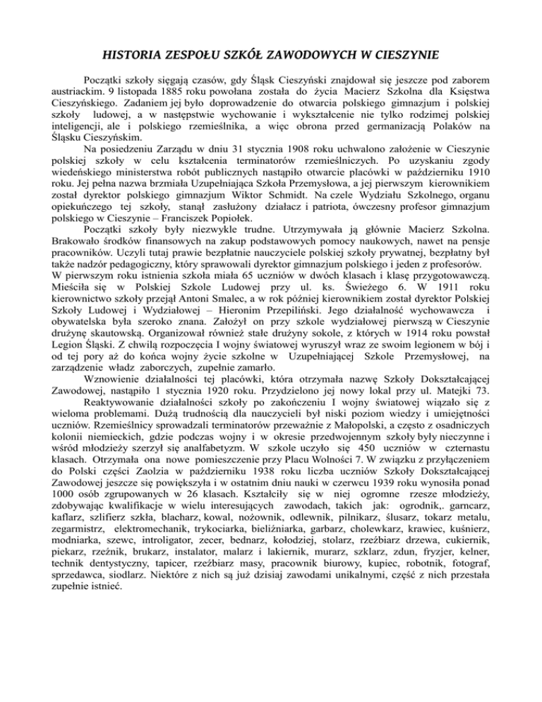 HISTORIA ZESPOŁU SZKÓŁ ZAWODOWYCH W CIESZYNIE Początki szkoły sięgają czasów, gdy Śląsk Cieszyński znajdował się jeszcze pod zaborem austriackim. 9 listopada 1885 roku powołana została do życia Macierz Szkolna dla Księstwa Cieszyńskiego. Zadaniem jej było doprowadzenie do otwarcia polskiego gimnazjum i polskiej szkoły ludowej, a w następstwie wychowanie i wykształcenie nie tylko rodzimej polskiej inteligencji, ale i polskiego rzemieślnika, a więc obrona przed germanizacją Polaków na Śląsku Cieszyńskim. Na posiedzeniu Zarządu w dniu 31 stycznia 1908 roku uchwalono założenie w Cieszynie polskiej szkoły w celu kształcenia terminatorów rzemieślniczych. Po uzyskaniu zgody wiedeńskiego ministerstwa robót publicznych nastąpiło otwarcie placówki w październiku 1910 roku. Jej pełna nazwa brzmiała Uzupełniająca Szkoła Przemysłowa, a jej pierwszym kierownikiem został dyrektor polskiego gimnazjum Wiktor Schmidt. Na czele Wydziału Szkolnego, organu opiekuńczego tej szkoły, stanął zasłużony działacz i patriota, ówczesny profesor gimnazjum polskiego w Cieszynie – Franciszek Popiołek. Początki szkoły były niezwykle trudne. Utrzymywała ją głównie Macierz Szkolna. Brakowało środków finansowych na zakup podstawowych pomocy naukowych, nawet na pensje pracowników. Uczyli tutaj prawie bezpłatnie nauczyciele polskiej szkoły prywatnej, bezpłatny był także nadzór pedagogiczny, który sprawowali dyrektor gimnazjum polskiego i jeden z profesorów. W pierwszym roku istnienia szkoła miała 65 uczniów w dwóch klasach i klasę przygotowawczą. Mieściła się w Polskiej Szkole Ludowej przy ul. ks. Świeżego 6. W 1911 roku kierownictwo szkoły przejął Antoni Smalec, a w rok później kierownikiem został dyrektor Polskiej Szkoły Ludowej i Wydziałowej – Hieronim Przepiliński. Jego działalność wychowawcza i obywatelska była szeroko znana. Założył on przy szkole wydziałowej pierwszą w Cieszynie drużynę skautowską. Organizował również stałe drużyny sokole, z których w 1914 roku powstał Legion Śląski. Z chwilą rozpoczęcia I wojny światowej wyruszył wraz ze swoim legionem w bój i od tej pory aż do końca wojny życie szkolne w Uzupełniającej Szkole Przemysłowej, na zarządzenie władz zaborczych, zupełnie zamarło. Wznowienie działalności tej placówki, która otrzymała nazwę Szkoły Dokształcającej Zawodowej, nastąpiło 1 stycznia 1920 roku. Przydzielono jej nowy lokal przy ul. Matejki 73. Reaktywowanie działalności szkoły po zakończeniu I wojny światowej wiązało się z wieloma problemami. Dużą trudnością dla nauczycieli był niski poziom wiedzy i umiejętności uczniów. Rzemieślnicy sprowadzali terminatorów przeważnie z Małopolski, a często z osadniczych kolonii niemieckich, gdzie podczas wojny i w okresie przedwojennym szkoły były nieczynne i wśród młodzieży szerzył się analfabetyzm. W szkole uczyło się 450 uczniów w czternastu klasach. Otrzymała ona nowe pomieszczenie przy Placu Wolności 7. W związku z przyłączeniem do Polski części Zaolzia w październiku 1938 roku liczba uczniów Szkoły Dokształcającej Zawodowej jeszcze się powiększyła i w ostatnim dniu nauki w czerwcu 1939 roku wynosiła ponad 1000 osób zgrupowanych w 26 klasach. Kształciły się w niej ogromne rzesze młodzieży, zdobywając kwalifikacje w wielu interesujących zawodach, takich jak: ogrodnik,. garncarz, kaflarz, szlifierz szkła, blacharz, kowal, nożownik, odlewnik, pilnikarz, ślusarz, tokarz metalu, zegarmistrz, elektromechanik, trykociarka, bieliźniarka, garbarz, cholewkarz, krawiec, kuśnierz, modniarka, szewc, introligator, zecer, bednarz, kołodziej, stolarz, rzeźbiarz drzewa, cukiernik, piekarz, rzeźnik, brukarz, instalator, malarz i lakiernik, murarz, szklarz, zdun, fryzjer, kelner, technik dentystyczny, tapicer, rzeźbiarz masy, pracownik biurowy, kupiec, robotnik, fotograf, sprzedawca, siodlarz. Niektóre z nich są już dzisiaj zawodami unikalnymi, część z nich przestała zupełnie istnieć. Uroczystość zakończenia roku szkolnego 1937/38 w Publicznej Szkole Dokształcającej Zawodowej przed budynkiem na Placu Wolności 7. Już w maju 1945 roku przystąpiono do odbudowy i reorganizacji placówki. Wkrótce okazało się, że budynek ten dla szkoły zawodowej jest nadal za mały i przeniesiono ją na ul. Frysztacką, a funkcjonujące tam Gimnazjum Mechaniczno-Elektryczne otrzymało nową siedzibę przy Placu Kościelnym. Zarządzeniem Dyrekcji Okręgowej Szkolenia Zawodowego w Katowicach z dnia 3 października 1951 roku powołano do życia dwuletnią Zasadniczą Szkołę Zawodową (w miejscu zlikwidowanych szkół średnich), którą otwarto 1 września 1952 roku. Dyrektorem został Jan Kotajny. W roku 1954/55 przeprowadzono adaptację budynku przy ul. Frysztackiej 241 na internat szkoły (remont i centralne ogrzewanie). Od 1955 roku nastąpiła zmiana nazwy szkoły na Zasadniczą Szkołę Mechanizacji Rolnictwa. Począwszy od 1956 roku zaczęto wprowadzać trzyletni okres szkolenia zawodowego. Również w tym roku przeniesiono warsztaty elektryczne z suteren budynku 239 (głównego) do nowej hali warsztatowej. Kolejne lata przynosiły zmiany nazwy szkoły oraz otwarcie szkół przyzakładowych. Plan zagospodarowania terenów szkoły przy ul. Frysztackiej w 1959 roku (wg szkicu P. Cichego). Grono Pedagogiczne Zasadniczej Szkoły Mechanizacji Rolnictwa w Cieszynie w roku 1959. Siedzą od lewej: Józef Śliż, Jan Sikora, Roman Lipka, Stanisława Bazała, Władysłwa Sikorowa, Paweł Cichy, Jan Kotajny, Anna Hławiczka. Stoją od lewej: Antoni Macura, Wiesław Majewski, Zdzisław Bogdanowicz, Bronisław Bassa, Antoni Białoń, Antoni Wojewodzic, Kazimierz Płon-ka, Leopold Kamtor, Alfred Cieślar, Adam Lubojacki. W trzecim rzędzie od lewej stoją: Jan Mrózek, Józef Sadlok, Andrzej Penkała, Emil Maryan, Alojzy Kula, Bolesław Fedyczkowski, Adolf Malina, Karol Budni