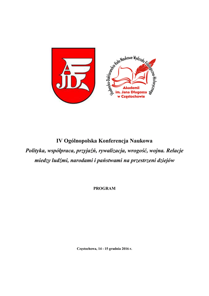 IV Ogólnopolska Konferencja Naukowa Polityka, współpraca, przyjaźń, rywalizacja, wrogość, wojna. Relacje miedzy ludźmi, narodami i państwami na przestrzeni dziejów PROGRAM Częstochowa, 14 - 15 grudnia 2016 r. PATRONAT HONOROWY PATRONAT MEDIALNY Dzień I 14 grudnia 2016 r. (środa) 10:00 - 11:00 Uroczyste otwarcie konferencji (Sala Rady Wydziału) Wykład inauguracyjny wygłosi prof. dr hab. Andrzej Stroynowski. Temat wykładu: Polityka, współpraca, przyjaźń, rywalizacja, wrogość, wojna. Car Aleksy Michajłowicz a Rzeczypospolita Sesja przedpołudniowa sala 26 Prowadzący: mgr Marcin Kościelniak, mgr Dorota Chmielewska 11:00 - 11:15 - mgr Katarzyna Piotrowska (Akademia im. Jana Długosza w Częstochowie) - Polska i niemiecka debata wokół fenomenu kobiecego pisarstwa po 1989 roku 11:15 - 11:30 - mgr Ewelina Ślązak (Uniwersytet Łódzki) - Łódzka prasa podziemna w latach 80 XX wieku 11:30 - 11:45 - mgr Zbigniew Sperka (Akademia im. Jana Długosza w Częstochowie) Proces scalania Policji Państwowej 11:45 - 12:00 - mgr Marzena Leżak (Uniwersytet Opolski) - Stosunek władz obozowych do noworodków w KL Auschwitz-Birkenau 12:00 - 12:15 - mgr Julita Paprotna (Akademia im. Jana Długosza w Częstochowie) Boskie Matki Polki – macierzyństwo w powstańczej Warszawie w najnowszej literaturze 12:15 - 12:30 dyskusja 12:30 - 12:45 przerwa na kawę 12:45 - 13:00 - mgr Monika Piątek (Akademia im. Jana Długosza w Częstochowie) Polityka okupanta hitlerowskiego wobec Polaków w latach 1939 – 1941 13:00 - 13:15 - mgr Katarzyna Kaczmarek (Uniwersytet Opolski) - Edukacja młodzieży podczas okupacji radzieckiej i niemieckiej w latach 1939-1945 na Zniesieniu 13:15 - 13:30 - mgr Marlena Kowalska (Uniwersytet Rzeszowski) - Strapaese vs. Stracittà – wycinek z międzywojennej włoskiej prasy 13:30 - 13:45 - mgr Dorota Chmielewska (Akademia im. Jana Długosza w Częstochowie) - Rewitalizacja Radomska w pracach miejskiego samorządu w latach 1919 – 1939 13:45 - 14:00 dyskusja 14:00 - 15:00 przerwa na obiad Sesja popołudniowa sala 26 Prowadzący: mgr Monika Modłasiak, mgr Zbigniew Sperka 15:00 - 15:15 - mgr Norbert Kępiński (Akademia im. Jana Długosza w Częstochowie) Działania na rzecz dzieci i sierot w Częstochowie w okresie międzywojennym 15:15 - 15:30 - mgr Ewa Rogala (Akademia im. Jana Długosza w Częstochowie) - Próby porozumień polsko – czeskich od zakończenia I wojny światowej do przyłączenia Zaolzia do Czechosłowacji 15:30 - 15:45 - mgr Wojciech Grajewski (Akademia im. Jana Długosza w Częstochowie) - U progu wieku konfliktów. Krwawa niedziela w Cieszynie roku 1908 15:45 - 16:00 - mgr Martyna Ujma (Akademia im. Jana Długosza w Częstochowie) Antoniego Słonimskiego głos w sprawie faszyzmu, totalitaryzmu oraz stosunków polsko-niemieckich i polsko-żydowskich początku XX wieku - na przykładzie twórczości 16:00 - 16:15 - mgr Szymon Wachoń (Uniwersytet Łódzki) - Dyplomacja Władysława IV Wazy wobec Szwecji w pierwszych latach jego panowania 16:15 - 16:30 - mgr Paweł Derejczyk (Akademia im. Jana Długosza w Częstochowie) Bitwa pod Hastings, geniusz taktyczny księcia Wilhelma, czy zwykły przypadek? 16:30 - 16:45 dyskusja 16:45 - 17:15 przerwa na kawę Prowadzący: mgr Justyna Migoń Sasuła, mgr Łukasz Sasuła 17:15 - 17:30 - mgr Norbert Bociański (Akademia im. Jana Długosza w Częstochowie) Pojęcie cnoty w traktacie Daodejing 17:30 - 17:45 - mgr Krzysztof Sacała (Uniwesytet Rzeszowski) - Między hiperboreą, a xeniteą. Emigracja grecka po upadku Cesarstwa Bizantyjskiego na południowo-wschodnich ziemiach Rzeczpospolitej (1527-1573) 17:45 - 18:00 - mgr Łukasz Sasuła (Akademia im. Jana Długosza w Częstochowie) Konflikty i spory historyczne w narracjach gier wideo 18:00 - 18:15 - mgr Justyna Migoń-Sasuła (Akademia im. Jana Długosza w Częstochowie) - Obraz kobiet w dziełach Prokopiusza z Cezarei 18:15 - 18:30 - mgr Irena Koza (Akademia im. Jana Długosza w Częstochowie) - Tadeusz Bułharyn – zdrajca czy przyjaciel XIX-wiecznej Polski i Rosji? 18:30 - 18:45 dyskusja Dzień II 15 grudnia 2015 r. (czwartek) Sesja przedpołudniowa sala 119 Prowadzący: mgr Wiktoria Skwara - Tomzik, mgr Norbert Bociański 10:00 - 10:15 - mgr Ewelina Bekus (Akademia im. Jana Długosza w Częstochowie) Biskupi diecezji częstochowskiej wobec problemu budownictwa sakralnego na terenie Częstochowy w okresie PRL 10:15 - 10:30 - mgr Łukasz Majewski (Akademia im. Jana Długosza w Częstochowie) PRL-owska bezpieka wobec biskupa wrocławskiego Pawła Latuska 10:30 -10:45 - mgr Izabela Dudek (Akademia im. Jana Długosza w Częstochowie) Analiza relacji międzyludzkich w Libii w latach 30 XX wieku na przykładzie pracy "Rowerem i pieszo przez czarny ląd. Listy z podróży afrykańskiej z lat 1931-1936" 10:45 - 11:00 - mgr Dawid Dziurkowski (Akademia im. Jana Długosza w Częstochowie) - Wpływ współczesnych demokratycznych systemów i modeli politycznych na unormowanie, orzekanie i wykonywanie kar śmierci 11:00 - 11:15 - mgr Rafał Terszak (Akademia im. Jana Długosza w Częstochowie) Likwidacja następstw kultu jednostki Stalina po 1953 roku 11:15 - 11:30 dyskusja 11:30 - 11:45 przerwa na kawę Prowadzący: dr Tomasz Ładoń, mgr Katarzyna Całus 11:45 - 12:00 - mgr Marzena Forma (Akademia im. Jana Długosza w Częstochowie) Kontrowersje wokół Wandy Wasilewskiej 12:00 - 12:15 - mgr Mateusz Pawlak (Akademia im. Jana Długosza w Częstochowie) Sport jako norma i patologia w niemieckim obozie koncentracyjnym Auschwitz – Birkenau 12:15 12:30 - mgr Justyna Drozdek (Akademia im. Jana Długosza w Częstochowie) Działalność rodu Wűnsche na terenie Radomska i okolic 12:30 - 12:45 - mgr Marcin Kościelniak (Akademia im. Jana Długosza w Częstochowie) - Tygodnik Katolicki „Niedziela” 1989 – 2014 12:45 - 13:00 - mgr Wiktoria Skwara -Tomzik (Akademia im. Jana Długosza w Częstochowie) - Donosy na osoby podejrzane o szpiegostwo w województwie śląski