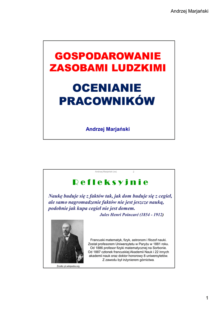 Andrzej Marjański GOSPODAROWANIE ZASOBAMI LUDZKIMI OCENIANIE PRACOWNIKÓW Andrzej Marjański Andrzej Marjański (xx) 2 Refleksyjnie Naukę buduje się z faktów tak, jak dom buduje się z cegieł, ale samo nagromadzenie faktów nie jest jeszcze nauką, podobnie jak kupa cegieł nie jest domem. Jules Henri Poincaré (1854 - 1912) Francuski matematyk, fizyk, astronom i filozof nauki. Został profesorem Uniwersytetu w Paryżu w 1881 roku. Od 1886 profesor fizyki matematycznej na Sorbonie. Od 1887 członek francuskiej Akademii Nauk i 22 innych akademii nauk oraz doktor honorowy 8 uniwersytetów. Z zawodu był inżynierem górnictwa. Źrodło: pl.wikipedia.org 1 Andrzej Marjański Andrzej Marjański (xx) 3 Agenda Istota i proces oceniania pracowników Ocena bieżąca Ocena okresowa Projektowanie ocen okresowych Metody absolutne i relatywne Procedura oceniania Wykorzystywanie ocen pracowniczych Andrzej Marjański (xx) 4 Istota oceniania pracowników Ocenianie – jedno z najbardziej rozpowszechnionych działań w praktyce funkcjonowania organizacji Pracownicy oceniają: Samych siebie Innych członków organizacji Pracownicy są oceniani przez: Bezpośredniego przełożonego Kierownictwo Kolegów z własnego i innych zespołów 2 Andrzej Marjański Andrzej Marjański (xx) 5 Istota oceniania pracowników Ocena pracownika jest ściśle powiązana z wykonywaniem funkcji kierowniczych Kierownicy stają ciągle przed problemem jak dokonywać ocen aby stały się efektywnym elementem zarządzania zasobami ludzkimi Ocena występuje we wszystkich etapach zarządzania Kandydaci do pracy Pracownicy zatrudnieni w stosunku do których panujemy decyzje personalne Zmiana stanowiska pracy Włączenie w procesy szkolenia i rozwoju Wprowadzenie instrumentów motywowania Zwolnienie * Andrzej Marjański (xx) 6 Pojęcie oceny pracowników Sąd wartościujący, wykorzystywany w procesie zarządzania, który powstaje w wyniku porównywania Cech Kwalifikacji Zachowań Efektów pracy konkretnego pracownika W odniesieniu do innych pracowników bądź też do ustalonego wzorca (standardu) * 3 Andrzej Marjański Andrzej Marjański (xx) 7 Funkcje, cele i zasady oceniania Podstawowe funkcje oceniania: Ewaluacyjna – ocena expost oraz ocena bieżącej efektywności i jakości pracy podwładnego oraz jego postaw i zachowań Rozwojowa – pozwala ocenić potencjał rozwojowy pracownika i jego umiejętności oraz chęć współpracy, pełni funkcję motywacyjną oferując informację zwrotną dla pracownika * Andrzej Marjański (xx) 8 Funkcje, cele i zasady oceniania Podstawowe cele oceniania: Informacyjne – związane ze sposobami i kierunkami wykorzystywania wyników okresowych ocen przez organizacje Psychospołeczne – przekazywanie informacji zwrotnych pomiędzy przełożonymi a podwładnymi, traktowanie sposobów oceniania i ich wykorzystywania jako ważnego instrumentu motywowania pracowników * 4 Andrzej Marjański Andrzej Marjański (xx) 9 Rodzaje oceny pracowników Ocena bieżąca – dokonywana przez bezpośredniego przełożonego lub kierownictwo firmy Ma charakter sytuacyjny i ciągły Dokonywana w ramach zarządzania operatywnego Potrzeby oceny na ogół nie podlegają planowaniu Niesformalizowany charakter Opiera się na wybranych kryteriach oceny Andrzej Marjański (xx) 10 Rodzaje oceny pracowników Ocena okresowa – dokonywana co pewien czas w sposób kompleksowy Wykorzystuje określone utrwalone i powtarzalne zasady, narzędzia i procedury Obejmuje całokształt efektów pracy ocenianego pracownika (umiejętności i postawy wobec pracy) 5 Andrzej Marjański Andrzej Marjański (xx) 11 Ocena okresowa Zbiór celowo dobranych i wzajemnie powiązanych elementów mających na celu zwiększenie efektywności bieżącego i strategicznego zarządzania zasobami ludzkimi w kontekście misji i celów organizacji System ocen składa się ze świadomie i logicznie dobranych elementów takich jak: Cele Zasady Kryteria Metody Procedury oceniania pracowników * Andrzej Marjański (xx) 12 Powiązania sytemu ocen pracowniczych System ocen pracowniczych jest układem otwartym powiązanym z: Pozostałymi elementami zarządzania zasobami ludzkimi Strategia podmiotu Kulturą Strukturą organizacyjną Wprowadzenie formalnego okresowego systemu ocen niesie daleko idące konsekwencje zarówno dla organizacji jak i pracowników Duże wymagania dla kierownictwa – znajomość systemu przez pracowników, konsekwentne stosowanie * 6 Andrzej Marjański Andrzej Marjański (xx) 13 Fazy wdrażania systemu ocen pracowniczych Projektowanie Wdrażanie Wykorzystywanie systemu Wszystkie fazy są równie ważne – popełnienie błędu w którejkolwiek z nich negatywnie wpływa na funkcjonowanie całego systemu Uzyskanie pozytywnego efektu wymaga dobrej współpracy kadry organizacji z ekspertami zewnętrznymi * Andrzej Marjański (xx) 14 Fazy wdrażania systemu ocen pracowniczych Faza 1 – projektowanie systemu cele okresowych ocen zasady okresowych ocen przedmiot i podmiot okresowych ocen procedura oceniania 7 Andrzej Marjański Andrzej Marjański (xx) 15 Fazy wdrażania systemu ocen pracowniczych Faza 2 – wdrażanie systemu przygotowanie psychospołeczne przygotowanie merytoryczne przygotowanie organizacyjne przeprowadzenie okresowych ocen opracowanie wyników okresowych ocen Andrzej Marjański (xx) 16 Fazy wdrażania systemu ocen pracowniczych Faza 3 – wykorzystanie systemu stawianie zadań i podnoszenie efektów pracy przemieszczenia pracowników motywowanie pracowników (nagrody i kary) rozwój pracowników doskonalenie systemu informacji kadrowej strategia personalna Faza 1 – projektowanie systemu 8 Andrzej Marjański Andrzej Marjański (xx) 17 Projektowanie okresowych ocen Ustalanie poszczególnych elementów składowych systemu ocen pracowniczych i wzajemnych powiązań między nimi Powiązanie ocen pracowniczych z procesem zarządzania zasobami ludzkimi w organizacji Uwzględnienie specyfiki danej organizacji: Strategii person
