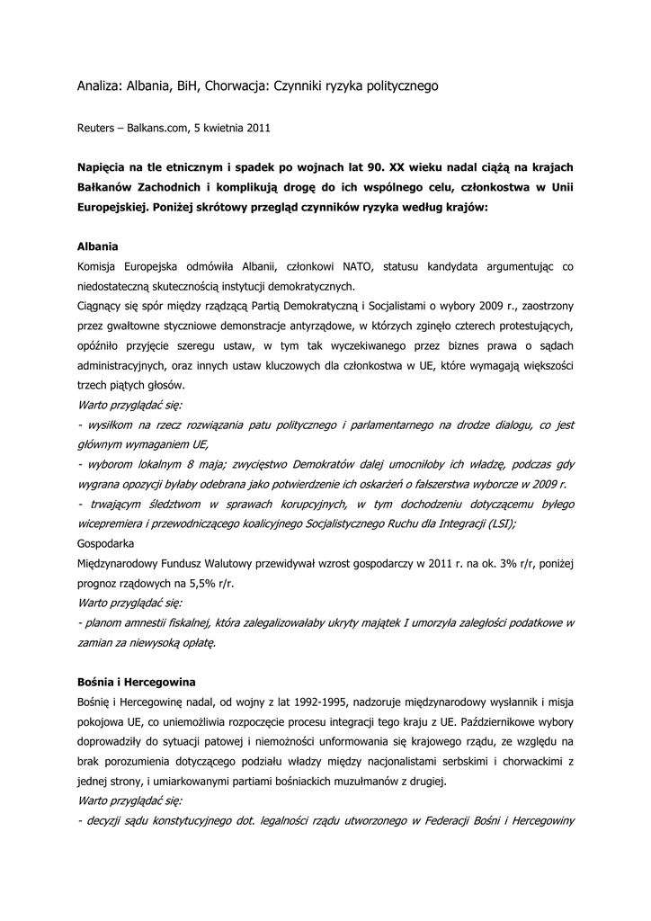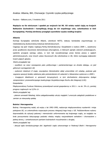 Analiza: Albania, BiH, Chorwacja: Czynniki ryzyka politycznego Reuters – Balkans.com, 5 kwietnia 2011 Napięcia na tle etnicznym i spadek po wojnach lat 90. XX wieku nadal ciążą na krajach Bałkanów Zachodnich i komplikują drogę do ich wspólnego celu, członkostwa w Unii Europejskiej. Poniżej skrótowy przegląd czynników ryzyka według krajów: Albania Komisja Europejska odmówiła Albanii, członkowi NATO, statusu kandydata argumentując co niedostateczną skutecznością instytucji demokratycznych. Ciągnący się spór między rządzącą Partią Demokratyczną i Socjalistami o wybory 2009 r., zaostrzony przez gwałtowne styczniowe demonstracje antyrządowe, w którzych zginęło czterech protestujących, opóźniło przyjęcie szeregu ustaw, w tym tak wyczekiwanego przez biznes prawa o sądach administracyjnych, oraz innych ustaw kluczowych dla członkostwa w UE, które wymagają większości trzech piątych głosów. Warto przyglądać się: - wysiłkom na rzecz rozwiązania patu politycznego i parlamentarnego na drodze dialogu, co jest głównym wymaganiem UE, - wyborom lokalnym 8 maja; zwycięstwo Demokratów dalej umocniłoby ich władzę, podczas gdy wygrana opozycji byłaby odebrana jako potwierdzenie ich oskarżeń o fałszerstwa wyborcze w 2009 r. - trwającym śledztwom w sprawach korupcyjnych, w tym dochodzeniu dotyczącemu byłego wicepremiera i przewodniczącego koalicyjnego Socjalistycznego Ruchu dla Integracji (LSI); Gospodarka Międzynarodowy Fundusz Walutowy przewidywał wzrost gospodarczy w 2011 r. na ok. 3% r/r, poniżej prognoz rządowych na 5,5% r/r. Warto przyglądać się: - planom amnestii fiskalnej, która zalegalizowałaby ukryty majątek I umorzyła zaległości podatkowe w zamian za niewysoką opłatę. Bośnia i Hercegowina Bośnię i Hercegowinę nadal, od wojny z lat 1992-1995, nadzoruje międzynarodowy wysłannik i misja pokojowa UE, co uniemożliwia rozpoczęcie procesu integracji tego kraju z UE. Październikowe wybory doprowadziły do sytuacji patowej i niemożności unformowania się krajowego rządu, ze względu na brak porozumienia dotyczącego podziału władzy między nacjonalistami serbskimi i chorwackimi z jednej strony, i umiarkowanymi partiami bośniackich muzułmanów z drugiej. Warto przyglądać się: - decyzji sądu konstytucyjnego dot. legalności rządu utworzonego w Federacji Bośni i Hercegowiny przez umiarkowane partie muzułmańskie i chorwackie, bez udziału głównych ugrupowań chorwackich. - sytuacji gospodarczej i postępom w integracji europejskiej zagrożonym przez niepewność spowodowaną przez niepewność wziązaną z rządem Federacji, która opóźnia utworzenie rządu centralnego. Gospodarka Bośnia i Hercegowina stara się warunków umowy z MFW dot. kredytu stabilizacyjnego w wysokości 1,2 miliarda euro. W 2010 r. BiH odnotowała wzrost gospodarczy ok. 1% r.r, znacznie niższy niż 2,8% w roku 2009. Oczekuje się, że w 2011 r. gospodarka kraju urośnie o 2,2%. W marcu przyjęto tymczasowy plan finansowy na drugi kwartał, jednak opóźnienia w formowaniu się centralnego rzadu stawiają pod znakiem zapytania przyjęcie budżetu na rok 2011 latem tego roku. Brak rządu uniemożliwia również Bośni i Hercegowinie lub jej regionom ubieganie się o kredyty z MFW czy Komisji Europejskiej, które miały być jednym ze źródeł finansowania wydatków budżetowych w bieżącym roku. Chorwacja Celem Chorwacji jest zakończenie negocjacji akcesyjnych z UE w czerwcu br., i przystąpienie do Wspólnoty w 2013 r., jednak Unia nalega na dalsze reformy systemu sądowego, walkę z korupcją i sprzedaż silnie dotowanych państwowych stoczni. Część unijnych dyplomatów przewiduje koniec negocjacji na jesień. Rządząca konserwatywna koalicja wydaje się być stabilna, i prawdopodobnie dotrwa u władzy do końca roku mimo antyrządowych protestów. Warto przyglądać się: - ewentualnym opóźnieniom w negocjacjach z UE lub nagłemu pogorszeniu sytuacji gospodarczej i ew. wzrostowi bezrobocia ponad aktualne 19,6^, które mogłyby doprowadzić do wcześniejszych wyborów. Część partii opozycyjnych uważa, że data wyborów powinna zostać ogłoszona jak najszybciej, szczególnie w przypadku, gdyby koalicji nie udało się zakończyć negocjacji z UE w czerwcu. Gospodarka Gospodarka Chorwacji skurczyła się o 5,8% r/r w 2009 r. i o 1,4% r/r w 2010. W tym roku przewiduje się wzrost ok. 1,5% r/r. Dług publiczny przekroczył 40% PKB I nadal rośnie. Chorwacka kuna jest stabilna. Mimo pozytywnych prognoz wzrostu gospodarczego na ten rok, brak reform i ograniczenia wydatków grozi stagnacją lub długim okresem niskiego wzrostu. Warto przyglądać się: - planom emisji obligacji rządowych. Po emisji w wartości 1,5 miliarda dolarów w marcu, rząd planuje zaoferować euroobligacje w niższej kwocie jeszcze wiosną. Tłum. i red. Mjk, zdjęcie www.rcsileadership.org.