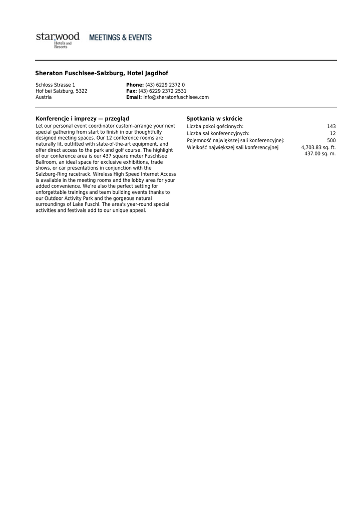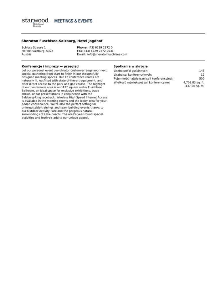 Sheraton Fuschlsee-Salzburg, Hotel Jagdhof Schloss Strasse 1 Hof bei Salzburg, 5322 Austria Phone: (43) 6229 2372 0 Fax: (43) 6229 2372 2531 Email: [email protected] Konferencje i imprezy — przegląd Spotkania w skrócie Let our personal event coordinator custom-arrange your next special gathering from start to finish in our thoughtfully designed meeting spaces. Our 12 conference rooms are naturally lit, outfitted with state-of-the-art equipment, and offer direct access to the park and golf course. The highlight of our conference area is our 437 square meter Fuschlsee Ballroom, an ideal space for exclusive exhibitions, trade shows, or car presentations in conjunction with the Salzburg-Ring racetrack. Wireless High Speed Internet Access is available in the meeting rooms and the lobby area for your added convenience. We’re also the perfect setting for unforgettable trainings and team building events thanks to our Outdoor Activity Park and the gorgeous natural surroundings of Lake Fuschl. The area's year-round special activities and festivals add to our unique appeal. Liczba pokoi gościnnych: Liczba sal konferencyjnych: Pojemność największej sali konferencyjnej: Wielkość największej sali konferencyjnej 143 12 500 4,703.83 sq. ft. 437.00 sq. m. Sheraton Fuschlsee-Salzburg, Hotel Jagdhof Schloss Strasse 1 Hof bei Salzburg, 5322 Austria Phone: (43) 6229 2372 0 Fax: (43) 6229 2372 2531 Email: [email protected] Specyfikacja szczegółowa Nieruchomości Typ obiektu Urban Liczba sal konferencyjnych 12 Rok budowy 1994 Całkowita wielkość sal konferencyjnych 1,001.00 sq. m. 10,774.67 sq. ft. Liczba budynków 3 Wielkość największej sali konferencyjnej 437.00 sq. m. 4,703.83 sq. ft. Liczba pięter 3 Pojemność największej sali konferencyjnej 500 Golf Array Pojemność najmniejszej sali konferencyjnej 48.00 sq. m. 516.67 sq. ft. Dedykowany hall wystawowy 1 Pojemność najmniejszej sali konferencyjnej 10 Pokoje gościnne Data zameldowania 3:00 PM Internet w pokoju Data wymeldowania 12:00 PM Liczba pokoi gościnnych 143 Udogodnienia Centrum odnowy biologicznej / Centrum Fitness Sheraton Fitness Nazwa basenu Indoor Pool Basen Yes Lokalne & atrakcje Strefa czasowa C Pobliskie lotniska W. A. Mozart Airport Kod lotniska SZG 17.70 Odległość od Kilometers lotniska 11.00 Miles Obszar lokalny Mozart, festivals, the historical Christmas market—the Salzburg region is alive with vibrant cultural traditions and spirited adventure. Situated high above Lake Fuschl, our hotel offers a magnificent view over the water and the Salzkammergut Mountains. Our central location makes us the perfect departure point for excursions to Mozart’s birthplace of Salzburg, or for exploring the beautiful SalzburgerLand and Salzkammergut region. The festival city of Salzburg (25 km), the famous spa town Bad Ischl (34 km), and the village of Fuschl am See are all easily accessible by car. Our hotel golf course offers nine scenic holes, plus 10 other golf courses are within a half-hour of our door. Opłaty & podatki Waluta lokalna Euro Kod waluty EUR Metody płatności • VISA • MASTER CARD • DINERS/SUNDIN/AMOCO • AMEX / OPTIMA Sheraton Fuschlsee-Salzburg, Hotel Jagdhof Schloss Strasse 1 Hof bei Salzburg, 5322 Austria Phone: (43) 6229 2372 0 Fax: (43) 6229 2372 2531 Email: [email protected] Capacity Charts Room Name Key Dim. (l x w) Area Height Banq. Thtr. Executive Boardroom - 9.80 m. x 5.25 m.32.15 ft. x 17.22 ft. 48.00 sq. m. 516.67 sq. ft. 3.00 m. 9.84 ft. 10 - Filbingsee 1 - 8.65 m. x 5.60 m.28.38 ft. x 18.37 ft. 50.00 sq. m. 538.20 sq. ft. 2.95 m. 9.68 ft. 30 42 Filbingsee 1-3 - 7.55 m. x 17.55 m.24.77 ft. x 57.58 ft. 150.00 sq. m. 1,614.59 sq. ft. 2.95 m. 9.68 ft. 80 154 Filbingsee 2 - 8.65 m. x 5.60 m.28.38 ft. x 18.37 ft. 50.00 sq. m. 538.20 sq. ft. 2.95 m. 9.68 ft. 30 42 Filbingsee 3 - 8.65 m. x 5.60 m.28.38 ft. x 18.37 ft. 50.00 sq. m. 538.20 sq. ft. 2.95 m. 9.68 ft. 30 42 Fuschlsee 1 - 14.82 m. x 9.90 m.48.62 ft. x 32.48 ft. 146.00 sq. m. 1,571.53 sq. ft. 3.75 m. 12.30 ft. 80 150 Fuschlsee 1-3 - 14.82 m. x 29.80 m.48.62 ft. x 97.77 ft. 437.00 sq. m. 4,703.83 sq. ft. 3.75 m. 12.30 ft. 300 500 Fuschlsee 2 - 14.82 m. x 10.00 m.48.62 ft. x 32.81 ft. 148.00 sq. m. 1,593.06 sq. ft. 3.75 m. 12.30 ft. 80 150 Fuschlsee 3 - 14.82 m. x 9.70 m.48.62 ft. x 31.82 ft. 143.00 sq. m. 1,539.24 sq. ft. 3.75 m. 12.30 ft. 70 140 Gosausee 1 - 5.75 m. x 10.60 m.18.86 ft. x 34.78 ft. 58.00 sq. m. 624.31 sq. ft. 2.90 m. 9.51 ft. 30 56 Gosausee 1-2 - 5.75 m. x 21.80 m.18.86 ft. x 71.52 ft. 113.00 sq. m. 1,216.32 sq. ft. 2.90 m. 9.51 ft. 70 136 Gosausee 2 - 5.75 m. x 9.40 m.18.86 ft. x 30.84 ft. 55.00 sq. m. 592.02 sq. ft. 3.00 m. 9.84 ft. 30 48 Toplitzsee - 7.85 m. x 9.85 m.25.75 ft. x 32.32 ft. 77.00 sq. m. 828.82 sq. ft. 3.50 m. 11.48 ft. 70 60 Traunsee 1 - 8.95 m. x 9.85 m.29.36 ft. x 32.32 ft. 88.00 sq. m. 947.22 sq. ft. 3.00 m. 9.84 ft. 60 72 Traunsee 1-2 - 8.95 m. x 19.75 m.29.36 ft. x 64.80 ft. 176.00 sq. m. 1,894.45 sq. ft. 3.00 m. 9.84 ft. 120 180 Traunsee 2 - 8.95 m. x 9.85 m.29.36 ft. x 32.32 ft. 88.00 sq. m. 947.22 sq. ft. 3.00 m. 9.84 ft. 60 72 Wallersee 8.35 m. x 3.70 m.27.40 ft. x 12.14 ft. - 30.00 sq. m. 322.92 sq. ft. 2.90 m. 9.51 ft. - 20 Room Name Conf. Rec. Class U-Shp. H. Sq. Dinner Dance Wallersee - - - - - - Wallersee 10 - 24 - - - Wallersee - 100 80 38 - 80 Wallersee 10 - 24 - - - Wallersee 10 - 24 - - - Wallersee - - 80 35 - - Wallersee - 700 300 - - 300 Wallersee - - 80 35 - 80 Wallersee - - 70 35 - 70 Wallersee 20 - 30 23 - - Wallersee - 80 72 30 - 70 Wallersee 18 - 24 - - - Wallersee - - - 30 - 60 Wallersee - 70 32 22 - - Wallersee - 160 88 44 - 120 Wallersee - 70 32 22 - - Wallersee 10 - 12 10 - -