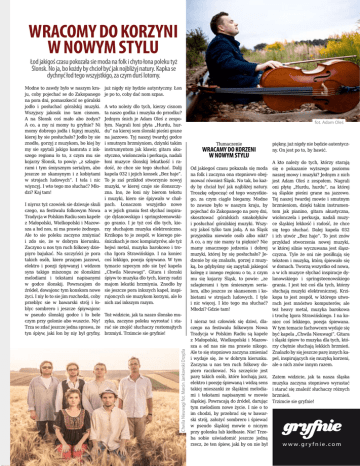Wracomy do korzyni w nowym stylu Łod jakigoś czasu pokozała sie moda na folk i chyto łona poleku tyż Ślonsk. No ja, bo kożdy by chcioł być jak nojbliżyj natury. Kapka se dychnyć łod tego wszyjstkigo, za czym durś lotomy. I niyroz tyż czowiek sie dziwuje skuli czego, na festiwalu folkowym Nowa Tradycja w Polskim Radiu som kapele z Małopolski, Wielkopolski i Mazowsza a łod nos, ni ma prawie żodnego. Ale to sie poleku zaczyno zmiyniać i zdo sie, że w dobrym kierunku. Zaczyno u nos tyn ruch folkowy dziepiyro bajukać. Na szczyńści je pora takich osób, kiere przajom jazzowi, elektro i poezji śpiywanyj i widzom syns takigo miszongu ze ślonskimi melodiami i tekstami napisanymi w godce ślonskij. Powracajom do źródeł, dowajonc tym konskom nowe życi. I niy ło to sie jim rozchodzi, coby przeblyc sie w bawarski strój i łoblyc sombrero i jeszcze śpiywajonc w pseudo ślonskij godce i ło bele czym przy golonie abo wuszcie. Niy! Trza se zdać jeszcze jedna sprawa, że tyn śpiyw, jaki łon by niy był gryfny, już nigdy niy bydzie autyntyczny. Łon je po to, coby dać nom szpas. A wto noleży dlo tych, kierzy cisnom ta naszo godka i muzyka do przodku? Jednym śnich je Adam Oleś z zespołym. Nagrali łoni płyta „Hurdu, hurdu” na kierej som ślonski pieśni grane na jazzowo. Tyj naszyj twardyj godce i smutnym brzmiyniom, dziynki takim instrumyntom jak klawir, gitara akustyczno, wiolonczela i perkusja, nadali łoni muzyce ślonskij lekutkość i radość, że chce sie tego słuchać. Dalij kapela 032 i jejich konsek „Bez haje”. To je zaś przikłod stworzynio nowyj muzyki, w kierej czuje sie ślonszczyzna. Ino, że łoni niy bierom tekstu i muzyki, kiero sie śpiywało w chałpach. Łonaczom wszyjstko nowe a w jejich graniu fest słychać inspiracje dylanowskigo i springsteenowskigo granio. I je tyż coś dlo tych, kierzy słuchajom muzyka elektroniczno. Krzikopa to je zespół, w kierego pieśniczkach je moc kompiutyrów, ale tyż hejwi metal, muzyka barokowo i trocha Igora Strawińskigo. I na koniec coś lekkigo, poezja śpiywano. W tym tymacie szpecym zdo sie być kapela „Chwila Nieuwagi”. Gitara i ślonski śpiyw to muzyka dlo tych, kierzy radzi majom lekutki brzmiynia. Znodło by sie jeszcze pora inkszych kapel, inspirujoncych sie muzykom korzyni, ale ło nich zaś inkszym razym. Toż widzicie, jak ta naszo ślonsko muzyka, zaczyno poleku wyrostać i starać sie znojść słuchaczy roztomajtych brzmiyń. Trzimcie sie gryfnie! Chwila Nieuwagi fot. Marcin Jankowski Drzęźla Modne to zawdy było w naszym kraju, coby pojechać se do Zakopanego na pora dni, pomaszkecić se góralski jodło i posłuchać góralskij muzyki. Wszyjscy jakosik ino tam cisnom. A na Ślonsk coś mało abo żodyn? A co, a my ni momy tu gryfnie? Ni momy dobrego jodła i fajnyj muzyki, kierej by sie posłuchało? Jodło by sie znodło, gorzyj z muzykom, bo kiej by my sie spytali jakigo kamrata z inkszego regionu ło to, z czym mu sie kojarzy Ślonsk, to powiy: „z szlagierami i tym śmiysznym serialym, abo jeszcze ze skansynym i z kobiytami w strojach ludowych”. I tela i nic wiyncyj. I wto tego mo słuchać? Młodzi? Kaj tam! fot. Adam Oleś Tłumaczenie Wracamy do korzeni w nowym stylu Od jakiegoś czasu pokazała się moda na folk i zaczyna ona stopniowo obejmować również Śląsk. No tak, bo każdy by chciał być jak najbliżej natury. Troszkę odpocząć od tego wszystkiego, za czym ciągle biegamy. Modne to zawsze było w naszym kraju, by pojechać do Zakopanego na porę dni, skosztować góralskich smakołyków i posłuchać góralskiej muzyki. Wszyscy jakoś tylko tam jadą. A na Śląsk przyjeżdża niewiele osób albo nikt? A co, a my nie mamy tu pięknie? Nie mamy smacznego jedzenia i dobrej muzyki, której by się posłuchało? Jedzenie by się znalazło, gorzej z muzyką, bo gdybyśmy się zapytali jakiegoś kolegę z innego regionu o to, z czym mu się kojarzy Śląsk, to powie: „ze szlagierami i tym śmiesznym serialem, albo jeszcze ze skansenem i kobietami w strojach ludowych. I tyle i nic więcej. I kto tego ma słuchać? Młodzi? Gdzie tam! I nieraz też człowiek się dziwi, dlaczego na festiwalu folkowym Nowa Tradycja w Polskim Radiu są kapele z Małopolski, Wielkopolski i Mazowsza a od nas nie ma prawie nikogo. Ale to się stopniowo zaczyna zmieniać i wydaje się, że w dobrym kierunku. Zaczyna u nas ten ruch folkowy dopiero raczkować. Na szczęście jest parę takich osób, które kochają jazz, elektro i poezję śpiewaną i widzą sens takiej mieszanki ze śląskimi melodiami i tekstami napisanymi w mowie śląskiej. Powracają do źródeł, darując tym melodiom nowe życie. I nie o to im chodzi, by przebrać się w bawarski strój, założyć sombrero i śpiewać w pseudo śląskiej mowie o niczym przy golonku lub kiełbasie. Nie! Trzeba sobie uświadomić jeszcze jedną rzecz, że ten śpiew, jaki by on nie był piękny, już nigdy nie będzie autentyczny. On jest po to, by bawić. A kto należy do tych, którzy starają się o pokazanie wyższego poziomu naszej mowy i muzyki? Jednym z nich jest Adam Oleś z zespołem. Nagrali oni płytę „Hurdu, hurdu”, na której są śląskie pieśni grane na jazzowo. Tej naszej twardej mowie i smutnym brzmieniom, dzięki takim instrumentom jak pianino, gitara akustyczna, wiolonczela i perkusja, nadali muzyce śląskiej lekkość i radość, że chce się tego słuchać. Dalej kapela 032 i ich utwór „Bez haje”. To jest znów przykład stworzenia nowej muzyki, w której silnie wyczuwana jest śląszczyzna. Tyle że oni nie posiłkują się tekstem i muzyką, którą śpiewało się w domach. Tworzą wszystko od nowa, a w ich muzyce słychać inspiracje dylanowskiego i springsteenowskiego grania. I jest też coś dla tych, którzy słuchają muzyki elektronicznej. Krzikopa to jest zespół, w którego utworach jest mnóstwo komputerów, ale też heavy metal, muzyka barokowa i trochę Igora Strawińskiego.