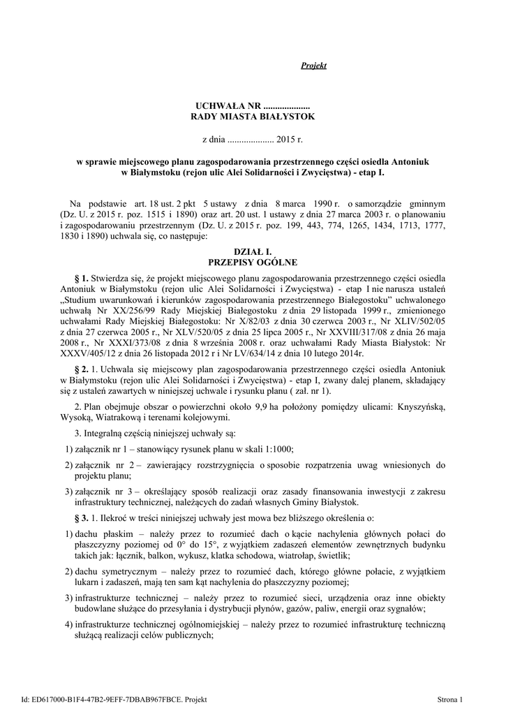 Projekt UCHWAŁA NR .................... RADY MIASTA BIAŁYSTOK z dnia .................... 2015 r. w sprawie miejscowego planu zagospodarowania przestrzennego części osiedla Antoniuk w Białymstoku (rejon ulic Alei Solidarności i Zwycięstwa) - etap I. Na podstawie art. 18 ust. 2 pkt 5 ustawy z dnia 8 marca 1990 r. o samorządzie gminnym (Dz. U. z 2015 r. poz. 1515 i 1890) oraz art. 20 ust. 1 ustawy z dnia 27 marca 2003 r. o planowaniu i zagospodarowaniu przestrzennym (Dz. U. z 2015 r. poz. 199, 443, 774, 1265, 1434, 1713, 1777, 1830 i 1890) uchwala się, co następuje: DZIAŁ I. PRZEPISY OGÓLNE § 1. Stwierdza się, że projekt miejscowego planu zagospodarowania przestrzennego części osiedla Antoniuk w Białymstoku (rejon ulic Alei Solidarności i Zwycięstwa) - etap I nie narusza ustaleń „Studium uwarunkowań i kierunków zagospodarowania przestrzennego Białegostoku” uchwalonego uchwałą Nr XX/256/99 Rady Miejskiej Białegostoku z dnia 29 listopada 1999 r., zmienionego uchwałami Rady Miejskiej Białegostoku: Nr X/82/03 z dnia 30 czerwca 2003 r., Nr XLIV/502/05 z dnia 27 czerwca 2005 r., Nr XLV/520/05 z dnia 25 lipca 2005 r., Nr XXVIII/317/08 z dnia 26 maja 2008 r., Nr XXXI/373/08 z dnia 8 września 2008 r. oraz uchwałami Rady Miasta Białystok: Nr XXXV/405/12 z dnia 26 listopada 2012 r i Nr LV/634/14 z dnia 10 lutego 2014r. § 2. 1. Uchwala się miejscowy plan zagospodarowania przestrzennego części osiedla Antoniuk w Białymstoku (rejon ulic Alei Solidarności i Zwycięstwa) - etap I, zwany dalej planem, składający się z ustaleń zawartych w niniejszej uchwale i rysunku planu ( zał. nr 1). 2. Plan obejmuje obszar o powierzchni około 9,9 ha położony pomiędzy ulicami: Knyszyńską, Wysoką, Wiatrakową i terenami kolejowymi. 3. Integralną częścią niniejszej uchwały są: 1) załącznik nr 1 – stanowiący rysunek planu w skali 1:1000; 2) załącznik nr 2 – zawierający rozstrzygnięcia o sposobie rozpatrzenia uwag wniesionych do projektu planu; 3) załącznik nr 3 – określający sposób realizacji oraz zasady finansowania inwestycji z zakresu infrastruktury technicznej, należących do zadań własnych Gminy Białystok. § 3. 1. Ilekroć w treści niniejszej uchwały jest mowa bez bliższego określenia o: 1) dachu płaskim – należy przez to rozumieć dach o kącie nachylenia głównych połaci do płaszczyzny poziomej od 0° do 15°, z wyjątkiem zadaszeń elementów zewnętrznych budynku takich jak: łącznik, balkon, wykusz, klatka schodowa, wiatrołap, świetlik; 2) dachu symetrycznym – należy przez to rozumieć dach, którego główne połacie, z wyjątkiem lukarn i zadaszeń, mają ten sam kąt nachylenia do płaszczyzny poziomej; 3) infrastrukturze technicznej – należy przez to rozumieć sieci, urządzenia oraz inne obiekty budowlane służące do przesyłania i dystrybucji płynów, gazów, paliw, energii oraz sygnałów; 4) infrastrukturze technicznej ogólnomiejskiej – należy przez to rozumieć infrastrukturę techniczną służącą realizacji celów publicznych; Id: ED617000-B1F4-47B2-9EFF-7DBAB967FBCE. Projekt Strona 1 5) kiosku – należy przez to rozumieć tymczasowy obiekt budowlany o funkcji usługowej, posiadający jedną kondygnację nadziemną o wysokości nie większej niż 3,5 m i o powierzchni zabudowy nie większej niż 20 m2; 6) linii rozgraniczającej – należy przez to rozumieć linię oddzielającą tereny o różnych funkcjach lub różnych zasadach zagospodarowania; 7) linii wydzielenia wewnętrznego – należy przez to rozumieć linię wydzielającą część terenu, na którym obowiązują ustalenia szczególne w stosunku do pozostałej części terenu; 8) linii zabudowy nieprzekraczalnej – należy przez to rozumieć linię, której nie może przekroczyć ściana zewnętrzna budynku w kierunku ulicy, sąsiedniego terenu lub sąsiedniej działki, z zastrzeżeniem § 4 ust. 1 pkt 5; 9) nośniku reklamy – należy przez to rozumieć urządzenie reklamowe, ze stałą lub zmienną powierzchnią ekspozycyjną (nieoświetloną, oświetloną lub podświetloną), niebędące znakiem w rozumieniu przepisów o znakach i sygnałach drogowych, elementem SIMB lub pojazdem samobieżnym, przeznaczone do eksponowania reklamy; wyróżnia się następujące rodzaje nośników: a) baner (transparent) - nośnik tekstylny lub wykonany z tworzywa sztucznego, rozpięty na niezależnej konstrukcji, b) literniczo-graficzna forma przestrzenna – nośnik reklamy w formie liter przestrzennych (3d), z dopuszczeniem elementów graficznych i dekoracyjnych, mocowanych do budynku bezpośrednio lub za pomocą stelażu, z możliwością ich podświetlenia, o wysięgu od lica budynku do 0,15 m, c) neon – nośnik reklamy w formie ażurowego urządzenia świetlnego (rurki szklane wypełnione gazem lub mieszanką gazów) o formie literniczej, z dopuszczeniem elementów graficznych i dekoracyjnych, o wysięgu od lica budynku maksimum 0,15 m, d) pylon reklamowy lub totem reklamowy – nośnik reklamy w formie pionowej, wolno stojącej konstrukcja, z obustronną reklamą lub informacją na maksimum 60% jego powierzchni, z możliwością podświetlenia lub wyświetlenia, e) reklama remontowo-budowlana – nośnik reklamy umieszczony na rusztowaniu, ogrodzeniu lub wyposażeniu placu budowy, stosowany wyłącznie w trakcie formalnie prowadzonych robót budowlanych, f) reklama typu „semafor” - nośnik reklamy montowany prostopadle do płaszczyzny ściany budynku, g) słup ogłoszeniowo-reklamowy – rodzaj nośnika reklamy wolnostojący, w formie walca lub graniastosłupa, o średnicy lub szerokości od 1,2 do 1,6 m i maksymalnej wysokości nie przekraczającej 4,7 m, służący do umieszczania ogłoszeń i informacji; 10) obiektach i urządzeniach towarzyszących – należy przez to rozumieć urządzenia i obiekty budowlane, ściśle związane z prawidłowym funkcjonowaniem terenu, w tym garaże, budynki gospodarcze, podjazdy, parkingi i o