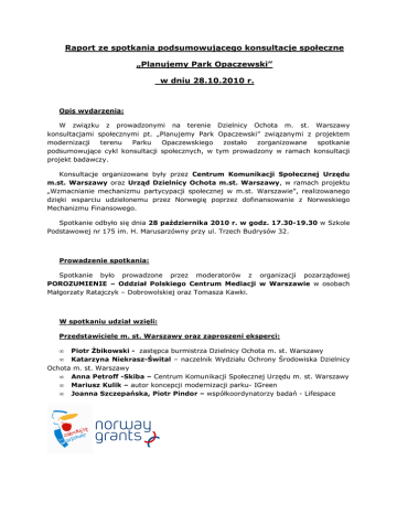 Raport ze spotkania podsumowującego konsultacje społeczne „Planujemy Park Opaczewski” w dniu 28.10.2010 r. Opis wydarzenia: W związku z prowadzonymi na terenie Dzielnicy Ochota m. st. konsultacjami społecznymi pt. „Planujemy Park Opaczewski” związanymi z modernizacji terenu Parku Opaczewskiego zostało zorganizowane podsumowujące cykl konsultacji społecznych, w tym prowadzony w ramach projekt badawczy. Warszawy projektem spotkanie konsultacji Konsultacje organizowane były przez Centrum Komunikacji Społecznej Urzędu m.st. Warszawy oraz Urząd Dzielnicy Ochota m.st. Warszawy, w ramach projektu „Wzmacnianie mechanizmu partycypacji społecznej w m.st. Warszawie”, realizowanego dzięki wsparciu udzielonemu przez Norwegię poprzez dofinansowanie z Norweskiego Mechanizmu Finansowego. Spotkanie odbyło się dnia 28 października 2010 r. w godz. 17.30-19.30 w Szkole Podstawowej nr 175 im. H. Marusarzówny przy ul. Trzech Budrysów 32. Prowadzenie spotkania: Spotkanie było prowadzone przez moderatorów z organizacji pozarządowej POROZUMIENIE – Oddział Polskiego Centrum Mediacji w Warszawie w osobach Małgorzaty Ratajczyk – Dobrowolskiej oraz Tomasza Kawki. W spotkaniu udział wzięli: Przedstawiciele m. st. Warszawy oraz zaproszeni eksperci: • Piotr śbikowski - zastępca burmistrza Dzielnicy Ochota m. st. Warszawy • Katarzyna Niekrasz-Śwital – naczelnik Wydziału Ochrony Środowiska Dzielnicy Ochota m. st. Warszawy • Anna Petroff -Skiba – Centrum Komunikacji Społecznej Urzędu m. st. Warszawy • Mariusz Kulik – autor koncepcji modernizacji parku- IGreen • Joanna Szczepańska, Piotr Pindor – współkoordynatorzy badań - Lifespace Mieszkańcy oraz zaproszeni goście: W spotkaniu udział wzięło ok. 40 osób, m.in. proboszcz parafii rzymskokatolickiej NMP Królowej Świata przy ul. Opaczewskiej 20, przedstawiciele StraŜy Miejskiej oraz Policji, a takŜe radni Dzielnicy Ochota. Program spotkania: 1. Przedstawienie projektu konsultacji społecznych „Planujemy Park Opaczewski”zastępca burmistrza Dzielnicy Ochota Piotr śbikowski 2. Informacje o projekcie konsultacji społecznych - Anna Petroff-Skiba – Centrum Komunikacji Społecznej 3. Przedstawienie raportu z badań prowadzonych przez badaczy z pracowni badawczej Lifespace – Piotr Pindor 4. Prezentacja koncepcji modernizacji Parku Opaczewskiego – Mariusz Kulik 5. Pytania i sugestie ze strony mieszkańców do koncepcji modernizacji Parku Opaczewskiego 6. Zakończenia spotkania Pytanie, wnioski i uwagi zgłoszone przez uczestników spotkania: 1. Kiedy jest planowana realizacja modernizacji Parku Opaczewskiego? Wiele proponowanych zmian nie wymaga wielu środków finansowych. 2. Odwrócenie rzutu planu tak, aby przedstawiono go z perspektywy mieszkańców. 3. Park czy Skwer? – wniosek o posługiwanie się nazwę Skwer Opaczewski, a nie Park Opaczewski. 4. Włączenie terenu przy komisariacie Policji na rogu ulic: Opaczewska-Białobrzeska w teren Skweru Opaczewskiego. 5. Transformacja Skweru podobnie jak miało to miejsce w przypadku Parku Szczęśliwickiego, tak aby nadać Skwerowi dodatkową wartość – wkomponowanie Ŝywej edukacji ekologicznej. 6. Uatrakcyjnienie terenu Parku, aby było moŜliwe korzystanie z Parku przez cały rok. 7. Poprawa bezpieczeństwa w Parku. 8. Zwrócenie uwagi na niebezpieczne przejście do szkoły nr 175 – skrzyŜowanie ul. Opaczewskiej i ul. Orzeszkowej. 9. Zadbanie o bezpieczeństwo dzieci w drodze do szkoły (przejście na wysokości ul. Opaczewskiej 32). 10. Postulat budowy progów spowalniających na całej długości ul. Opaczewskiej. 11. Stworzenie ścieŜki rowerowej jako podnoszącej bezpieczeństwo poruszania się po Skwerze a takŜe stworzenie sieci ścieŜek rowerowych. 12. ZastrzeŜenia do budowy kładki nad ul. Białobrzeską. Obawy zbytniej ingerencji budowli kładki w teren Parku (zamyka przestrzeń, zasłania kościół). Uwagi do zagospodarowania powierzchni pod kładką – kwiaciarnia, kawiarnia. 13. Likwidacja schodków i zamiana ich na pochylnie i podejścia jest złym pomysłem – zimą takie podejścia będą oblodzone i niebezpieczne. 14. Dlaczego nie było konsultacji społecznych w sprawie budowy meczetu? 15. Kładka moŜe nie przeszkadzać, o ile zostanie odpowiednio zaprojektowana, wykonana i wkomponowana w teren parku. 16. Przyciągnąć ludzi z ul. Grójeckiej tworząc miniestradę. Kwestia zastanowienia się nad wydarzeniami, jakie mogłyby odbywać się na scenie. 17. Czy jest w planach zmiana nawierzchni na placu zabaw? 18. Kładka podniosłaby walor estetyczny otoczenia. Kwestia usytuowania jej jak najdalej od kościoła (przeniesienie na południe Parku). 19. Postulat, aby upamiętnić ślady historyczne (dawnej zajezdni oraz torów). 20. Utrzymanie czystości w Parku (zwłaszcza w jego zakątkach). 21. śywopłoty dają szansę organizacji przestrzeni. 22. Postulat zainstalowania grzbietów ograniczających prędkość jeszcze przed realizacją projektu modernizacji Parku. 23. Zwierzęta – zadbanie o czystość. 24. Oświetlenie parkowe – ograniczenie świecenia w górę tak, aby to nie przeszkadzało ptakom. 25. Zainstalowanie Hot – Spot-u w Parku wraz z ławkami i stolikami dla młodzieŜy. Odpowiedzi jakie zostały udzielone podczas spotkania: 1. Zwrócenie uwagi przez zastępcę burmistrza Piotra śbikowskiego na fakt, iŜ budŜet Dzielnicy na przyszły rok nie jest jeszcze uchwalony. Pomocna będzie aktywność radnych oraz wyniki konsultacji społecznych. Wydział Ochrony Środowiska zgłosił koncepcję modernizacji Parku do Biura Ochrony Środowiska m. st. Warszawy. 2. Katarzyna Niekrasz-Śwital - naczelnik Wydziału Ochrony Środowiska Dzielnicy, odniosła się do uwag mieszkańców zgłaszanych przed spotkaniem drogą mailową. Najwięcej uwag dotyczyło ścieŜki rowerowej oraz jej nawierzchni. W koncepcji modernizacji Parku nie ma miejsca na ścieŜkę, ze względu na jego układ przestrzenny. Budowa 