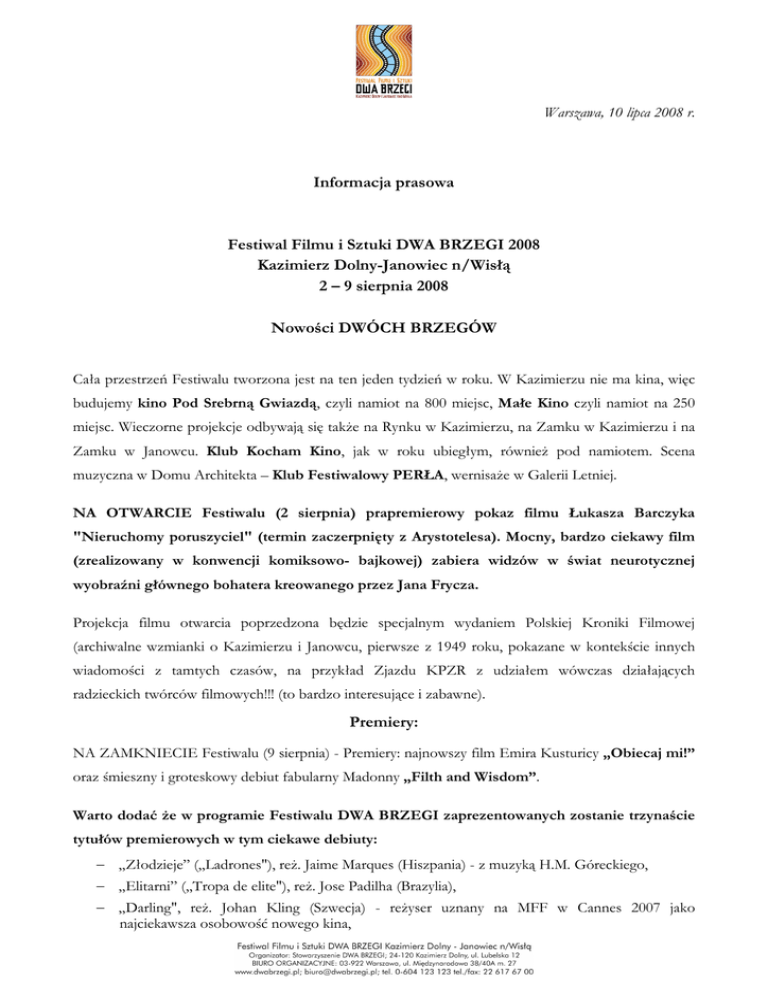 Warto dodać Ŝe w programie Festiwalu DWA BRZEGI zaprezentowanych zostanie trzynaście