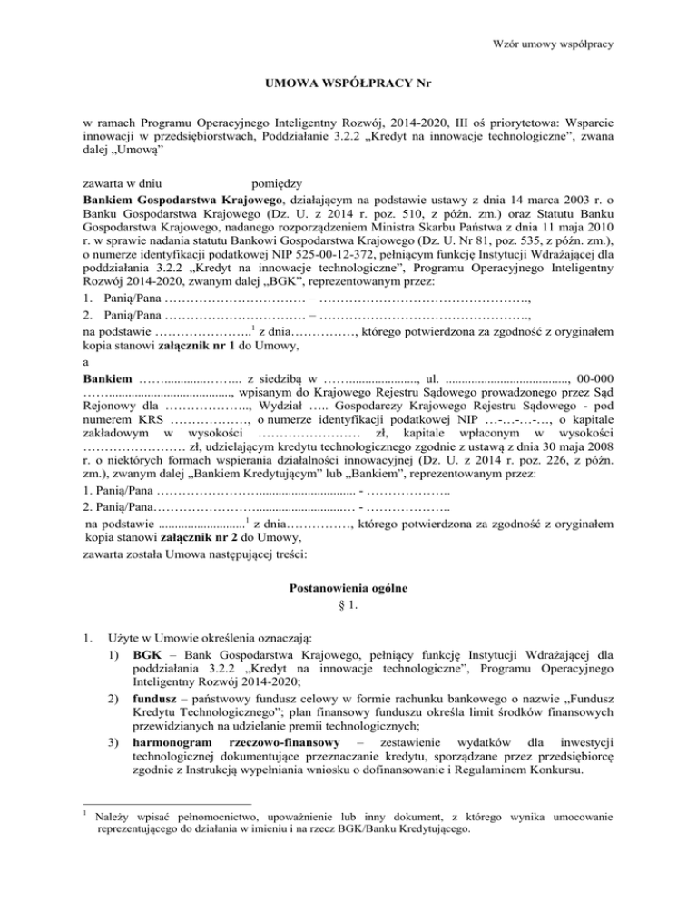 Wzór umowy współpracy UMOWA WSPÓŁPRACY Nr w ramach Programu Operacyjnego Inteligentny Rozwój, 2014-2020, III oś priorytetowa: Wsparcie innowacji w przedsiębiorstwach, Poddziałanie 3.2.2 „Kredyt na innowacje technologiczne”, zwana dalej „Umową” zawarta w dniu pomiędzy Bankiem Gospodarstwa Krajowego, działającym na podstawie ustawy z dnia 14 marca 2003 r. o Banku Gospodarstwa Krajowego (Dz. U. z 2014 r. poz. 510, z późn. zm.) oraz Statutu Banku Gospodarstwa Krajowego, nadanego rozporządzeniem Ministra Skarbu Państwa z dnia 11 maja 2010 r. w sprawie nadania statutu Bankowi Gospodarstwa Krajowego (Dz. U. Nr 81, poz. 535, z późn. zm.), o numerze identyfikacji podatkowej NIP 525-00-12-372, pełniącym funkcję Instytucji Wdrażającej dla poddziałania 3.2.2 „Kredyt na innowacje technologiczne”, Programu Operacyjnego Inteligentny Rozwój 2014-2020, zwanym dalej „BGK”, reprezentowanym przez: 1. Panią/Pana …………………………… – …………………………………………., 2. Panią/Pana …………………………… – …………………………………………., na podstawie …………………..1 z dnia……………, którego potwierdzona za zgodność z oryginałem kopia stanowi załącznik nr 1 do Umowy, a Bankiem …….............……... z siedzibą w ……....................., ul. ......................................, 00-000 ……......................................, wpisanym do Krajowego Rejestru Sądowego prowadzonego przez Sąd Rejonowy dla ……………….., Wydział ….. Gospodarczy Krajowego Rejestru Sądowego - pod numerem KRS ………………, o numerze identyfikacji podatkowej NIP …-…-…-…, o kapitale zakładowym w wysokości …………………… zł, kapitale wpłaconym w wysokości …………………… zł, udzielającym kredytu technologicznego zgodnie z ustawą z dnia 30 maja 2008 r. o niektórych formach wspierania działalności innowacyjnej (Dz. U. z 2014 r. poz. 226, z późn. zm.), zwanym dalej „Bankiem Kredytującym” lub „Bankiem”, reprezentowanym przez: 1. Panią/Pana …………………….............................. - ……………….. 2. Panią/Pana……………………...........................… - ……………….. na podstawie ...........................1 z dnia……………, którego potwierdzona za zgodność z oryginałem kopia stanowi załącznik nr 2 do Umowy, zawarta została Umowa następującej treści: Postanowienia ogólne § 1. 1. 1 Użyte w Umowie określenia oznaczają: 1) BGK – Bank Gospodarstwa Krajowego, pełniący funkcję Instytucji Wdrażającej dla poddziałania 3.2.2 „Kredyt na innowacje technologiczne”, Programu Operacyjnego Inteligentny Rozwój 2014-2020; 2) fundusz – państwowy fundusz celowy w formie rachunku bankowego o nazwie „Fundusz Kredytu Technologicznego”; plan finansowy funduszu określa limit środków finansowych przewidzianych na udzielanie premii technologicznych; 3) harmonogram rzeczowo-finansowy – zestawienie wydatków dla inwestycji technologicznej dokumentujące przeznaczanie kredytu, sporządzane przez przedsiębiorcę zgodnie z Instrukcją wypełniania wniosku o dofinansowanie i Regulaminem Konkursu. Należy wpisać pełnomocnictwo, upoważnienie lub inny dokument, z którego wynika umocowanie reprezentującego do działania w imieniu i na rzecz BGK/Banku Kredytującego. 4) 5) 6) 7) 8) 9) 10) 11) 12) 13) 14) 15) 16) 17) 18) Instrukcja wypełniania wniosku –dokument określający wymogi dotyczące wniosku o dofinansowanie i załączników; inwestycja technologiczna – inwestycję finansowaną ze środków kredytu technologicznego, polegającą na: a) zakupie nowej technologii, jej wdrożeniu oraz uruchomieniu na jej podstawie wytwarzania nowych lub znacząco ulepszonych, w stosunku do dotychczas wytwarzanych na terytorium Rzeczypospolitej Polskiej, towarów, procesów lub usług albo, b) wdrożeniu własnej nowej technologii oraz uruchomieniu na jej podstawie wytwarzania nowych lub znacząco ulepszonych, w stosunku do dotychczas wytwarzanych na terytorium Rzeczypospolitej Polskiej, towarów, procesów lub usług; konkurs – nabór wniosków o dofinansowanie/przyznanie premii technologicznej ogłaszany przez BGK w ramach PO IR; kredyt technologiczny – kredyt udzielany przedsiębiorcy przez Bank Kredytujący na realizację inwestycji technologicznej w ramach Poddziałania 3.2.2 „Kredyt na innowacje technologiczne”, który jest częściowo spłacany ze środków Funduszu Kredytu Technologicznego w formie premii technologicznej, do wysokości i na warunkach określonych w ustawie oraz Regulaminie Konkursu; kredytobiorca – mikro-przedsiębiorcę, małego lub średniego przedsiębiorcę, który otrzymał kredyt technologiczny na podstawie umowy kredytu technologicznego; mały przedsiębiorca – małe przedsiębiorstwo w rozumieniu Załącznika I do rozporządzenia Komisji (UE) nr 651/2014 z dnia 17 czerwca 2014 r. uznającego niektóre rodzaje pomocy za zgodne ze wspólnym rynkiem w zastosowaniu art. 107 i 108 Traktatu (Dz.Urz.UE L 187 z 26.6.2014) zwanego dalej: „rozporządzeniem Komisji (UE) nr 651/2014; mikroprzedsiębiorca – mikroprzedsiębiorstwo w rozumieniu Załącznika I do rozporządzenia Komisji (UE) nr 651/2014; nowa technologia – technologia będąca przedmiotem inwestycji technologicznej w postaci prawa własności przemysłowej lub wyników prac rozwojowych lub wyników badań przemysłowych lub nieopatentowanej wiedzy technicznej, która umożliwia wytwarzanie nowych lub znacząco ulepszonych, w stosunku do dotychczas wytwarzanych na terytorium Rzeczypospolitej Polskiej, towarów, procesów lub usług; okres trwałości – okres 3 lat od daty zakończenia realizacji inwestycji technologicznej, rozumianej jako dzień wypłaty płatności końcowej; PO IR –Program Operacyjny Inteligentny Rozwój, 2014 – 2020, w ramach którego BGK pełni rolę Instytu