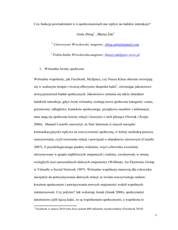 Czy funkcja powiadomień w e-społecznościach ma wpływ na ludzkie interakcje? Anita Zbieg1 , Błażej Żak2 1 2 Uniwersytet Wrocławski, magister, [email protected] Politechnika Wrocławska,magister, [email protected] 1. Wirtualne światy społeczne Wirtualne wspólnoty, jak Facebook, MySpace, czy Nasza Klasa obecnie rozwijają się w szalonym tempie i tworzą olbrzymie skupiska ludzi1, otwierając jakościowo nową przestrzeń badań społecznych. Jakościowo zmienia się także charakter ludzkich interakcji, gdyż świat wirtualny cechują nowe społeczne kategorie: czasu, przestrzeni, odległości, kontekstu społecznego, przepływu zasobów i informacji; inne stają się społeczne koszty relacji i korzyści z nich płynące (Nowak i Krejtz 2006). Manuel Castells zauważył, że Sieć Internetu (i innych narzędzi komunikacyjnych) wpływa na rzeczywistość społeczną, w której zachodzą procesy usieciowienia, czyli tworzenia relacji i powiązań o charakterze sieciowym (Castells 2007). Z psychologicznego punktu widzenia, więzi człowieka wcześniej utrzymywane w grupie najbliższych znajomych i rodziny, ewoluowały w stronę rozległych sieci personalnych dalszych znajomości (Wellman, An Electronic Group is Virtually a Social Network 1997). Wirtualne wspólnoty stanowią dla człowieka narzędzie do potrzymywania dalszych relacji ze świata rzeczywistego niskim kosztem społecznym i nawiązywania nowych znajomości wokół wspólnych zainteresowań. Czy jedynie? Jak wskazuje Jonak (Jonak 2006), społeczności internetowe jeśli łączą ludzi, to są wspólnotami społecznymi; a wspólnota to 1 Facebook w marcu 2010 roku liczy ponad 400 milionów użytkowników (Facebook 2010) 1 samodefiniująca się, elektroniczna sieć interaktywnej komunikacji, zorganizowana wokół podzielanych zainteresowań lub celów. Obserwowani w badaniu użytkownicy tworzą taką wspólnotę – są osobami, które budują dom (podzielają zainteresowania i cele) i używają narzędzi internetowego serwisu społecznego do wzajemnej komunikacji. Przytoczone poniżej badanie polegało jej obserwacji w momencie wprowadzenia powiadomień, czyli skrótowych wiadomości o aktywności innych ludzi, wysyłanych i wyświetlaych automatycznie na profilu użytkownika. Przedmiotem obserwacji był wpływ jaki powiadomienia wywarły na interakcje między ludźmi, a wyniki badania mogą stanowić głos w dyskusji na temat tego, jak duża jest siła sprawcza medium (czyli oprogramowania serwisów społecznościowych) w kreowaniu interakcji społecznych. Oprogramowanie społeczne jest konstytutywną cechą wirtualnych społeczności. Aby jakikolwiek ruch użytkownika był możliwy do wykonania, najpierw musi zostać odpowiednio zaprojektowany i zaprogramowany. Oznacza to, że społeczne oprogramowanie wyznacza ramy zachowań ludzi, kierując ich na wytyczone ścieżki możliwych działań, a ponadto tworzy kontekst społeczny i wpływa na percepcję rzeczywistości społecznej jednostki. Zgodnie z oprogramowaniem obserwowanej społeczności, użytkownik może tu: prezentować się na profilu, komunikować się z innymi ludźmi poprzez wysyłanie wiadomości, umieszczanie komentarzy i wpisów na grupach, nawiązywać relacje i dodawać znajomych do kontaktów. Same projekty domów łączą użytkowników w sieci afiliacji ludzi bliskich sobie poprzez podobieństwo zainteresowań i gustów, a także wspólne doświadczenie. 2 2. Powiadomienia – konstrukt teoretyczny zmiennej niezależnej Powiadomienie jest informacją o zachowaniu (aktywności) innych ludzi ze społeczności, która pojawia się na profilu użytkownika i jest generowana automatycznie. Do nawiązywania relacji wystarczy kliknąć na profil osoby, wyświetlającej się w powiadomieniu. Osoba jest powiadamiana gdy ktoś wyśle jej wiadomość, odwiedzi jej profil, skomentuje jej profil lub zdjęcie albo doda ulubiony projekt domu do swoich ulubionych, np.: Ilustracja 1 - Przykłady powiadomień na społeczności ludzi budujących dom Sposób rozsyłania powiadomień zgodny jest z zasadą homofilii. Mówi ona o tym, że „ludzie mają tendencję do stowarzyszania się (nawiązywania relacji) z osobami podobnymi do siebie pod jakimś względem” (Jonak 2006, 118). Na bazie tego mechanizmu powiadomienia rozsyłane są do osób budujących ten sam dom, lubiących ten sam projekt domu, przynależących do tej samej grupy, lub będących znajomymi. 3 3. Metodologia badania i konstrukt teoretyczny zmiennych zależnych Metodologią badania jest Analiza Sieci Społecznych, a wyniki obserwacji zostaną zaprezentowane na grafach. Graf jest matematycznym odwzorowaniem sieci. Obserwowane zachowania stanowią połączenia między węzłami. Zachowanie społeczne rozumiane jest jako podjęcie działania/odbiór działania w postaci jednej z możliwych aktywności, gdy Aktor: − odwiedzi profil innej osoby − wyśle wiadomość − doda inną osobę do kontaktów Użytkownik staje się aktorem w momencie podjęcia jednego z poniższych zachowań i jest obrazowany na grafie w postaci węzła. 4. Po wprowadzeniu powiadomień – wyniki obserwacji Nowa funkcjonalność pojawiła się na społeczności 6 listopada 2008 roku. Porównawcza obserwacja społeczności została dokonana w dwóch przedziałach czasowych: − 4 tygodnie przed wprowadzeniem powiadomień (9/10/2008 – 6/11/2008) − 4 tygodnie po wprowadzeniu powiadomień (6/11/2008 – 4/12/2008) Poniższa tabela prezentuje najbardziej ogólne wyniki eksperymentu i pokazuje zmiany liczebności w różnych aktywnościach po wprowadzeniu powiadomień. Globalne spojrzenie na zmiany daje tło do późniejszych bardziej szczegółowych analiz. 4 Odwiedziny Odwiedziny odwzajemnione Wiadomości Wiadomości odwzajemnione Kontakty (zawsze odwzajemnione) Aktywność przed wprowadzeniem powiadomień Aktywność po wprowadzeniu powiadomień Wzrost 9117 aktywności 25597 aktywności 180% 1896 aktorów 3678 aktorów 94% 510