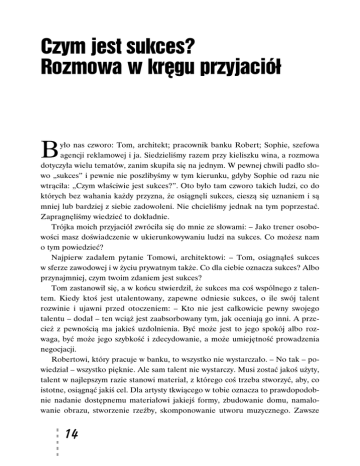 Czym jest sukces? Rozmowa w krêgu przyjació³ B yło nas czworo: Tom, architekt; pracownik banku Robert; Sophie, szefowa agencji reklamowej i ja. Siedzieliśmy razem przy kieliszku wina, a rozmowa dotyczyła wielu tematów, zanim skupiła się na jednym. W pewnej chwili padło słowo „sukces” i pewnie nie poszlibyśmy w tym kierunku, gdyby Sophie od razu nie wtrąciła: „Czym właściwie jest sukces?”. Oto było tam czworo takich ludzi, co do których bez wahania każdy przyzna, że osiągnęli sukces, cieszą się uznaniem i są mniej lub bardziej z siebie zadowoleni. Nie chcieliśmy jednak na tym poprzestać. Zapragnęliśmy wiedzieć to dokładnie. Trójka moich przyjaciół zwróciła się do mnie ze słowami: – Jako trener osobowości masz doświadczenie w ukierunkowywaniu ludzi na sukces. Co możesz nam o tym powiedzieć? Najpierw zadałem pytanie Tomowi, architektowi: – Tom, osiągnąłeś sukces w sferze zawodowej i w życiu prywatnym także. Co dla ciebie oznacza sukces? Albo przynajmniej, czym twoim zdaniem jest sukces? Tom zastanowił się, a w końcu stwierdził, że sukces ma coś wspólnego z talentem. Kiedy ktoś jest utalentowany, zapewne odniesie sukces, o ile swój talent rozwinie i ujawni przed otoczeniem: – Kto nie jest całkowicie pewny swojego talentu – dodał – ten wciąż jest zaabsorbowany tym, jak oceniają go inni. A przecież z pewnością ma jakieś uzdolnienia. Być może jest to jego spokój albo rozwaga, być może jego szybkość i zdecydowanie, a może umiejętność prowadzenia negocjacji. Robertowi, który pracuje w banku, to wszystko nie wystarczało. – No tak – powiedział – wszystko pięknie. Ale sam talent nie wystarczy. Musi zostać jakoś użyty, talent w najlepszym razie stanowi materiał, z którego coś trzeba stworzyć, aby, co istotne, osiągnąć jakiś cel. Dla artysty tkwiącego w tobie oznacza to prawdopodobnie nadanie dostępnemu materiałowi jakiejś formy, zbudowanie domu, namalowanie obrazu, stworzenie rzeźby, skomponowanie utworu muzycznego. Zawsze 14 chodzi o to, aby istniejące elementy dzięki talentowi zamienić w pewien wytwór, którego wcześniej nie było. To w każdym razie nazwałbym sukcesem, szczególnie wtedy gdy rzecz zyska uznanie w oczach innych. Sophie, jedyna kobieta w naszym towarzystwie, szukała definicji sukcesu w innej sferze: – Składnikiem sukcesu jest swoisty osobisty magnetyzm. Ludzie sukcesu posiadają magiczną moc. Przyciągają ludzi, rzeczy i zdarzenia, a tym sposobem nic ich nie omija. Tom i Robert uznali, że myśl jest niezła. Jednak czyż magnetyzm nie jest zaledwie jednym z możliwych składników? Magnes wprawdzie przyciąga coś do siebie, ale nic nie przemienia. A właśnie owa przemiana jest właściwym słowem kluczowym dla sukcesu. Bez działania nic się nie uda. Sukces nie pojawi się sam z siebie. – Czy to znaczy – zapytałem – że kto nie ma celu, nie może osiągnąć sukcesu? Tak bowiem jest. Potrzebujemy celu i przede wszystkim trzeba najpierw dokładnie określić ów cel. Aby taki określony cel osiągnąć, potrzebujemy odpowiednich środków. Należą do nich: talent, pomysł i materiały. Te trzy wstępne warunki Nasze kółko w trakcie rozmowy (od prawej do lewej): Robert, Samy, Sophie i Tom. Rozmowa tylko wtedy przebiega płynnie i miło, gdy dopisują humory i jest wesoła atmosfera. Tutaj wszyscy śmiejemy się serdecznie z wypowiedzi Toma, przy czym nie sposób nie zauważyć, że Robert nawet śmiejąc się, nie jest całkiem otwarty. Lekko tłumi swój śmiech. 15 są takie same na wszelkich polach aktywności. Talent może być artystyczny, analityczny, matematyczny, ekonomiczny, społeczny, a nawet sportowy. Talent jest dla sukcesu punktem wyjścia. Nie mniej ważny jest pomysł. We wszystkich przypadkach to on określa cel; jeśli zaś chodzi o materiały, to muszą one być odpowiednie dla myślowej intencji. Czy jednak stworzenie dzięki talentowi, pomysłowi i materiałom nowego wytworu wystarcza, żeby mówić o sukcesie? Czy nie brakuje jeszcze jednego ważnego składnika, a mianowicie uznania otoczenia? Sophie, która zawodowo prezentuje produkty, zgadza się z tym poglądem bez zastrzeżeń. Sukces wymaga uznania. W ogóle o sukcesie można mówić jedynie wtedy, gdy wytwór, dzieło, które ktoś stworzył, będzie komuś potrzebne, będzie użyteczne i uzyska czyjąś akceptację. – Jaki w tym sens – spytała nas Sophie – kiedy to, co zrobiłam, nikomu nie jest potrzebne, albo nikt nie uważa tego za ładne czy godne podziwu? A może sens tkwi w samym dziele albo wręcz w samym fakcie, że coś doprowadziliśmy do końca, domknęli, dokończyli? Oczywiście bywa tak, że ktoś jest zadowolony z tego, że osiągnął cel, który sam sobie postawił. Jednak nie mówimy tu o zadowoleniu, lecz o sukcesie, i dlatego skłaniam się do przekonania Sophie. Sukces szuka uznania otoczenia. Zmierzam do tego, że istnieje pewien wymóg, który wiążę ze słowem sukces. Osiągnąć sukces znaczy dla mnie popchnąć coś do przodu, wprawić coś w ruch. Cechą sukcesu jest rozwój i ruch, początkowo niewielkie działanie zaczynające proces. Na przyk³ad nasionko W ziemi leżą niezliczone nasionka i tylko niewielkiej części udaje się przebić warstwę ziemi, która je przykrywa, chroni, a zarazem hamuje. Wszystko zależy od tego, czy we właściwej chwili pokona się opór, a jeśli się uda, czy rosnącą energię przeprowadzi się przez ziemię na światło dzienne. Aby delikatne kiełki wydostały się na powierzchnię, musiały stale pokonywać każdy opór. Roślince rzecz się udała. Czy tym sposobem osiągnęła sukces? W każdym razie historia, którą przewidziała dla niej natura, jeszcze się nie skończyła. Nasza roślinka zaczyna rosnąć, a nowa sytuacja stawia ją przed nowymi problemami. Są zwierzęta i są inne rośliny, które mogą zahamować jej rozwój. Nasza roślina musi więc zdobyć się na kreatyw