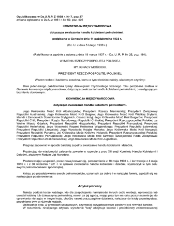 Opublikowana w Dz.U.R.P. Z 1938 r. Nr 7, poz.37 zmiana ogłoszona w Dz.U.z 1951 r. Nr 59, poz. 405 KONWENCJA MIĘDZYNARODOWA dotycząca zwalczania handlu kobietami pełnoletnimi, podpisana w Genewie dnia 11 października 1933 r. (Dz. U. z dnia 5 lutego 1938 r.) (Ratyfikowana zgodnie z ustawą z dnia 18 marca 1937 r. - Dz. U. R. P. Nr 25, poz. 164). W IMIENIU RZECZYPOSPOLITEJ POLSKIEJ, MY, IGNACY MOŚCICKI, PREZYDENT RZECZYPOSPOLITEJ POLSKIEJ, Wszem wobec i każdemu zosobna, komu o tym wiedzieć należy, wiadomym czynimy: Dnia jedenastego października tysiąc dziewięćset trzydziestego trzeciego roku podpisana została w Genewie konwencja międzynarodowa, dotycząca zwalczania handlu kobietami pełnoletnimi, o następującym brzmieniu dosłownym: KONWENCJA MIĘDZYNARODOWA dotycząca zwalczania handlu kobietami pełnoletnimi. Jego Królewska Mość Król Albańczyków; Prezydent Rzeszy Niemieckiej; Prezydent Związkowy Republiki Austriackiej; Jego Królewska Mość Król Belgów; Jego Królewska Mość Król Wielkiej Brytanii, Irlandii i Zamorskich Dominionów Brytyjskich, Cesarz Indyj; Jego Królewska Mość Król Bułgarów; Prezydent Republiki Chili; Prezydent Rządu Narodowego Republiki Chińskiej; Prezydent Rzeczypospolitej Polskiej, za Wolne Miasto Gdańsk; Prezydent Republiki Hiszpańskiej; Prezydent Republiki Francuskiej; Prezydent Republiki Helleńskiej; Jego Wysokość Regent Królestwa Węgierskiego; Prezydent Republiki Łotewskiej; Prezydent Republiki Litewskiej; Jego Wysokość Książę Monako; Jego Królewska Mość Król Norwegii; Prezydent Republiki Panamy; Jej Królewska Mość Królowa Holandii; Prezydent Rzeczypospolitej Polskiej; Prezydent Republiki Portugalskiej; Jego Królewska Mość Król Szwecji; Szwajcarska Rada Związkowa; Prezydent Republiki Czeskosłowackiej; Jego Królewska Mość Król Jugosławii, Pragnąc zapewnić w sposób bardziej zupełny zwalczanie handlu kobietami i dziećmi, Przyjmując do wiadomości zalecenia zawarte w raporcie z prac XII sesji Komitetu Handlu Kobietami i Dziećmi, złożonym Radzie Ligi Narodów, Postanawiając uzupełnić, przez nową konwencję, porozumienie z 18 maja 1904 r., i konwencje z 4 maja 1910 r. i z 30 września 1921 r. w sprawie zwalczania handlu kobietami i dziećmi, wyznaczyli w tym celu swymi pełnomocnikami: (pominięto), którzy, po przedstawieniu swych pełnomocnictw, uznanych za dobre i w należytej formie, zgodzili się na następujące postanowienia: Artykuł pierwszy. Należy poddać karze każdego, kto dla zaspokojenia namiętności innych osób werbuje, uprowadza lub uwodzi kobietę lub dziewczynę pełnoletnią, nawet za jej zgodą, mając przy tym na celu przeznaczenie jej do uprawiania nierządu w innym kraju, choćby nawet poszczególne działania, należące do istoty przestępstwa, popełnione były w różnych krajach. Usiłowanie oraz, w granicach ustawowych, czynności przygotowawcze powinny być również karalne. W rozumieniu niniejszego artykułu wyrażenie "kraj" obejmuje kolonie i protektoraty zainteresowanej Wysokiej Układającej się Strony, jak również terytoria pozostające pod jej suzerennością oraz te, nad którymi powierzono jej mandat. Artykuł 2. Wysokie Układające się Strony, których prawodawstwo obecne nie wystarcza do zwalczania przestępstw przewidzianych w artykule poprzednim, zobowiązują się przedsięwziąć środki niezbędne celem zapewnienia karalności tych przestępstw stosownie do ich wagi. Artykuł 3. Wysokie Układające się Strony zobowiązują się do wzajemnego komunikowania sobie o każdej osobie, bez różnicy płci, która by popełniła lub usiłowała popełnić jedno z przestępstw przewidzianych w niniejszej konwencji lub konwencjach z 1910 i 1921 roku, o zwalczaniu handlu kobietami i dziećmi, jeśli poszczególne działania, należące do istoty przestępstwa, były lub miały być popełnione w różnych krajach, następujących wiadomości (lub też wiadomości analogicznych, których pozwalają udzielać ustawy i rozporządzenia wewnętrzne): a) o wyrokach skazujących łącznie z wszelkimi wiadomościami istotnymi, które o sprawcy można uzyskać, np. co do jego stanu cywilnego, rysopisu, odcisków daktyloskopijnych, fotografii, danych policyjnych, sposobów działania itp., b) o zarządzeniach co do niewpuszczenia sprawcy do kraju lub co do wydalenia go z kraju. Powyższe dokumenty i informacje będą przesyłały w każdym poszczególnym przypadku władze wyznaczone zgodnie z art. 1 porozumienia zawartego w Paryżu 18 maja 1904 r., bezpośrednio i niezwłocznie władzom krajów interesowanych. Przesłanie to nastąpi, w miarę możności, w każdym przypadku stwierdzenia przestępstwa, skazania, niewpuszczenia do kraju lub wydalenia z kraju. Artykuł 4. Jeżeli między Wysokimi Układającymi się Stronami powstanie jakikolwiek spór co do wykładni lub stosowania niniejszej konwencji lub konwencyj z 1910 i 1921 roku i jeśli sporu tego nie da się rozstrzygnąć w sposób zadowalający w drodze dyplomatycznej, należy go załatwić zgodnie z obowiązującymi Strony postanowieniami o załatwianiu sporów międzynarodowych. W razie gdyby między stronami, pozostającymi w sporze, nie było tego rodzaju postanowień umownych, przekażą one spór na drogę postępowania rozjemczego lub sądowego. W braku zgody stron na wybór innego sądu, przekażą one spór, na żądanie jednej ze stron, Międzynarodowemu Trybunałowi Sprawiedliwości, o ile wszystkie są uczestnikami Statutu Międzynarodowego Trybunału Sprawiedliwości; jeżeli zaś nie wszystkie są uczestnikami tego protokołu, w takim razie przekażą one spór sądowi rozjemczemu, utworzonemu zgodnie z Konwencją Haską z dnia 18 października 1907 r. o pokojowym załatwianiu sporów międzynarodowych. Artykuł 5. Konwencja niniejsza, której teksty francuski i angielski są jednakowo miarodajne, nosi datę dziesiejszą i do 1 kwietnia 1934 r. będzie otwarta do podpisu dla każ