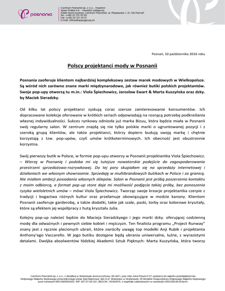 Poznań, 10 października 2016 roku Polscy projektanci mody w Posnanii Posnania zaoferuje klientom najbardziej kompleksowy zestaw marek modowych w Wielkopolsce. Są wśród nich zarówno znane marki międzynarodowe, jak również butiki polskich projektantów. Swoje pop-upy otworzą tu m.in.: Viola Śpiechowicz, Jarosław Ewart & Marta Kuszyńska oraz dzky. by Maciek Sieradzky. Od kilku lat polscy projektanci zyskują coraz szersze zainteresowanie konsumentów. Ich dopracowane kolekcje oferowane w krótkich seriach odpowiadają na rosnącą potrzebę podkreślania własnej indywidualności. Sukces rynkowy odniosła już marka Bizuu, która będzie miała w Posnanii swój regularny salon. W centrum znajdą się nie tylko polskie marki o ugruntowanej pozycji i z szeroką grupą klientów, ale także projektanci, którzy dopiero budują swoją markę i chętnie korzystają z tzw. pop-upów, czyli umów krótkoterminowych. Ich obecność jest obustronnie korzystna. Swój pierwszy butik w Polsce, w formie pop-upu otworzy w Posnanii projektantka Viola Śpiechowicz. – Wierzę w Posnanię i podoba mi się tutejsze nowatorskie podejście do zagospodarowania przestrzeni sprzedażowo-rozrywkowej. Do tej pory skupiałam się na sprzedaży internetowej i działaniach we własnym showroomie. Sprzedaję w multibrandowych butikach w Polsce i za granicą. Nie miałam ambicji posiadania własnych sklepów. Salon w Posnanii jest próbą poszerzenia kontaktu z moim odbiorcą, a format pop-up store daje mi możliwość podjęcia takiej próby, bez ponoszenia ryzyka wieloletnich umów – mówi Viola Śpiechowicz. Tworząc swoje kreacje projektantka czerpie z tradycji i bogactwa różnych kultur oraz przełamuje obowiązujące w modzie kanony. Klientom Posnanii zaoferuje garderobę, a także dodatki, takie jak szale, paski, torby oraz kolorowe kryształy, które są efektem jej współpracy z hutą kryształu Julia. Kolejny pop-up należeć będzie do Macieja Sieradzkyego i jego marki dzky. oferującej codzienną modę dla odważnych i pewnych siebie kobiet i mężczyzn. Ten finalista programu „Project Runway” znany jest z ręcznie plecionych ubrań, które zwróciły uwagę top modelki Anji Rubik i projektanta Anthony’ego Vaccarello. W jego butiku dostępne będą ubrania uniwersalne, luźne, z wyrazistymi detalami. Dwójka absolwentów łódzkiej Akademii Sztuk Pięknych: Marta Kuszyńska, która tworzy eleganckie kolekcje dla kobiet, oraz Jarosław Ewert, znany z ubrań oversize oraz geometrycznych kształtów wspólnie otworzą w Posnanii swój kolejny już salon. Pop-upy budzą coraz większe zainteresowanie, zarówno ze strony marek, jak i konsumentów. Ich popularność rośnie, co potwierdzają m.in. dane z Wielkiej Brytanii, gdzie działa obecnie 10,000 sklepów tego typu, a cały segment wart 2,3 mld funtów rośnie w tempie 12,3% rocznie1. – Pop-up stores to coraz bardziej popularny segment handlu. W Apsys Polska utworzyliśmy nawet stanowisko specjalisty ds. najmu krótkoterminowego. Format ten jest szczególnie atrakcyjny dla marek młodych, budujących swoją pozycję rynkową, wizerunek i portfolio. Umożliwia im testowanie nowych linii produktów i nowych lokalizacji. Pop-upy budzą emocje wśród klientów, gdyż uatrakcyjniają ofertę centrum, oferują krótkie serie, w ograniczonym czasie i w miejscu, w którym do tej pory nie były obecne. W pop-upach można też spotkać samych projektantów. W ten sposób zapewniają oni klientom wrażenia unikalności i ekskluzywności – mówi Marek Błędowski, dyrektor handlowy i członek zarządu Apsys Polska. Centrum Posnania zostanie otwarte już 19 października br. Kontakt dla mediów: Joanna Stankiewicz, email: [email protected], tel. 605 106 740 Paulina Gadomska-Dzięcioł, email: [email protected], tel. 501 241 557 Effective Public Relations, tel. (022) 822 07 52 O Posnanii Posnania to centrum handlowo-lifestylowe i największa inwestycja handlowa realizowana obecnie w Polsce i Europie Środkowej o wartości 1,2 mld zł. Jesienią 2016 r., na 100 tys. m2 nowoczesnej powierzchni handlowej kompleksową ofertę zaprezentuje 300 lokalnych, ogólnopolskich i międzynarodowych marek, w tym 40 wielko i średnio powierzchniowych sklepów, 220 butików, 40 restauracji i kawiarni. Posnanię wyróżni również ponadstandardowa obsługa klienta i liczne usługi oparte na nowych technologiach. Posnania jest pierwszym obiektem handlowym na świecie zaprezentowanym w technologii wirtualnej rzeczywistości (virtualreality). Posnania posiada również prestiżowy certyfikat BREEAM Interim z oceną ,,verygood”, świadczący o energooszczędności obiektu i dbałości o środowisko. Budowie obiektu towarzyszy modernizacja okolicznych ulic. Koszt inwestycji w rozwój infrastruktury drogowej i uzbrojenie niezagospodarowanego dotąd terenu o powierzchni 60 hektarów sięgnie ponad 100 mln zł. 1 Britain’s Pop-Up Retail Economy 2015: http://ee.co.uk/our-company/newsroom/2015/08/05/popup-retail-now-worth-2-3-billion-to-uk-economy-new-ee-and-cebr-report-reveals We wrześniu 2015 r. Posnania została uznana za jedną z najlepszych inwestycji handlowych w Europie i otrzymała prestiżową rekomendację organizatorów tegorocznej edycji konkursu „The European Property Awards” odbywającego się w Londynie.