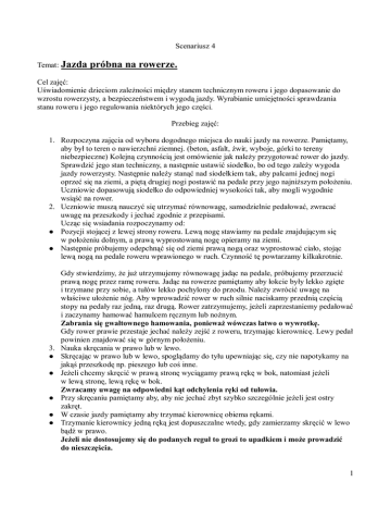 Scenariusz 4 Temat: Jazda próbna na rowerze. Cel zajęć: Uświadomienie dzieciom zależności między stanem technicznym roweru i jego dopasowanie do wzrostu rowerzysty, a bezpieczeństwem i wygodą jazdy. Wyrabianie umiejętności sprawdzania stanu roweru i jego regulowania niektórych jego części. Przebieg zajęć: 1. Rozpoczyna zajęcia od wyboru dogodnego miejsca do nauki jazdy na rowerze. Pamiętamy, aby był to teren o nawierzchni ziemnej. (beton, asfalt, żwir, wyboje, górki to tereny niebezpieczne) Kolejną czynnością jest omówienie jak należy przygotować rower do jazdy. Sprawdzić jego stan techniczny, a następnie ustawić siodełko, bo od tego zależy wygoda jazdy rowerzysty. Następnie należy stanąć nad siodełkiem tak, aby palcami jednej nogi oprzeć się na ziemi, a piętą drugiej nogi postawić na pedale przy jego najniższym położeniu. Uczniowie dopasowują siodełko do odpowiedniej wysokości tak, aby mogli wygodnie wsiąść na rower. 2. Uczniowie muszą nauczyć się utrzymać równowagę, samodzielnie pedałować, zwracać uwagę na przeszkody i jechać zgodnie z przepisami. Ucząc się wsiadania rozpoczynamy od: Pozycji stojącej z lewej strony roweru. Lewą nogę stawiamy na pedale znajdującym się w położeniu dolnym, a prawą wyprostowaną nogę opieramy na ziemi. Następnie próbujemy odepchnąć się od ziemi prawą nogą oraz wyprostować ciało, stojąc lewą nogą na pedale roweru wprawionego w ruch. Czynność tę powtarzamy kilkakrotnie. Gdy stwierdzimy, że już utrzymujemy równowagę jadąc na pedale, próbujemy przerzucić prawą nogę przez ramę roweru. Jadąc na rowerze pamiętamy aby łokcie były lekko zgięte i trzymane przy sobie, a tułów lekko pochylony do przodu. Należy zwrócić uwagę na właściwe ułożenie nóg. Aby wprowadzić rower w ruch silnie naciskamy przednią częścią stopy na pedały raz jedną, raz drugą. Rower zatrzymujemy, jeżeli zaprzestaniemy pedałować i zaczynamy hamować hamulcem ręcznym lub nożnym. Zabrania się gwałtownego hamowania, ponieważ wówczas łatwo o wywrotkę. Gdy rower prawie przestaje jechać należy zejść z roweru, trzymając kierownicę. Lewy pedał powinien znajdować się w górnym położeniu. 3. Nauka skręcania w prawo lub w lewo. Skręcając w prawo lub w lewo, spoglądamy do tyłu upewniając się, czy nie napotykamy na jakąś przeszkodę np. pieszego lub coś inne. Jeżeli chcemy skręcić w prawą stronę wyciągamy prawą rękę w bok, natomiast jeżeli w lewą stronę, lewą rękę w bok. Zwracamy uwagę na odpowiedni kąt odchylenia ręki od tułowia. Przy skręcaniu pamiętamy aby, aby nie jechać zbyt szybko szczególnie jeżeli jest ostry zakręt. W czasie jazdy pamiętamy aby trzymać kierownicę obiema rękami. Trzymanie kierownicy jedną ręką jest dopuszczalne wtedy, gdy zamierzamy skręcić w lewo bądź w prawo. Jeżeli nie dostosujemy się do podanych reguł to grozi to upadkiem i może prowadzić do nieszczęścia. 1 4. Pokaz jazdy przez prowadzącego, a następnie przez uczniów. Omawianie ewentualnych błędów napotkanych podczas jazdy po zakończeniu ćwiczeń. Jeżeli uczniowie potrafią już dobrze jeździć na rowerze możemy utrudnić jazdę slalomem, układając np.: kręgle, pachołki, klocki w odstępach dostosowanych do możliwości uczniów . 5. Podsumowanie zajęć: O czym musicie pamiętać zanim wsiądziecie na rower? Z której strony wsiadacie na rower? Jak trzymacie kierownicę? Jaką pozycję przyjmujecie na rowerze podczas jazdy? Jak układacie stopy na pedałach? Jak zatrzymujecie rower? Co należy zrobić, aby skręcić w prawo lub w lewo? 2