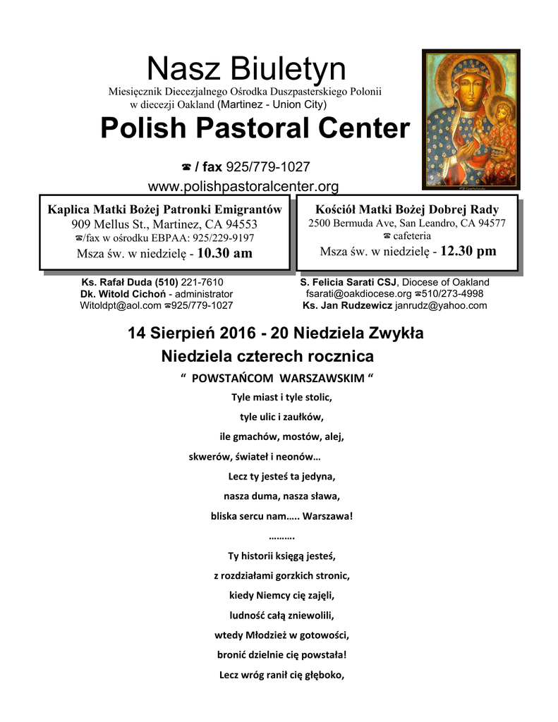 Nasz Biuletyn Miesięcznik Diecezjalnego Ośrodka Duszpasterskiego Polonii w diecezji Oakland (Martinez - Union City) Polish Pastoral Center ? / fax 925/779-1027 www.polishpastoralcenter.org Kaplica Matki Bożej Patronki Emigrantów 909 Mellus St., Martinez, CA 94553 ?/fax w ośrodku EBPAA: 925/229-9197 Kościół Matki Bożej Dobrej Rady 2500 Bermuda Ave, San Leandro, CA 94577 ? cafeteria Msza św. w niedzielę - 12.30 pm Msza św. w niedzielę - 10.30 am S. Felicia Sarati CSJ, Diocese of Oakland [email protected] ?510/273-4998 Ks. Jan Rudzewicz [email protected] Ks. Rafał Duda (510) 221-7610 Dk. Witold Cichoń - administrator [email protected] ?925/779-1027 14 Sierpień 2016 - 20 Niedziela Zwykła Niedziela czterech rocznica “ POWSTAŃCOM WARSZAWSKIM “ Tyle miast i tyle stolic, tyle ulic i zaułków, ile gmachów, mostów, alej, skwerów, świateł i neonów… Lecz ty jesteś ta jedyna, nasza duma, nasza sława, bliska sercu nam….. Warszawa! ………. Ty historii księgą jesteś, z rozdziałami gorzkich stronic, kiedy Niemcy cię zajęli, ludność całą zniewolili, wtedy Młodzież w gotowości, bronić dzielnie cię powstała! Lecz wróg ranił cię głęboko, żeś krwawiła dniem i nocą, i jęczałaś w gruzach cała…., Choć o każdy dom walczyli, dusze Ich rozdzierał zew, choć konając na kamieniach, z oczu sączył się Im gniew! ……….. A my dzisiaj wspominamy Ich patriotyzm i oddanie, łzawe karty naszych dziejów, ze wzruszeniem przeżywamy. I w serdecznym, hołdzie wielkim, Im to dzisiaj przysięgamy: że będziemy chronić miasto, dbać o honor i ojczyznę i dziękować Bogu szczodrze, że Warszawę wolną mamy!!! (Alicja Jęczmien w 72‐gą rocznicę Powstania Warszawskiego, 2016 rok) Podczas przemówienia przed niedzielną modlitwą Anioł Pański, Ojciec Święty nawiązał do rocznicy wybuchu II wojny światowej. Polacy odśpiewali Mazurek Dąbrowskiego. "Dzień pierwszego września przypomina nam początek, wybuch II wojny światowej oraz wszystkie tragiczne wydarzenia tej wojny. Obejmujemy myślą i modlitwą miliony ofiar terroru wojennego. Także tych, którzy bohatersko walczyli o wolność Ojczyzny. Niech cierpienie i smutne doświadczenia tych wszystkich, którzy przeżyli wojnę przyczyni się do trwałego pokoju, który jest prawem i dobrem wszystkich ludzi" - powiedział po polsku Ojciec Święty. Zgromadzeni na dziedzińcu Pałacu Apostolskiego w Castel Gandolfo Polacy odpowiedzieli odśpiewaniem Mazurka Dąbrowskiego. Po wysłuchaniu hymnu narodowego Papież odmówił po polsku modlitwę "Od powietrza, głodu, ognia i wojny wybaw nas Panie", na co zgromadzeni pielgrzymi z Polski odpowiedzieli kilkakrotnie powtarzanymi słowami "Wybaw nas Panie!" i okrzykami "Niech żyje Papież!". Nawiązując do rozpoczynającego się roku szkolnego, Jan Paweł II przypomniał także znaczenie świętości w życiu codziennym. "To jednak w życiu codziennym - mówił - Bóg wzywa nas do osiągnięcia dojrzałości życia duchowego polegającego na przeżywaniu w sposób nadzwyczajny rzeczy codziennych, zwyczajnych. Świętość osiąga się idąc za Jezusem nie uciekając przed rzeczywistością i doświadczeniami jakie niesie codzienne życie, ale i stawiając im czoła dzięki światłu i pomocy Ducha Świętego" - mówił Ojciec Święty, nawiązując do słów dzisiejszej Ewangelii: "To się ukazuje właśnie w tajemnicy Krzyża i co jest bardzo podkreślane w liturgii dzisiejszej niedzieli, Jezus zaprasza wszystkich wierzących do wzięcia każdego dnia swego krzyża i pójścia za Nim, naśladowania Go aż po całkowity dar z siebie dla Boga i braci." Na dziedzińcu Pałacu Apostolskiego zgromadziło się jak zwykle kilka tysięcy wiernych. Ojciec Święty w doskonałym nastroju i bardzo dobrej kondycji chętnie nawiązywał dialog z wiernymi. Z grupą pielgrzymów języka hiszpańskiego odśpiewał w ich języku fragment "Barki", a z portugalskimi pielgrzymami pieśń "Ave Maria". Na okrzyki Polaków "Niech żyje Papież" Jan Paweł II odpowiedział: "Niech żyje i dobrze się sprawuje." Dalej mówiąc po polsku Papież pozdrowił pielgrzymów z Sanoka, Łodzi oraz pielgrzymów indywidualnych. Na słowa pozdrowień Polacy odpowiedzieli: "Kochamy Ciebie! Zapraszamy!" Po odmówieniu modlitwy Anioł Pański i udzieleniu apostolskiego błogosławieństwa do papieskiego tronu podchodziły rodziny z małymi dziećmi na rękach. Ojciec Święty całował i błogosławił dzieci. Prosba oraz zaproszenie od naszego Biskupa Dear Friends, “There is something positive you and I can do to promote peace: by coming together to pray and give common witness to our desire for peace.” In my recent Bishop’s Column in The Catholic Voice (June 27), I announced the Diocese of Oakland and the Community of Sant’Egidio are organizing an Interfaith Meeting of Prayer for Peace to take place at the Conference Event Center on September 6, 2016. This Meeting is a continuation of the movement of interfaith prayer that began with Pope John Paul II in Assisi in 1986. On the occasion of the 30th anniversary of that first Meeting, the Spirit of Assisi reaches the West Coast of the United States in the Diocese of Oakland. Please do all that you can to promote this event: in your faith communities, schools, interfaith coalitions, on your websites, and through distribution of “Save the Date” flyers. The event is for everyone; we are all called to be peacemakers. Attached is a “Save the Date flyer”. Also, here are links to diocesan websites for more information and to r.s.v.p.: www.oakdiocese.org/InterfaithMeeting and www.jubileeofmercy-eb.org/page/interfaith-meeting If you have additional questions, please contact Jean Evans at [email protected]. The goal of this Interfaith Meeting is to create a community of witnesses who counter the view that religions generate violence and war. The Meeting will embody the message that peace lies at the heart of religion, and that be