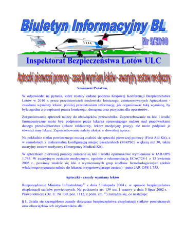 Szanowni Państwo, W odpowiedzi na pytania, które zostały zadane podczas Krajowej Konferencji Bezpieczeństwa Lotów w 2010 r. przez przedstawicieli środowiska lotniczego, zainteresowanych Apteczkami zasadami wymiany leków, poniżej przedstawiam informację, jak organizować taką wymianę, by była zgodna z przepisami prawa lotniczego, dostępna oraz przyjazna dla operatorów. Zorganizowanie apteczek należy do obowiązków przewoźnika. Zapotrzebowanie na leki i środki farmaceutyczne może być podpisane przez lekarza sprawującego nadzór nad pracownikami danego przedsiębiorstwa (lekarz zakładowy, lekarz medycyny pracy), ale może podpisać je również inny lekarz. Zapotrzebowanie należy złożyć w dowolnej aptece. Na pokładzie statku powietrznego muszą znaleźć się apteczki pierwszej pomocy (First Aid Kit), a w samolotach z maksymalną konfiguracją miejsc pasażerskich (MAPSC) większą niż 30, także awaryjny zestaw medyczny (Emergency Medical Kit). W apteczkach pierwszej pomocy zalecane są leki i środki opatrunkowe wymienione w JAR-OPS 1.745. W awaryjnym zestawie medycznym, zgodnie z rekomendacją ECAC/28-1 z 13 kwietnia 2005 r., powinny znaleźć się leki z wymienionych grup środków farmakologicznych (dobór właściwego preparatu należy do lekarza przygotowującego zestaw) - patrz JAR-OPS 1.755. Apteczki - zasady wymiany leków Rozporządzenie Ministra Infrastruktury1) z dnia 5 listopada 2004 r. w sprawie bezpieczeństwa eksploatacji statków powietrznych. Na podstawie art. 159 ust. 1 ustawy z dnia 3 lipca 2002 r. – Prawo lotnicze (Dz. U. Nr 130, poz. 1112, z późn. zm. 2)) zarządza się, co następuje: § 1. Ustala się szczegółowe zasady dotyczące bezpieczeństwa eksploatacji statków powietrznych oraz obowiązków ich użytkowników dla: 1) samolotów eksploatowanych w przewozie lotniczym - określone w załączniku nr 1 do rozporządzenia; 2) statków powietrznych eksploatowanych w lotnictwie ogólnym i usługowym – określone w załączniku nr 2 do rozporządzenia; 3) śmigłowców eksploatowanych w przewozie lotniczym – określone w załączniku nr 3 do rozporządzenia. ZAŁĄCZNIK Nr 1 (Dz.U. 262 poz. 2609 z 05.11.2004 r.) SZCZEGÓŁOWE ZASADY DOTYCZĄCE BEZPIECZEŃSTWA EKSPLOATACJI SAMOLOTÓW I OBOWIĄZKÓW ICH UŻYTKOWNIKÓW(*) W CZĘŚĆI K - PRZYRZĄDY I WYPOSAŻENIE JAR-OPS 1.745 Apteczki pierwszej pomocy (First Aid Kit) - opis zawartości patrz Wykaz nr 1. JAR-OPS 1.745 Apteczki pierwszej pomocy (Patrz AMC OPS 1.745) (a) Przewoźnik nie będzie użytkował samolotu, dopóki nie będzie on wyposażony w łatwo dostępne do użycia apteczki pierwszej pomocy (First-Aid Kits), zgodnie z tabelą 1: Tabela 1 Wymagana liczba apteczek pierwszej pomocy Zatwierdzona maksymalna konfiguracja miejsc pasażerskich (MAPSC) Wymagana liczba apteczek pierwszej pomocy 0 do 99 1 100 do 199 2 200 do 299 3 300 i więcej 4 b) Przewoźnik zapewni, aby wszystkie apteczki pierwszej pomocy były: (1) okresowo sprawdzane, tak dalece jak to jest możliwe, w celu potwierdzenia, że ich zawartość znajduje się w stanie właściwym do zamierzonego użycia; (2) uzupełniane w regularnych odstępach czasu, zgodnie z instrukcjami podanymi na etykietach lub z warunkami gwarancji środków medycznych. JAR-OPS 1.755 Awaryjny zestaw medyczny (Emergency Medical Kit) Zestaw medyczny ma zawierać – patrz Wykaz nr 2. JAR-OPS 1.755 Awaryjny zestaw medyczny (Patrz AMC OPS 1.755) (a) Przewoźnik nie będzie użytkował samolotu z zatwierdzoną maksymalną konfiguracją miejsc pasażerskich (MAPSC) większą niż 30, dopóki nie będzie on wyposażony w awaryjny zestaw medyczny (Emergency Medical Kit), w przypadku gdy dowolny punkt na planowanej trasie jego lotu będzie oddalony o więcej niż 60 minut lotu z normalną prędkością przelotową od lotniska, na którym możliwe jest uzyskanie wykwalifikowanej pomocy medycznej. (b) Dowódca zapewni, aby leki były wydawane tylko przez lekarzy, pielęgniarki lub podobnie wykwalifikowany personel. (c) Warunki przewozu: (1) Awaryjny zestaw medyczny musi być zabezpieczony przed pyłem, wilgocią i, gdy jest to uzasadnione, przewożony w bezpiecznych warunkach w kabinie załogi. (2) Przewoźnik zapewni, aby awaryjny zestaw medyczny był: (i) okresowo sprawdzany w celu upewnienia się, że jego zawartość znajduje się w stanie właściwym do zamierzonego użycia. ZA WYMIANĘ LEKÓW ODPOWIADA PRZEWOŹNIK JAR-OPS 1.630 Zasady ogólne (Patrz IEM OPS 1.630) (c) Nie wymaga się posiadania certyfikatów na następujące elementy wyposażenia: (5) apteczki pierwszej pomocy, podane w JAR-OPS 1.745; (6) awaryjny zestaw medyczny, podany w JAR-OPS 1.755; Zasady wymiany leków: a) Przewoźnik lub właściciel samolotu składa podpisane przez lekarza zapotrzebowanie na leki i środki farmaceutyczne do apteki. Najczęściej podpisują takie zapotrzebowanie lekarze sprawujący nadzór nad pracownikami danego przedsiębiorstwa (lekarze zakładowi, lekarze medycyny pracy). Takie zapotrzebowanie może podpisać dowolny lekarz; b) Apteka realizuje zamówienie; c) Przewoźnik / właściciel (lub wyznaczona osoba) dokonuje wymiany w apteczkach (np. w przypadku PLL LOT zajmuje się tym Centrum Medyczne LIM); JAR-OPS 1.760 Tlen pierwszej pomocy – odpowiada przewoźnik ZAŁĄCZNIK Nr 2 SZCZEGÓŁOWE ZASADY DOTYCZĄCE BEZPIECZEŃSTWA EKSPLOATACJI STATKÓW POWIETRZNYCH LOTNICTWA OGÓLNEGO I USŁUGOWEGO ORAZ OBOWIĄZKÓW ICH UŻYTKOWNIKÓW (PL-6)(*) ROZDZIAŁ 6. PRZYRZĄDY I WYPOSAŻENIE STATKU POWIETRZNEGO 6.2.5 Inne wyposażenie (samoloty i śmigłowce ponadto muszą być wyposażone w apteczkę do udzielania pierwszej pomocy, umieszczoną na statku w miejscu dostępnym dla załogi, z oznaczeniem jej miejsca usytuowania symbolem czerwonego krzyża i zawierająca środki medyczne do udzielania pierwszej pomocy w ilości odpowiedniej dla liczby załogi i miejsc podróżnych). WYKAZ NR 1 Apteczki pierwszej pomocy (obowiązkowe w samolotach używanych w prze