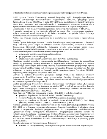 Wdrażanie systemu uznania zawodowego rzeczoznawców majątkowych w Polsce. Polski System Uznania Zawodowego stanowi integralną część Europejskiego Systemu Uznania Zawodowego Rzeczoznawców Majątkowych TEGOVA, przyjętego przez Zgromadzenie Ogólne TEGOVA w dniu 28.04.2007r. na posiedzeniu w Sankt Petersburgu. Istotą tego programu jest uporządkowanie i standaryzacja wymagań związanych z wykonywaniem zawodu w zakresie szacowania nieruchomości w krajach europejskich. Uczestniczyć w nim mogą wyłącznie organizacje zawodowe stowarzyszone w TEGOVA. O uznanie zawodowe, w tym systemie, ubiegać się mogą tylko rzeczoznawcy majątkowi będący członkami takich organizacji. W Polsce kryterium to spełnia Polska Federacja Stowarzyszeń Rzeczoznawców Majątkowych. Polska oraz Francja zostały zaproszone do i pilotażowego opracowania i wprowadzenia systemu . Zasady Ogólne Polskiego Systemu Uznania Zawodowego zostały opracowane, z inspiracji Rady Krajowej, przez zespół w składzie: Monika Nowakowska, Zdzisława LendzionTrojanowska, Krzysztof Urbańczyk. Ostateczną wersję opracowanego przez zespół dokumentu przyjęła Rada Krajowa na posiedzeniu w Katowicach we wrześniu 2007 r. W dokumencie tym wskazano cele wprowadzenia systemu : osiągnięcie wysokiego poziomu profesjonalizmu propagowanie postaw etycznych zharmonizowanie zasad wykonywania zawodu w Unii Europejskiej. Określono również procedurę postępowania kwalifikacyjnego. Ustalono, że szczegółowe zasady tej procedury zostaną określone w Regulaminie działania komisji d.s. uznania zawodowego uchwalonym przez Radę Krajową. Udokumentowaniem pozytywnego wyniku postępowania kwalifikacyjnego jest przyznanie Świadectwa Uznania Zawodowego. Jest ono wykonane w dwóch wersjach językowych: polskiej podpisanej przez Prezydenta PFSRM i angielskiej podpisanej przez Prezydenta TEGOVA. Uchwałę o nadaniu Świadectwa podejmuje Zarząd PFSRM na podstawie wyników postępowania kwalifikacyjnego, które przeprowadza Komisja Uznania Zawodowego. Założono, że pierwsza grupa osób , wyłoniona zostanie w terminie umożliwiającym nadanie im Świadectwa pod koniec maja 2008 r. Osobie posiadającej Świadectwo Uznania Zawodowego przysługuje status „Recognised European Valuer” i może ona korzystać ze skrótu REV przed lub po nazwisku. Ponadto wykaz osób posiadających Świadectwo Uznania Zawodowego zostanie umieszczony na stronach internetowych PFSRM i TEGOVA. Rada Krajowa PFSRM na posiedzeniu w dniu 12.12.2007 r. podjęła uchwały o: przyjęciu Regulaminu działania Komisji Uznania Zawodowego wyborze Wojciecha Ratajczaka (SRMWW) na przewodniczącego Komisji wyborze członków tej Komisji w osobach: Anna Mysiak (PSRWN), Lech Gutry (ŚSRM), Andrzej Lesiński (ŚPSRM) i Janusz Okoński (ŁSRM). Komisja Uznania Zawodowego ukonstytuowała się na swoim pierwszym posiedzeniu w dniu 28.01.2008 r. wybierając wiceprzewodniczącego Andrzeja Lesińskiego i sekretarza Annę Mysiak i rozpoczęła działania przygotowawcze do postępowania kwalifikacyjnego. Opracowano wzory wymaganych dokumentów uwzględniające zalecenia zawarte we wskazówkach do realizacji Europejskiego Systemu Uznania Zawodowego Rzeczoznawców Majątkowych TEGOVA oraz Zasadach Ogólnych Polskiego Systemu Uznania Zawodowego oraz ustalono termin ich składania dla osób zainteresowanych kwalifikacją w pierwszej grupie na 10.03.2008 r. Jako obowiązujące przyjęto następujące dokumenty: wniosek do Zarządu Polskiej Federacji Stowarzyszeń Rzeczoznawców Majątkowych o nadanie Świadectwa Uznania Zawodowego Rzeczoznawców Majątkowych wykaz opracowań kandydata wnioskującego o nadanie Świadectwa Uznania Zawodowego wykonanych w ramach prowadzonej działalności w zakresie szacowania nieruchomości oświadczenie kandydata o przestrzeganiu Kodeksu Etyki Zawodowej Powszechnych Krajowych Zasad Wyceny PFSRM. opis przebiegu pracy zawodowej w zakresie szacowania nieruchomości kandydata wnioskującego o nadanie Świadectwa Uznania Zawodowego Rzeczoznawców Majątkowych rekomendacja Stowarzyszenia kandydata wnioskującego o nadanie Świadectwa Uznania Zawodowego Rzeczoznawców Majątkowych. Należy zwrócić uwagę na rolę stowarzyszenia w procedurze nadawania Świadectwa. W swojej rekomendacji potwierdza ono m.in. postawę etyczną oraz spełnianie wymogu ustawicznego kształcenia. Klauzula popierająca kandydata jest istotnym elementem postępowania kwalifikacyjnego. Zaobserwowano, że część stowarzyszeń powołało komisje, które wypracowały zasady udzielania rekomendacji i podejmowała decyzję na podstawie i rozmowy z kandydatem i stosownej dokumentacji. Na kolejnym posiedzeniu w Komisji Uznania Zawodowego w dniach 18 -19.03.2008 r. zdecydowano, że rozpatrzone zostaną wszystkie wnioski, które wpłynęły do Federacji do dnia 18.03.2008r., tj. 174. Rozpatrzono pozytywnie 146 wniosków, a 28 wymagało uzupełnienia . Termin dokonania tej czynności wyznaczono do 02.04.2008 r., powiadamiając indywidualnie osoby zainteresowane o stwierdzonych brakach. W dniu 2.04.2008 r. Komisja Uznania Zawodowego rozpatrzyła z wynikiem pozytywnym 27 wniosków. Wyniki analizy dokumentów zostały przekazane Zarządowi PFSRM w celu przygotowania i podjęcia uchwały o nadaniu Świadectwa Uznania Zawodowego 173 osobom. Doświadczenie uzyskane podczas postępowania kwalifikacyjnego pozwala na sformułowanie spostrzeżenia, że sposób uzyskiwania w Polsce uprawnień zawodowych w zakresie szacowania nieruchomości sprawia, iż polski rzeczoznawca majątkowy czynnie uprawiający zawód i doskonalący swoją wiedzę poprzez uczestnictwo w szkoleniach spełnia kryteria merytoryczne ustalone przez TEGOVA dla nadania Świadectwa Uznania Zawodowego.