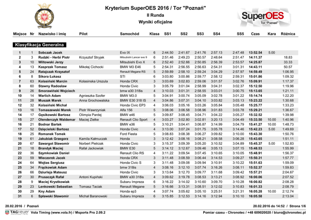 Kryterium SuperOES 2016 / Tor "Poznań" II Runda Wyniki oficjalne Miejsce Nr Nazwisko i imię Pilot Samochód Klasa SS1 SS2 SS3 SS4 6 6 6 5 5 6 3 3 4 5 4 4 5 5 4 5 4 5 3 3 5 4 3 3 4 3 4 6 5 4 6 2:44.50 2:51.46 2:52.40 2:54.31 2:59.89 3:03.80 3:03.69 3:05.79 3:10.03 3:04.91 3:04.86 3:06.03 3:08.06 3:09.87 3:03.27 3:10.21 3:13.00 3:08.83 3:12.42 3:15.37 3:14.12 3:11.22 3:11.48 3:11.48 3:08.16 3:13.64 3:09.62 3:16.22 3:16.66 3:07.74 3:15.85 2:41.67 2:49.23 2:52.66 2:56.55 2:58.10 3:00.86 3:02.83 3:01.04 3:01.31 3:00.74 3:07.31 3:05.16 3:06.58 3:08.45 3:02.80 3:04.41 3:07.24 3:08.38 3:08.16 3:09.39 3:12.67 3:09.54 3:08.59 3:09.08 3:12.10 3:12.70 3:19.78 3:14.02 3:13.31 3:05.62 3:12.53 2:41.76 2:50.57 2:50.85 2:56.63 2:59.24 2:59.77 2:59.06 2:58.99 2:58.55 3:05.09 3:04.10 3:03.26 3:08.96 3:04.71 3:02.81 3:06.87 3:01.75 3:06.27 3:08.21 3:05.20 3:09.46 3:07.45 3:06.44 3:09.94 3:07.74 3:09.77 3:08.53 3:10.60 3:08.51 3:05.10 3:14.16 2:57.13 2:48.64 2:56.39 2:54.31 3:04.29 2:58.12 3:01.57 3:04.31 3:03.01 3:02.78 3:03.82 3:05.84 3:01.83 3:04.22 3:20.13 3:14.99 3:05.78 3:09.82 3:08.58 3:10.52 3:05.13 3:10.65 3:14.53 3:10.91 3:16.26 3:11.68 3:13.21 3:09.70 3:12.02 3:25.51 3:12.94 SS5 Czas Kara 13:52.54 14:11.37 14:25.87 14:43.11 14:59.49 15:01.86 15:09.91 15:12.50 15:13.65 15:14.74 15:23.22 15:25.77 15:29.21 15:32.52 15:33.50 15:41.27 15:42.23 15:43.30 15:43.65 15:45.37 15:48.53 15:48.91 15:50.31 15:51.63 15:52.37 15:57.21 16:00.06 16:00.82 16:01.33 16:05.28 16:05.58 5.00 Różnica Klasyfikacja Generalna 1 2 3 4 5 6 7 8 9 10 11 12 13 14 15 16 17 18 19 20 21 22 23 24 25 26 27 28 29 30 31 1 3 10 13 24 8 63 60 26 14 28 32 16 17 27 21 52 25 61 67 18 36 59 64 34 66 30 9 23 29 6 Sobczak Jacek Rudzki - Herbi Piotr Wiltowski Jerzy Kasprzak Tomasz Ratajczak Krzysztof Sikora Łukasz Kolasiński Marcin Stawny Radosław Smorawiński Wojciech Warlich Adam Muszak Marek Kolasiński Michał Tomaszewski Marek Gęsikowski Bartosz Olenderczyk Waldemar Bodnar Bartek Dzięcielski Bartosz Romanek Tomek Jakubiak Grzegorz Szwargot Sławomir Brandyk Maciej Szymkowiak Daniel Wieczorek Jacek Wojtas Sergiusz Frąckowiak Adam Dziurleja Mateusz Prusaczyk Rafał Maciej Krystkowiak Lenkowski Sebastian Kny Adam Spławski Sławomir Evo IX Krzysztof Stryjek Mitsubishi Lancer evo 9 Mikołaj Cichocki Mitsubishi Evo X BMW M3 E46 Renault Megane RS Kolasinska Urszula Agnieszka Szofer Anna Grochowalska Piotr Wawrzyniak Olimpia Pardej Maciej Zielke Kamila Kałmuczak Norbert Pietrzak Rafał Jackowiak Antoni Kupiński Tomasz Taciak Michał Baranowski 20.02.2016 / Poznań Vola Timing (www.vola.fr) / Msports Pro 2.09.2 STI Honda CRX Honda Civic bmw e30 318is BMW M3.0 BMW E30 318 IS Honda Civic EP3 Alfa 156 BMW e46 Renault Clio Sport BMW e36 Honda Civic Ford Fiesta Honda Honda Civic BMW E30 Renault Clio RS Honda CRX Honda Civic S bmw 318is Honda Civic BMW e30 318is Subaru Impreza Renault Megane Honda ep3 Subaru Impreza 2:47.48 2:51.47 2:53.57 3:01.31 2:57.97 2:59.31 3:02.76 3:02.37 3:00.75 3:01.22 3:03.13 3:05.48 3:03.78 3:05.27 3:04.49 3:04.79 3:14.46 3:10.00 3:06.28 3:04.89 3:07.15 3:10.05 3:09.27 3:10.22 3:08.11 3:09.42 3:08.92 3:10.28 3:10.83 3:21.31 3:10.10 10.00 10.00 5.00 5.00 10.00 18.83 33.33 50.57 1:06.95 1:09.32 1:17.37 1:19.96 1:21.11 1:22.20 1:30.68 1:33.23 1:36.67 1:39.98 1:40.96 1:48.73 1:49.69 1:50.76 1:51.11 1:52.83 1:55.99 1:56.37 1:57.77 1:59.09 1:59.83 2:04.67 2:07.52 2:08.28 2:08.79 2:12.74 2:13.04 20.02.2016 do 14:52 / Strona 1/6 Pomiar czasu - Chronotec / +48 609020020 / VolaSoftControlPdf [email protected] Kryterium SuperOES 2016 / Tor "Poznań" II Runda Wyniki oficjalne Miejsce Nr 32 33 34 35 36 37 38 39 40 41 42 43 44 45 46 47 48 49 50 51 52 53 54 55 56 57 58 59 60 61 62 63 64 65 42 71 39 22 74 41 51 81 82 72 100 73 38 65 47 40 75 99 57 80 44 12 97 92 76 88 91 95 56 89 79 70 93 94 Nazwisko i imię Pilot Samochód Łuszczewski Tomek Żołądkiewicz Marcin Pająk Filip Kiełbasa Paweł Nowicki Darek Figas Filip Dobrucki Leszek Litwinowicz Damian Antoszewski Jan Dembiński Piotr Pytlak Przemysław Nowicki Arkadiusz Kęsy Kamil Madajczak Marcin Molicki Iwo Paetzold Kuba Wojciechowski Tomasz Litwinowicz Piotr Molicki Dominik Szafranek Łukasz Ciurzyński Michał Kryński Michał Scheffs Bartosz Magdziarz Tomasz Marta Wiśniewska Renault Clio Sport Fiat Seicento e36 318is Bmw 323ti KIA PICANTO Ford fiesta Bmw e36 Kia Picanto Kia Picanto Kia Picanto Kia Picanto Kia Picanto Corsa 2.0 Renault Twingo RS BMW 318is Bmw 318i mateusz matecki TOMASZ MAGDZIARZ Max Figas brak Aleksander Olejniczak Kinga Lis Daniel Flis Paweł Horanin Paweł Szendzina Marek Kryński Patryk Konik Darek Nowicki Kuster - Kałmuczak Kamila Schedler Tomasz Hankiewicz Maciej Rzepecki Adam Płoszaj Marcin Piątek Wojciech Piątek Adam Król Mateusz Wojciechowski Wojtek Rzepecki Tomasz Sebastian Miedziak Łukasz Burzyński Karol Mączyński Alicja Brońska 20.02.2016 / Poznań Vola Timing (www.vola.fr) / Msports Pro 2.09.2 Fiat Seicento Green Kia Picanto BMW 318is Fiat Seicento BMW e30 BMW E30 325ix Kia Picanto Kia Picanto Honda Civic Fiat UNO Fiat seicento Kia Picanto E36 318i 115KM Fiat Cinquecento Fiat CC Opel Corsa A Kia Picanto Kia Picanto Klasa SS1 SS2 SS3 SS4 4 2 4 5 2 4 4 2 2 2 2 2 4 3 4 4 2 1 4 2 4 6 1 1 2 2 2 1 4 2 2 3 1 1 3:13.66 3:14.78 3:16.80 3:12.81 3:17.87 3:17.87 3:19.58 3:21.11 3:22.93 3:20.86 3:18.92 3:25.63 3:31.95 3:27.59 3:28.07 3:23.94 3:24.24 3:22.98 3:33.21 3:29.33 3:29.68 3:36.97 3:28.32 3:24.86 3:27.11 3:29.20 3:33.07 3:29.88 3:31.52 3:36.05 3:36.28 3:31.81 3:34.99 3:36.79 3:12.52 3:13.88 3:14.18 3:13.00 3:20.53 3:15.53 3:21.54 3:15.68 3:19.64 3:15.00 3:18.49 3:20.14 3:18.04 3:19.06 3:16.76 3:23.55 3:28.53 3:20.85 3:29.22 3:24.42 3:25.64 3:33.82 3:27.66 3:24.77 3:23.48 3:24.89 3:25.24 3:33.57 3:33.41 3:32.16 3:32.66 3:35.54 3:30.57 3:31.83 3:11.98 3:12.05 3:16.46 3:11.26 3:12.79 3:13.04 3:13.76 3:14.94 3:15.83 3:15.14 3:18.29 3:14.96 3:15.36 3:24.98 3:27.60 3:21.16 3:22.08 3:21.77 3:16.24 3:22.34 3:28.27 3:21.93 3:25.99 3:29.77 3:20.83 