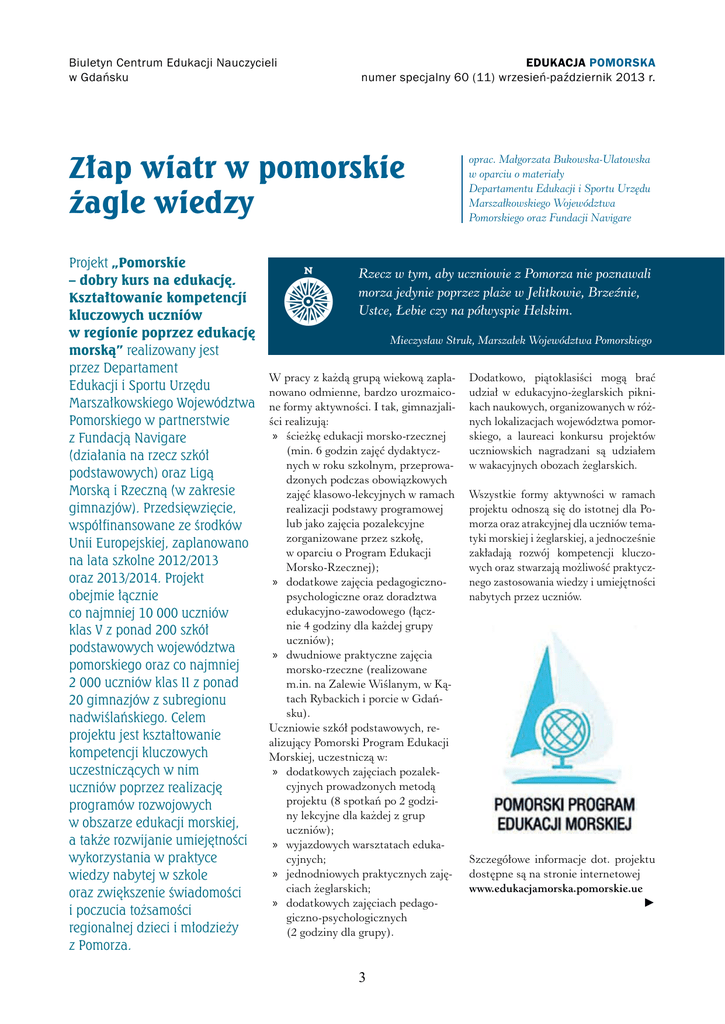 Biuletyn Centrum Edukacji Nauczycieli w Gdańsku EDUKACJA POMORSKA numer specjalny 60 (11) wrzesień-październik 2013 r. Złap wiatr w pomorskie żagle wiedzy Projekt „Pomorskie – dobry kurs na edukację. Kształtowanie kompetencji kluczowych uczniów w regionie poprzez edukację morską” realizowany jest przez Departament Edukacji i Sportu Urzędu Marszałkowskiego Województwa Pomorskiego w partnerstwie z Fundacją Navigare (działania na rzecz szkół podstawowych) oraz Ligą Morską i Rzeczną (w zakresie gimnazjów). Przedsięwzięcie, współfinansowane ze środków Unii Europejskiej, zaplanowano na lata szkolne 2012/2013 oraz 2013/2014. Projekt obejmie łącznie co najmniej 10 000 uczniów klas V z ponad 200 szkół podstawowych województwa pomorskiego oraz co najmniej 2 000 uczniów klas II z ponad 20 gimnazjów z subregionu nadwiślańskiego. Celem projektu jest kształtowanie kompetencji kluczowych uczestniczących w nim uczniów poprzez realizację programów rozwojowych w obszarze edukacji morskiej, a także rozwijanie umiejętności wykorzystania w praktyce wiedzy nabytej w szkole oraz zwiększenie świadomości i poczucia tożsamości regionalnej dzieci i młodzieży z Pomorza. c oprac. Małgorzata Bukowska-Ulatowska w oparciu o materiały Departamentu Edukacji i Sportu Urzędu Marszałkowskiego Województwa Pomorskiego oraz Fundacji Navigare Rzecz w tym, aby uczniowie z Pomorza nie poznawali morza jedynie poprzez plaże w Jelitkowie, Brzeźnie, Ustce, Łebie czy na półwyspie Helskim. Mieczysław Struk, Marszałek Województwa Pomorskiego W pracy z każdą grupą wiekową zaplanowano odmienne, bardzo urozmaicone formy aktywności. I tak, gimnazjaliści realizują: »» ścieżkę edukacji morsko-rzecznej (min. 6 godzin zajęć dydaktycznych w roku szkolnym, przeprowadzonych podczas obowiązkowych zajęć klasowo-lekcyjnych w ramach realizacji podstawy programowej lub jako zajęcia pozalekcyjne zorganizowane przez szkołę, w oparciu o Program Edukacji Morsko-Rzecznej); »» dodatkowe zajęcia pedagogicznopsychologiczne oraz doradztwa edukacyjno-zawodowego (łącznie 4 godziny dla każdej grupy uczniów); »» dwudniowe praktyczne zajęcia morsko-rzeczne (realizowane m.in. na Zalewie Wiślanym, w Kątach Rybackich i porcie w Gdańsku). Uczniowie szkół podstawowych, realizujący Pomorski Program Edukacji Morskiej, uczestniczą w: »» dodatkowych zajęciach pozalekcyjnych prowadzonych metodą projektu (8 spotkań po 2 godziny lekcyjne dla każdej z grup uczniów); »» wyjazdowych warsztatach edukacyjnych; »» jednodniowych praktycznych zajęciach żeglarskich; »» dodatkowych zajęciach pedagogiczno-psychologicznych (2 godziny dla grupy). 3 Dodatkowo, piątoklasiści mogą brać udział w edukacyjno-żeglarskich piknikach naukowych, organizowanych w różnych lokalizacjach województwa pomorskiego, a laureaci konkursu projektów uczniowskich nagradzani są udziałem w wakacyjnych obozach żeglarskich. Wszystkie formy aktywności w ramach projektu odnoszą się do istotnej dla Pomorza oraz atrakcyjnej dla uczniów tematyki morskiej i żeglarskiej, a jednocześnie zakładają rozwój kompetencji kluczowych oraz stwarzają możliwość praktycznego zastosowania wiedzy i umiejętności nabytych przez uczniów. Szczegółowe informacje dot. projektu dostępne są na stronie internetowej www.edukacjamorska.pomorskie.ue ► EDUKACJA POMORSKA numer specjalny 60 (11) wrzesień-październik 2013 r. Biuletyn Centrum Edukacji Nauczycieli w Gdańsku ◄ Sukcesem projektu jest udział w nim uczniów szkół podstawowych z terenu całego województwa, w tym z gmin, które nie leżą bezpośrednio nad morzem. Projekt w liczbach – rok szkolny 2012/2013 szkoły podstawowe: »» 227 szkół z 85 gmin województwa pomorskiego »» 4139 uczniów klas V rozwijających kompetencje kluczowe »» 557 szkolnych grup uczniowskich realizujących projekty podczas dodatkowych zajęć pozalekcyjnych »» 217 nauczycieli realizujących zadania szkolnych opiekunów grup projektowych »» 386 prac zgłoszonych do konkursu projektów uczniowskich »» 504 uczniów nagrodzonych udziałem w wakacyjnych obozach żeglarskich gimnazja: »» 24 gimnazja z gmin znajdujących się w obszarze Pętli Żuław »» 1000 uczniów klas II rozwijających kompetencje kluczowe »» 52 klasy realizujące ścieżkę edukacji morsko-rzecznej Jednodniowe praktyczne zajęcia żeglarskie Jednodniowe zajęcia żeglarskie to przygoda, która dla wielu uczniów jest pierwszym spotkaniem z prawdziwym żeglarstwem. Uczestnicy spędzają cały dzień podzieleni na załogi, ucząc się, bawiąc i – oczywiście – żeglując! Podczas zajęć przygotowanych przez Fundację Navigare piątoklasiści poznają podstawy meteorologii i uczą się patrzeć na pogodę okiem żeglarza; przypominają sobie zasady udzielania pierwszej pomocy w sytuacjach, które mogą zdarzyć się w trakcie uprawiania żeglarstwa; poznają etykietę żeglarską, szanty i morskie opowieści; uczestniczą w zajęciach plastycznych o tematyce marynistycznej oraz w lekcji o linach i węzłach. Ostatnia część zajęć, wzbudzająca zwykle najwięcej emocji, odbywa się na wodzie. O czym warto pamiętać, przygotowując się z grupą do wyjazdu na jednodniowe praktyczne zajęcia żeglarskie? 1. Ubiór na rejs: »» obuwie sportowe z miękką podeszwą (nie klapki czy buty typu wojskowego), dopuszczalne są sandały z zapięciem z tyłu; »» kurtka lub płaszcz przeciwdeszczowy, czapka (z daszkiem); »» polar lub sweter i przeciwwiatrowa kurtka (prosimy ubrać się cieplej niż ubralibyście się idąc tego dnia do szkoły); »» prosimy o zdjęcie na czas rejsu wszelkiej biżuterii. 2. Organizator zapewnia poczęstunek dla uczestników rejsu; uczniowie mogą zabrać dodatkowy prowiant lub napoje. 3. Aparaty fotograficzne, telefony komórkowe, okulary korekcyjne i przeciwsłoneczne: należy pamiętać, że te urządzenia mogą ulec uszkodzeniu podczas