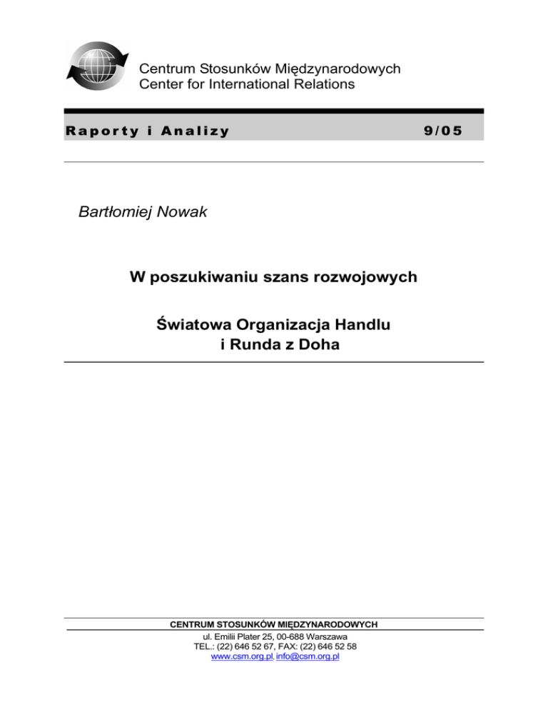 Centrum Stosunków Międzynarodowych Center for International Relations Rapor ty i Analizy Bartłomiej Nowak W poszukiwaniu szans rozwojowych Światowa Organizacja Handlu i Runda z Doha CENTRUM STOSUNKÓW MIĘDZYNARODOWYCH ul. Emilii Plater 25, 00-688 Warszawa TEL.: (22) 646 52 67, FAX: (22) 646 52 58 www.csm.org.pl, [email protected] 9/05 Centrum Stosunków Międzynarodowych © Bartłomiej Nowak* W poszukiwaniu szans rozwojowych Światowa Organizacja Handlu i Runda z Doha *Autor jest politologiem, doktorantem Kolegium Ekonomiczno-Społecznego Szkoły Głównej Handlowej, podyplomowo studiuje na Uniwersytecie Harvarda, w John F. Kennedy School of Government. Obecnie pracuje w Parlamencie Europejskim jako asystent Wiceprzewodniczącego Janusza Onyszkiewicza. Jest stałym współpracownikiem Centrum Stosunków Międzynarodowych w Warszawie. 1 Centrum Stosunków Międzynarodowych © Streszczenie Kluczową sprawą dla rozwoju gospodarczego biednych krajów są zasady światowego handlu ustalane na forum Światowej Organizacji Handlu, a dopiero w drugiej kolejności wielkość pomocy rozwojowej. Potencjalna liberalizacja zasad światowego handlu przyniesie krajom biednym korzyści porównywalne do znacznie zwiększonej – w stosunku do dnia dzisiejszego – pomocy rozwojowej, a większe o około 15 mld $ niż obecna wysokość tej pomocy. WTO wymaga poważnej reformy mającej na celu zwiększenie jej przejrzystości i demokratyzacji systemu podejmowania decyzji, aby odpowiedzieć na problem naturalnie pojawiającego się w procesie globalizacji żądania odpowiedzialności instytucji międzynarodowych i możliwości większej partycypacji innych podmiotów życia publicznego. "Klubowy model" negocjacji na forum GATT nie jest dostosowany do dzisiejszych realiów WTO. Najważniejszym jednak warunkiem skutecznego działania WTO w przyszłości jest przywództwo polityczne oraz polityczna wola dokonania zmian w zasadach światowego handlu. Aby organizacja mogła funkcjonować, musi cały czas – poprzez kolejne rundy negocjacji – posuwać się do przodu. Obecny stan światowego handlu jest daleki od wyobrażeń głównych krytyków globalizacji i liberalizacji handlowej. Kraje rozwijające się mają pomiędzy sobą o wiele większe bariery celne na towary przemysłowe oraz rolnicze niż kraje rozwinięte. 80% korzyści, jakie odniosłyby kraje ubogie z ogólnoświatowej liberalizacji handlu, pochodziłoby z redukcji taryf pomiędzy nimi samymi. Przecenia się również potencjalne korzyści, jakie mogłyby odnieść kraje ubogie z redukcji wsparcia dla rolnictwa w krajach rozwiniętych. Z 49 najsłabiej rozwiniętych krajów aż 45 jest importerami netto żywności, a 33 we wszystkich grupach produktów rolniczych. Podział w negocjacjach WTO na kraje rozwinięte i rozwijające się jest o wiele bardziej skomplikowany niż może się wydawać. Historia negocjacji dowodzi, że wiele państw biednych rozgrywało podwójną grę, oficjalnie popierając postulaty tej grupy krajów, faktycznie będąc mocno wstrzemięźliwym albo wręcz sabotując, więc koalicje przebiegały bardzo różnie. Wszystko spowodowane jest ogólnym stanem światowych porozumień handlowych, których ilość stale się zwiększa, a ogromna większość to Preferencyjne Porozumienia Handlowe i zasady specjalnego traktowania. Instrumenty te bezwzględnie w negocjacjach wykorzystywały UE i USA, dzięki czemu różnicowały koalicje krajów biednych w sposób, który sprawił, że najważniejsze interesy krajów rozwiniętych nie zostały naruszone. Aby podtrzymać Rundę negocjacji z Doha, potrzebne są odważne decyzje polityczne, a nie techniczne. W tym celu UE i USA muszą dokonać zasadniczych zmian i odejść od wspierania swojego rolnictwa, a także wykazać dużą elastyczność w tzw. "Kwestiach Singapurskich". Do tej pory nic jednak w tym celu nie zrobiono. Z drugiej strony, kraje rozwijające się powinny przestać traktować negocjacje handlowe jak rundę nad wielkością należnej im pomocy rozwojowej. Bez ustępstw z ich strony i zauważenia problemu o wiele większych barier pomiędzy nimi samymi niemożliwe będą konstruktywne rozmowy. 2 Centrum Stosunków Międzynarodowych © Spis treści: Streszczenie (s. 2) Wstęp (s. 4) Zrozumieć WTO (s. 5) WTO: spoglądając w przyszłość (s. 8) Wolny handel dziś: burząc mity (s. 10) Doha a nowe horyzonty WTO (s. 13) Klęska Cancun (s. 16) Podsumowanie: Czekając na Hong Kong (s. 18) 3 Centrum Stosunków Międzynarodowych © Wstęp Problematyka krajów rozwijających się, przyczyn ich kłopotów i perspektyw na rozwój ma w ostatnim czasie swoje szczególne miejsce w międzynarodowych dyskusjach. Od zablokowania obrad Światowej Organizacji Handlu (WTO – World Trade Organization) w Seattle w 1999 roku, przedstawiciele „alterglobalistycznych” ruchów masowo pojawiają się podczas obrad różnych międzynarodowych instytucji i gremiów zajmujących się kwestiami rozwoju, handlu, finansów i szeroko pojętego biznesu, co wiąże się z mocnym nagłośnieniem medialnym podobnych spotkań. Obok niewątpliwego zamieszania i wszystkich kwestii związanych z nurtami alterglobalistycznymi, ogromną zaletą ich działalności jest rozszerzenie i upublicznienie debaty na temat przyszłości i reform WTO, Międzynarodowego Funduszu Walutowego (MFW), ONZ, Banku Światowego, G8 itd. W opinii publicznej powstawać może wrażenie, że globalnie organizujący się przedstawiciele społeczeństwa obywatelskiego walczą z elitami finansowymi i politycznymi współczesnego świata, które podejmują najważniejsze decyzje we własnym zamkniętym gronie nie licząc się jednocześnie z najważniejszym światowym problemem: biedą i wykluczeniem społecznym. Związane są z tym postulaty demokratyzacji i wprowadzania przejrzystych zasad funkcjonowania międzynarodowych instytucji, uczestnictwa aktorów pozarządowych w procesie podejmowania decyzji, zasad egzekwowania odpow