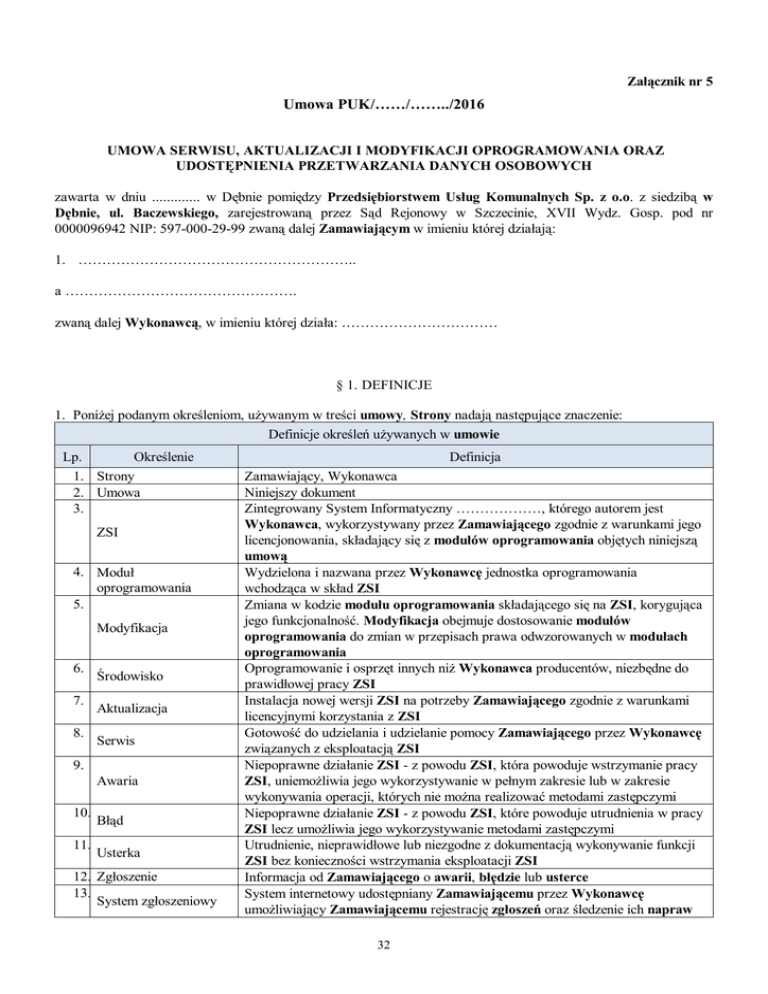 Załącznik nr 5 Umowa PUK/……/……../2016 UMOWA SERWISU, AKTUALIZACJI I MODYFIKACJI OPROGRAMOWANIA ORAZ UDOSTĘPNIENIA PRZETWARZANIA DANYCH OSOBOWYCH zawarta w dniu ............. w Dębnie pomiędzy Przedsiębiorstwem Usług Komunalnych Sp. z o.o. z siedzibą w Dębnie, ul. Baczewskiego, zarejestrowaną przez Sąd Rejonowy w Szczecinie, XVII Wydz. Gosp. pod nr 0000096942 NIP: 597-000-29-99 zwaną dalej Zamawiającym w imieniu której działają: 1. ………………………………………………….. a …………………………………………. zwaną dalej Wykonawcą, w imieniu której działa: …………………………… § 1. DEFINICJE 1. Poniżej podanym określeniom, używanym w treści umowy, Strony nadają następujące znaczenie: Definicje określeń używanych w umowie Lp. Określenie 1. Strony 2. Umowa 3. ZSI 4. Moduł oprogramowania 5. Modyfikacja 6. 7. 8. Środowisko Aktualizacja Serwis 9. Awaria 10. 11. Błąd Usterka 12. Zgłoszenie 13. System zgłoszeniowy Definicja Zamawiający, Wykonawca Niniejszy dokument Zintegrowany System Informatyczny ………………, którego autorem jest Wykonawca, wykorzystywany przez Zamawiającego zgodnie z warunkami jego licencjonowania, składający się z modułów oprogramowania objętych niniejszą umową Wydzielona i nazwana przez Wykonawcę jednostka oprogramowania wchodząca w skład ZSI Zmiana w kodzie modułu oprogramowania składającego się na ZSI, korygująca jego funkcjonalność. Modyfikacja obejmuje dostosowanie modułów oprogramowania do zmian w przepisach prawa odwzorowanych w modułach oprogramowania Oprogramowanie i osprzęt innych niż Wykonawca producentów, niezbędne do prawidłowej pracy ZSI Instalacja nowej wersji ZSI na potrzeby Zamawiającego zgodnie z warunkami licencyjnymi korzystania z ZSI Gotowość do udzielania i udzielanie pomocy Zamawiającego przez Wykonawcę związanych z eksploatacją ZSI Niepoprawne działanie ZSI - z powodu ZSI, która powoduje wstrzymanie pracy ZSI, uniemożliwia jego wykorzystywanie w pełnym zakresie lub w zakresie wykonywania operacji, których nie można realizować metodami zastępczymi Niepoprawne działanie ZSI - z powodu ZSI, które powoduje utrudnienia w pracy ZSI lecz umożliwia jego wykorzystywanie metodami zastępczymi Utrudnienie, nieprawidłowe lub niezgodne z dokumentacją wykonywanie funkcji ZSI bez konieczności wstrzymania eksploatacji ZSI Informacja od Zamawiającego o awarii, błędzie lub usterce System internetowy udostępniany Zamawiającemu przez Wykonawcę umożliwiający Zamawiającemu rejestrację zgłoszeń oraz śledzenie ich napraw 32 14. 15. 16. Naprawa Czas reakcji Czas naprawy 17. Dzień roboczy 18. Informacje poufne Obsługa zgłoszenia - awarii, błędu lub usterki – lub złożenie adekwatnych wyjaśnień przez Wykonawcę okres od chwili zgłoszenia awarii, błędu, usterki przez Zamawiającego do chwili podjęcia działań przez Wykonawcę w celu jej usunięcia okres od chwili zgłoszenia awarii, błędu, usterki przez Zamawiającego do chwili jej usunięcia przez Wykonawcę Dzień od poniedziałku do piątku, w godzinach pracy od 7.00 do 15.00, z wyłączeniem dni ustawowo wolnych od pracy na terenie Rzeczpospolitej Polskiej Wszelkie informacje, dokumenty oraz materiały dotyczące działalności jednej ze Stron, do których druga Strona uzyskała dostęp w związku z wykonywaniem umowy. Informacjami poufnymi są w szczególności informacje finansowe, organizacyjne, technologiczne, dane osobowe oraz inne informacje o działalności jednej ze Stron, które posiadają wartość gospodarczą i mogą być uznane za poufne lub zostały udostępnione drugiej Stronie z zastrzeżeniem poufności § 2. PRZEDMIOT UMOWY Zamawiający powierza, a Wykonawca przyjmuje do realizacji, serwis, modyfikację i aktualizację ZSI obejmującą niżej wymienione moduły oprogramowania: A. B. C. D. E. F. G. H. Fakturowanie i obsługa sprzedaży wywozu odpadów oraz innych usług Finanse i księgowość Obsługa sprzedaży pozostałej Kontroling Środki trwałe Kadry - płace Kasa – banki E – bok na 1 stanowisko na 1 stanowisko na 1 stanowisko na 1 stanowisko na 1 stanowisko na 1 stanowisko na 1 stanowisko na 1 stanowisko § 3. ZOBOWIĄZANIA WYKONAWCY 1. Zleceniobiorca zobowiązuje się do wykonania prac będących przedmiotem umowy zgodnie z aktualnym poziomem wiedzy technicznej i należytą starannością, 2. Ponadto Wykonawca zobowiązuje się wobec Zamawiającego do: a) prowadzenia prac w sposób zapewniający poprawne i stabilne działanie ZSI, b) wspomaganie pracowników Zamawiającego, poprzez udzielanie konsultacji i pomocy, w użytkowaniu i administrowaniu ZSI; preferowanym sposobem wspomagania będzie obsługa telefoniczna oraz z wykorzystaniem Internetu, a jeżeli okaże się to niezbędne to także wizyta w siedzibie Zamawiającego, c) instalowania nowych wersji ZSI, tj. aktualizacji z tym, że jeśli instalacja nowych wersji ZSI będzie wymagała instalacji środowiska na komputerach użytkowników to wykona ją Zamawiający wg szczegółowych wytycznych Wykonawcy, d) świadczenia usług zdalnie poprzez Internet, e) dokonywania napraw z zachowaniem terminów podanych w §4, f) Zgłoszenia oraz istotne prace z ZSI u Zamawiającego będą dokumentowane w formie pisemnej przez pracowników Stron; do dokumentowania Strony będą stosowały wzory dokumentów (notatka służbowa, karta zlecenia, protokół przekazania, protokół zdawczo-odbiorczy, a także pismo i e-mail) opisanych w Zintegrowanym Systemie Zarządzania Jakością dla norm ISO 9001 i 27001 Wykonawcy, g) sprawdzania integralności danych gromadzonych w bazie danych ZSI, h) sprawdzanie poprawności administrowania ZSI, i) nadzoru nad stanem danych i modułów oprogramowania po usunięciu awarii lub błędu, j) analizowania zgłoszonych przez Zamawiającego sugestii odnośnie zmian w modułach oprogramowania i informowania go o podjętych w tym zakresie decyzjach. Wyk