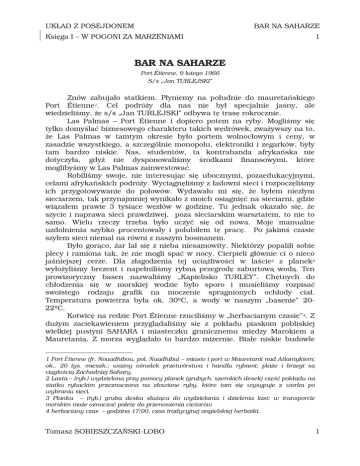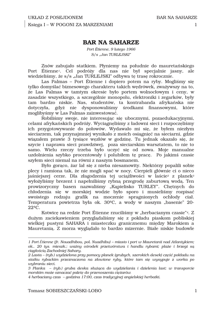 UKŁAD Z POSEJDONEM BAR NA SAHARZE Księga I – W POGONI ZA MARZENIAMI 1 BAR NA SAHARZE Port Étienne, 9 lutego 1966 S/s „Jan TURLEJSKI” Znów zabujało statkiem. Płyniemy na południe do mauretańskiego Port Étienne1. Cel podróŜy dla nas nie był specjalnie jasny, ale wiedzieliśmy, Ŝe s/s „Jan TURLEJSKI” odbywa tę trasę rokrocznie. Las Palmas – Port Étienne i dopiero potem na ryby. Mogliśmy się tylko domyślać biznesowego charakteru takich wędrówek, zwaŜywszy na to, Ŝe Las Palmas w tamtym okresie było portem wolnocłowym i ceny, w zasadzie wszystkiego, a szczególnie monopolu, elektroniki i zegarków, były tam bardzo niskie. Nas, studentów, ta kontrabanda afrykańska nie dotyczyła, gdyŜ nie dysponowaliśmy środkami finansowymi, które moglibyśmy w Las Palmas zainwestować. Robiliśmy swoje, nie interesując się ubocznymi, pozaedukacyjnymi, celami afrykańskich podróŜy. Wyciągnęliśmy z ładowni sieci i rozpoczęliśmy ich przygotowywanie do połowów. Wydawało mi się, Ŝe byłem niezłym sieciarzem, tak przynajmniej wynikało z moich osiągnięć na sieciarni, gdzie wiązałem prawie 3 tysiące węzłów w godzinę. Tu jednak okazało się, Ŝe szycie i naprawa sieci prawdziwej, poza sieciarskim warsztatem, to nie to samo. Wielu rzeczy trzeba było uczyć się od nowa. Moje manualne uzdolnienia szybko procentowały i polubiłem tę pracę. Po jakimś czasie szyłem sieci niemal na równi z naszym bosmanem. Było gorąco, Ŝar lał się z nieba niesamowity. Niektórzy popalili sobie plecy i ramiona tak, Ŝe nie mogli spać w nocy. Cierpieli głównie ci o nieco jaśniejszej cerze. Dla złagodzenia tej uciąŜliwości w laście2 z planek3 wyłoŜyliśmy brezent i napełniliśmy rybną przegrodę zaburtową wodą. Ten prowizoryczny basen nazwaliśmy „Kąpielisko TURLEY”. Chętnych do chłodzenia się w morskiej wodzie było sporo i musieliśmy rozpisać swoistego rodzaju grafik na moczenie spragnionych ochłody ciał. Temperatura powietrza była ok. 30ºC, a wody w naszym „basenie” 2022ºC. Kotwicę na redzie Port Étienne rzuciliśmy w „herbacianym czasie”4. Z duŜym zaciekawieniem przyglądaliśmy się z pokładu piaskom pobliskiej wielkiej pustyni SAHARA i miasteczku granicznemu między Marokiem a Mauretanią. Z morza wyglądało to bardzo mizernie. Białe niskie budowle 1 Port Étienne (fr. Nouadhibou, pol. Nuadhibu) – miasto i port w Mauretanii nad Atlantykiem; ok.. 20 tys. mieszk.; waŜny ośrodek przetwórstwa i handlu rybami; plaŜe i brzegi są ciągłością Zachodniej Sahary. 2 Lasta – (ryb.) wydzielona przy pomocy planek (grubych, szerokich desek) część pokładu na statku rybackim przeznaczona na złowione ryby, które tam się wysypuje z worka po wybraniu sieci. 3 Planka – (ryb.) gruba deska słuŜąca do wydzielania i dzielenia last; w transporcie morskim moŜe oznaczać paletę do przenoszenia cięŜarów. 4 herbaciany czas – godzina 17:00, czas tradycyjnej angielskiej herbatki. Tomasz SOBIESZCZAŃSKI-LOBO 1 UKŁAD Z POSEJDONEM BAR NA SAHARZE Księga I – W POGONI ZA MARZENIAMI 2 sterczały z wszędobylskiego piasku jak porozrzucane niedbale klocki róŜnej wielkości i niebanalnych kształtów, kopułki, piramidki, sześciany róŜnej wielkości i figury mieszane, jakby klocki poustawiane jedne na drugich. Wszystkie te budowle miały dwie cechy wspólne – biały kolor i bardzo małą ilość otworów, tak wejściowych, jak i okiennych. Wiele z tych wielokształtnych brył było otoczonych, teŜ wybielonymi, wspólnymi murami. Spuściliśmy statkową szalupę. Ośmiu z nas zeszło do łodzi jako jej załoga. Do statkowej łódki, którą podpłynęliśmy na śródokręcie, po krótkim sztormtrapie5 z pokładu głównego zeszli: Kwadrat, kapitan, mgr Klimaj i st. mechanik. Było bezwietrznie i woda w zatoce Nouadhibou była gładka jak lustro. Łódź popłynęła w kierunku bardzo zdezelowanego, starego drewnianego mola, na które nasza starszyzna wysiadła i udała się do najbliŜszego budynku, który wyglądał na Kapitanat Portu. Celem wizyty było załatwienie dojścia statku do tego zdezelowanego mola. Nie udało się. Miejscowi urzędnicy stwierdzili, Ŝe dobicie do tego mola tak „duŜego” statku moŜe spowodować jego zawalenie. Było to bardzo prawdopodobne, gdyŜ rzeczywiście zmurszałe i rozeschłe belki trzymały się kupy tylko dlatego, Ŝe ich nikt nie dotykał. Nie był to duŜy problem, gdyŜ po opuszczeniu drugiej szalupy i ustaleniu dyŜurów obsad na łodziach komunikacja z niezbyt odległą keją na spokojnej wodzie zatoki nie była kłopotliwa. Mnie wyjście do „miasta” wypadło na drugi dzień postoju. Zaraz po śniadaniu ubraliśmy się w eleganckie khaki6 i po przepłynięciu łodzią niespełna 100 metrów ruszyliśmy na piaski Sahary. Miejscowość wydawała się zupełnie wyludniona. Trudno było spotkać kogokolwiek na „uliczkach” między murami niskich posesji. Było bardzo gorąco. Temperatura przekroczyła juŜ dawno 40ºC. Lekki zefirek wcale nie chłodził, a jedynie podrywał z podłoŜa Ŝółty piaskowy pył, który sadowił się wszędzie: w oczach, nosie, uszach, za koszulą i w butach. Szybko staliśmy się mokrymi i oblepionymi Ŝółtą mazią postaciami. Ciemne, mokre place pod pachami, na karku i z tyłu poniŜej pasa dobitnie świadczyły o naszym nieprzystosowaniu do tutejszych warunków. Zaraz na początku przy porcie znaleźliśmy tutejszy „supermarket”, długą, niską halę, wzdłuŜ ścian której porozkładane były stragany, głównie z tutejszymi regionalnymi wyrobami. Sporo było ładnych rzeczy, ale większość kosztowała ponad nasze moŜliwości zakupu. W kilku wypadkach próbowałem zbić cenę poniŜej 5$, ale mi się nie udało. Sopociak7, Łysy8, 5 Sztormtrap – drabinka linowa ze szczeblami drewnianymi, słuŜąca do komunikacji między statkiem a łodzią czy motorówką pilotową. 6 Khaki – letnie, jasne ubranie z cienkiej ba