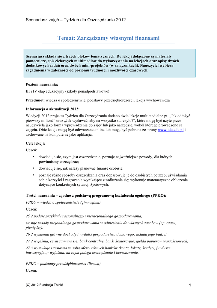 Scenariusz zajęć – Tydzień dla Oszczędzania 2012 Temat: Zarządzamy własnymi finansami Scenariusz składa się z trzech bloków tematycznych. Do lekcji dołączone są materiały pomocnicze, spis ciekawych multimediów do wykorzystania na lekcjach oraz opisy dwóch dodatkowych zadań oraz dwóch mini-projektów (w załącznikach). Nauczyciel wybiera zagadnienia w zależności od poziomu trudności i możliwości czasowych. Poziom nauczania: III i IV etap edukacyjny (szkoły ponadpodstawowe) Przedmiot: wiedza o społeczeństwie, podstawy przedsiębiorczości, lekcja wychowawcza Informacja o aktualizacji 2012: W edycji 2012 projektu Tydzień dla Oszczędzania dodano dwie lekcje multimedialne pt. „Jak odłożyć pierwszy milion?” oraz „Jak wydawać, aby na wszystko starczyło?”, które mogą być użyte przez nauczyciela jako forma wprowadzenia do zajęć lub jako narzędzie, wokół którego prowadzone są zajęcia. Obie lekcje mogą być odtwarzane online lub mogą być pobrane ze strony www.tdo.edu.pl i zachowane na komputerze jako aplikacja. Cele lekcji: Uczeń: • dowiaduje się, czym jest oszczędzanie, poznaje najważniejsze powody, dla których powinniśmy oszczędzać; • dowiaduje się, jak należy planować finanse osobiste; • poznaje różne sposoby oszczędzania oraz dopasowuje je do osobistych potrzeb; uświadamia sobie korzyści i zagrożenia wynikające z zadłużania się; wykonuje matematyczne obliczenia dotyczące konkretnych sytuacji życiowych. Treści nauczania – zgodne z podstawą programową kształcenia ogólnego (PPKO): PPKO – wiedza o społeczeństwie (gimnazjum) Uczeń: 25.2 podaje przykłady racjonalnego i nieracjonalnego gospodarowania; stosuje zasady racjonalnego gospodarowania w odniesieniu do własnych zasobów (np. czasu, pieniędzy); 26.2 wymienia główne dochody i wydatki gospodarstwa domowego; układa jego budżet; 27.2 wyjaśnia, czym zajmują się: bank centralny, banki komercyjne, giełda papierów wartościowych; 27.3 wyszukuje i zestawia ze sobą oferty różnych banków (konta, lokaty, kredyty, fundusze inwestycyjne); wyjaśnia, na czym polega oszczędzanie i inwestowanie. PPKO – podstawy przedsiębiorczości (liceum) Uczeń: (C) 2012 Fundacja Think! 1 Scenariusz zajęć – Tydzień dla Oszczędzania 2012 3.2 wyjaśnia rolę, jaką w gospodarce pełnią instytucje rynkowe: bank centralny, banki komercyjne, giełda papierów wartościowych, fundusze inwestycyjne, firmy ubezpieczeniowe, fundusze emerytalne; 3.3 oblicza procent od kredytu i lokaty bankowej, ocenia możliwość spłaty zaciągniętego kredytu przy określonym dochodzie; 3.7 rozróżnia formy inwestowania kapitału i dostrzega zróżnicowanie stopnia ryzyka w zależności od rodzaju inwestycji oraz okresu inwestowania; 3.8 oblicza przewidywany zysk z przykładowej inwestycji kapitałowej w krótkim i długim okresie; 3.10 analizuje oferty banków, funduszy inwestycyjnych, firm ubezpieczeniowych i funduszy emerytalnych. Metody realizacji zajęć: • rozmowa nauczająca, minidyskusja • praca indywidualna, praca w parach i w grupach • burza mózgów, mapa myśli • praca z zasobami źródłowymi (lekcje online, multimedia, teksty pisane, film) Czas realizacji: 2 godziny lekcyjne Pojęcia: oszczędzanie, dochód, budżet, deficyt, nadwyżka, bank, lokata, oprocentowanie zmienne i stałe, odsetki, kapitalizacja, procent składany, inflacja, tzw. podatek Belki, pożyczka, kredyt. Materiały pomocnicze: 1. Lekcja multimedialna online „Jak wydawać, aby na wszystko starczyło” (dostępna na stronie www.tdo.edu.pl) lub Karta pracy nr 1 - „Budżet rodzinny”. 2. Materiał pomocniczy nr 1: „Lokata” 3. Lekcja multimedialna online „Jak odłożyć pierwszy milion” (dostępna na stronie www.tdo.edu.pl) 4. Karta pracy nr 2 - „Obliczamy odsetki z różnych lokat” 5. Karta pracy nr 3 - „Ile zapłacę za mój tablet?” 6. Prezentacje multimedialne oraz filmy ze strony www.tdo.edu.pl Załączniki: 1. Opis zadania: Inflacja w domu i zagrodzie 2. Opis zadania: Odkładamy na koncie oszczędnościowym 3. Opis mini-projektu: Zareklamuj konto 4. Opis mini-projektu: Finanse bez tajemnic Co potrzebujemy? - skserowane karty pracy dla uczniów, - kilkanaście samoprzylepnych karteczek, - tablica lub flipchart, mazaki, - projektor lub tablica interaktywna, komputery, dostęp do internetu (zalecany). (C) 2012 Fundacja Think! 2 Scenariusz zajęć – Tydzień dla Oszczędzania 2012 Przebieg zajęć: 1. Przedstaw temat i cele lekcji. Wyjaśnij, że poświęcicie zajęcia tematyce zarządzania własnymi środkami finansowymi i oszczędzania pieniędzy oraz związanym z tym zagadnieniom. Blok tematyczny nr 1 - Planujemy nasze osobiste finanse 2. Zapytaj uczniów, jak rozumieją pojęcie oszczędzanie? Z czym im się kojarzy? Poleć, by na kolorowych kartkach zapisywali hasłowo skojarzenia, a następnie przyklejali je do tablicy lub flipchartu, na którym w środku zapisz drukowanymi literami OSZCZĘDZANIE. Gdy pomysły uczniom się wyczerpią, poproś, by w parach spróbowali ułożyć (i zapisać) definicję pojęcia „oszczędności”. Po 2 minutach poproś kilka dwójek o odczytanie swoich definicji. Wyjaśnij wątpliwości, skoryguj błędy, podaj pełną definicję (oszczędności). To różnica między dochodami (wyjaśnij, jeśli to konieczne, pojęcie i zbierz z uczniami przykłady np. pensja, kieszonkowe, dochody z inwestycji, zasiłki, premie, emerytura, renta, spadki, wygrane losowe) a bieżącymi wydatkami. Warto podkreślać, że oszczędzanie nie musi oznaczać wyrzeczeń, zawsze jednak powinno zakładać systematyczność i konsekwencję w postępowaniu. Oszczędności jest to ta część naszych dochodów, która pozostaje do dyspozycji po dokonaniu wszelkich zakupów i uregulowaniu wszystkich rachunków, czyli kwota pieniędzy odłożona na realizację przyszłych celów. Dochód jest to wyrażona w kwocie pieniędzy różnica pomiędzy naszymi wp