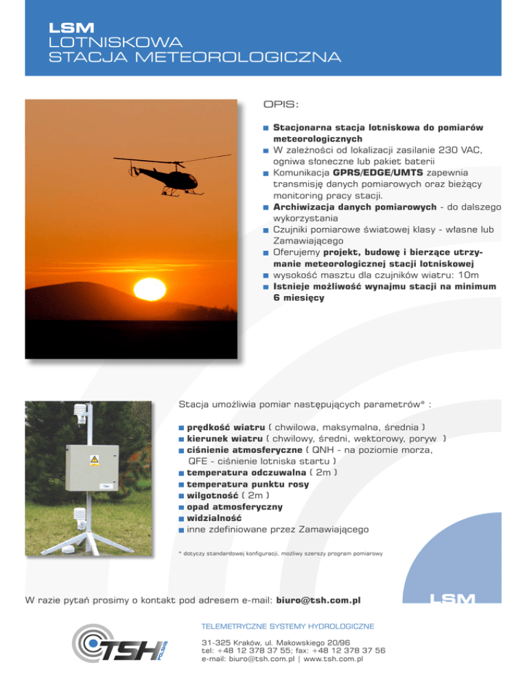 LSM LOTNISKOWA STACJA METEOROLOGICZNA OPIS: Stacjonarna stacja lotniskowa do pomiarów meteorologicznych W zaleności od lokalizacji zasilanie 230 VAC, ogniwa słoneczne lub pakiet baterii Komunikacja GPRS/EDGE/UMTS zapewnia transmisję danych pomiarowych oraz bieący monitoring pracy stacji. Archiwizacja danych pomiarowych - do dalszego wykorzystania Czujniki pomiarowe światowej klasy - własne lub Zamawiającego Oferujemy projekt, budowę i bierzące utrzymanie meteorologicznej stacji lotniskowej wysokość masztu dla czujników wiatru: 10m Istnieje moliwość wynajmu stacji na minimum 6 miesięcy Stacja umoliwia pomiar następujących parametrów* : prędkość wiatru ( chwilowa, maksymalna, średnia ) kierunek wiatru ( chwilowy, średni, wektorowy, poryw ) ciśnienie atmosferyczne ( QNH - na poziomie morza, QFE - ciśnienie lotniska startu ) temperatura odczuwalna ( 2m ) temperatura punktu rosy wilgotność ( 2m ) opad atmosferyczny widzialność inne zdefiniowane przez Zamawiającego * dotyczy standardowej konfiguracji, moliwy szerszy program pomiarowy W razie pytań prosimy o kontakt pod adresem e-mail: [email protected] TELEMETRYCZNE SYSTEMY HYDROLOGICZNE 31-325 Kraków, ul. Makowskiego 20/96 tel: +48 12 378 37 55; fax: +48 12 378 37 56 e-mail: [email protected] | www.tsh.com.pl LSM