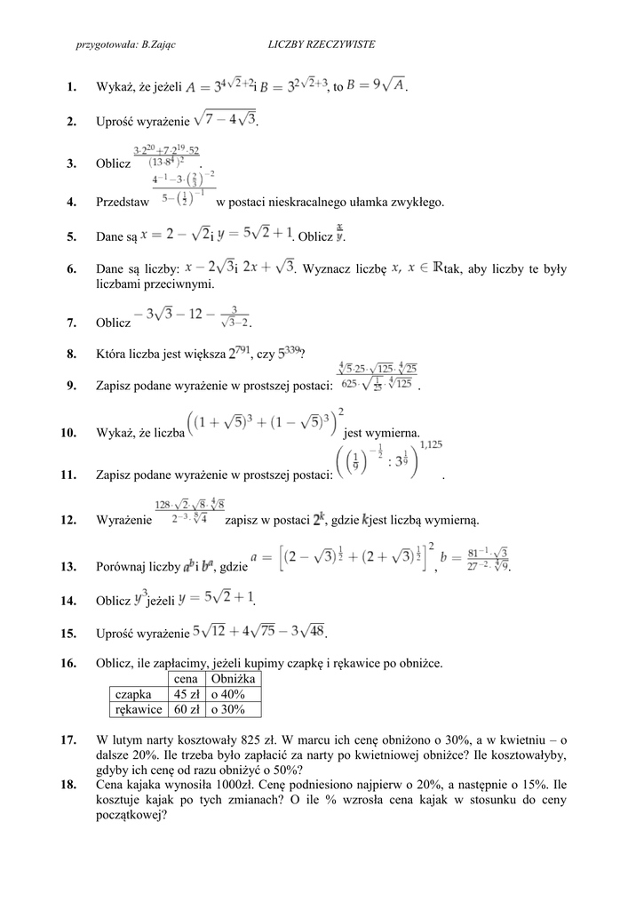 przygotowała: B.Zając LICZBY RZECZYWISTE 1. Wykaż, że jeżeli i 2. Uprość wyrażenie . 3. Oblicz 4. Przedstaw 5. Dane są 6. Dane są liczby: liczbami przeciwnymi. 7. Oblicz . 8. Która liczba jest większa , czy 9. Zapisz podane wyrażenie w prostszej postaci: , to . . w postaci nieskracalnego ułamka zwykłego. i . Oblicz . . Wyznacz liczbę i tak, aby liczby te były ? . 10. Wykaż, że liczba 11. Zapisz podane wyrażenie w prostszej postaci: 12. Wyrażenie 13. Porównaj liczby 14. Oblicz 15. Uprość wyrażenie 16. Oblicz, ile zapłacimy, jeżeli kupimy czapkę i rękawice po obniżce. cena Obniżka czapka 45 zł o 40% rękawice 60 zł o 30% 17. W lutym narty kosztowały 825 zł. W marcu ich cenę obniżono o 30%, a w kwietniu – o dalsze 20%. Ile trzeba było zapłacić za narty po kwietniowej obniżce? Ile kosztowałyby, gdyby ich cenę od razu obniżyć o 50%? Cena kajaka wynosiła 1000zł. Cenę podniesiono najpierw o 20%, a następnie o 15%. Ile kosztuje kajak po tych zmianach? O ile % wzrosła cena kajak w stosunku do ceny początkowej? 18. jeżeli jest wymierna. zapisz w postaci i . , gdzie jest liczbą wymierną. , gdzie , . . . przygotowała: B.Zając 19. Oblicz: a) b) c) d) 20. LICZBY RZECZYWISTE 60/00 liczby 400 150/00 liczby 120 0,50/00 liczby 64 20,50/00 liczby 8 Wyznacz liczbę: a) o 2% większą od 1600 b) o 15% mniejszą od 320 c) o 30% większą od 180 e) f) g) h) 25% liczby 15 401% liczby 40 150/00 liczby 300 20/00 liczby 2 d) o 75% mniejszą od3 e) o 60% większą od 5,5 f) o 220% większą od 70 21. Cenę sukni ślubnej obniżono o p%. O ile procent należałoby podnieść nową cenę, aby suknia kosztowała tyle samo co przed obniżką? a) p=50 p=60 p=20 p=36 22. Tomek złożył w banku 7500zł na lokatę roczną oprocentowaną 4% w skali roku. Oblicz, jaką kwotę odbierze po roku, jeśli od odsetek jest pobierany podatek w wysokości 20%.