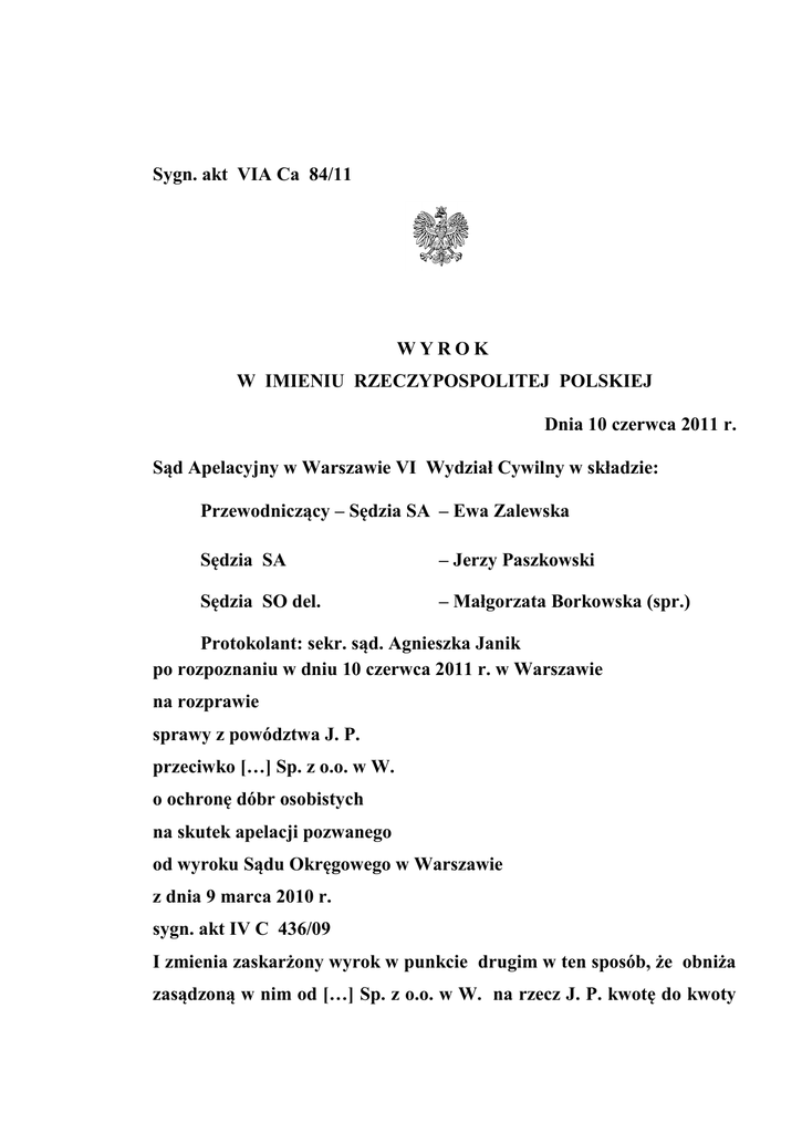 Sygn. akt VIA Ca 84/11 WYROK W IMIENIU RZECZYPOSPOLITEJ POLSKIEJ Dnia 10 czerwca 2011 r. Sąd Apelacyjny w Warszawie VI Wydział Cywilny w składzie: Przewodniczący – Sędzia SA – Ewa Zalewska Sędzia SA – Jerzy Paszkowski Sędzia SO del. – Małgorzata Borkowska (spr.) Protokolant: sekr. sąd. Agnieszka Janik po rozpoznaniu w dniu 10 czerwca 2011 r. w Warszawie na rozprawie sprawy z powództwa J. P. przeciwko […] Sp. z o.o. w W. o ochronę dóbr osobistych na skutek apelacji pozwanego od wyroku Sądu Okręgowego w Warszawie z dnia 9 marca 2010 r. sygn. akt IV C 436/09 I zmienia zaskarżony wyrok w punkcie drugim w ten sposób, że obniża zasądzoną w nim od […] Sp. z o.o. w W. na rzecz J. P. kwotę do kwoty 2 7.500 zł (siedem tysięcy pięćset złotych), w punkcie trzecim obniża zasądzoną od […] Sp. z o.o. w W. na rzecz J. P. kwotę do kwoty 960 zł (dziewięćset sześćdziesiąt złotych) tytułem zwrotu kosztów procesu oraz zmienia punkt czwarty w ten sposób, że nakazuje pobrać od [...] Sp. z o.o. w W. na rzecz Skarbu Państwa - Sądu Okręgowego w Warszawie kwotę 375 zł (trzysta siedemdziesiąt pięć złotych) tytułem opłaty od pozwu od uiszczenia której powód był zwolniony; II oddala apelację w pozostałej części; III zasądza od J. P. na rzecz […] Sp. z o.o. w W. kwotę 525 zł (pięćset dwadzieścia pięć złotych) tytułem zwrotu kosztów postępowania za drugą instancję. Sygn. akt VI ACa 84/11 Uzasadnienie Powód J. P. w pozwie z […] marca 2009r. wniósł o zakazanie pozwanej […] Sp. z o.o. w W. podejmowania działań naruszających dobra osobiste powoda, zasądzenie od pozwanej na rzecz powoda zadośćuczynienia pieniężnego w kwocie 15.000 zł oraz kosztów procesu. Pozwana […] Sp. z o.o. z siedzibą w W. wnosiła o oddalenie powództwa. Wyrokiem z dnia 9 marca 2010r. Sąd Okręgowy w Warszawie nakazał pozwanej zaprzestania naruszania dóbr osobistych powoda w postaci prawa 3 do prywatności, spokoju i nietykalności mieszkania poprzez kierowanie do powoda korespondencji i wykonywanie połączeń telefonicznych zmierzających do windykacji należności, które nie zostały stwierdzone tytułem wykonawczym a także zasądził od pozwanej na rzec powoda zadośćuczynienie w wysokości 15.000 zł oraz orzekł o kosztach postępowania. Powyższe rozstrzygnięcie Sąd pierwszej instancji oparł na następujących ustaleniach faktycznych i rozważaniach prawnych: W dniu […] lutego 2000r. J. P. zawarł z […] Sp. z o.o. umowę o świadczenie usług telefonicznych. Po upływie 2 lat umowa między stronami została przedłużona aneksem, którego treść zobowiązywała powoda do nierozwiązywania umowy w terminie 2 lat od podpisania aneksu, pod groźbą zapłaty kary pieniężnej w wysokości 750 zł, stanowiącej opłatę za przedwczesne odłączenie od sieci […] Sp. z o.o. Powód zerwał obowiązującą umowę w dniu […] listopada 2003r., co spowodowało że został zobowiązany przez pozwaną do zapłaty kary pieniężnej. Powód uważał, że nie ma obowiązku zapłaty kary umownej m.in. z tego powodu, że nie otrzymał aneksu do umowy i nie miał do końca świadomości zawartych warunków umowy. Powód nie uregulował należności na rzecz […] sp. z o.o., który to podmiot dokonał przelewu wierzytelności na rzecz innych podmiotów zajmujących się egzekucją należności. Najpierw na rzecz […] z siedzibą w W., a następnie Kancelarii Prawnej […] z siedzibą we W. W dniu […] grudnia 2005r. wierzytelność została przelana na rzecz […] Sp. z o.o. z siedzibą w W. Początkowo pisma kierowane do powoda przez pozwaną spółkę miały charakter ponagleń do zapłaty oraz informowały jaką kwotę wraz z 4 odsetkami należy uiścić na konto spółki, z czasem charakter ich uległ zmianie. Powód był w kolejnych pismach informowany m.in. o próbie skontaktowania się przez pełnomocnika pozwanej celem przygotowania materiałów dowodowych w sprawie oraz w celu ustalenia daty pobrania próbek pisma do ekspertyzy przez grafologa. Pozwana kierowała do powoda liczne wezwania do złożenia wyjaśnień, z podaniem konkretnej daty i miejsca gdzie powód miał się stawić i to zarówno w siedzibie spółki jak i zastrzeżeniem, że w danym dniu ma być obecny w domu i oczekiwać na wizytę „terenowego inspektora”. W kolejnych pismach pozwana […] Sp. z o.o. informowała powoda, że zostanie rozpoczęta procedura mająca na celu ustalenie źródeł dochodu i wyjawienie składników majątku, że w najbliższym czasie dłużnika może odwiedzić inspekcja terenowa, dalej że została przeprowadzona wizyta oraz lustracja w miejscu zamieszkania powoda, która jakoby nie potwierdziła złej sytuacji materialnej dłużnika. Wskazywano, że powoda czeka kolejna wizyta inspektora terenowego, w toku której uzupełnione zostaną dane dotyczące wnętrza nieruchomości stanowiącej jego miejsce zamieszkania oraz nastąpi ocena wartości posiadanej nieruchomości i pozostałej części majątku powoda. Do powoda kolejne pisma pozwana wysyłała dalej w 2008r. tytułując je „kwestionariuszem wywiadu”, dalej informowała o kosztach sądowych i komorniczych, którymi może zostać obciążony. Do powoda kierowane były też liczne telefony z żądaniem uregulowania należności. Powód ma 71 lat, cierpi na chorobę nowotworową, stwierdzono u niego przerzuty do płuc i wątroby. Cierpi też na nadciśnienie i cukrzycę. Przeszedł udar mózgu. W oparciu o powyżej ustalony stan faktyczny Sąd pierwszej instancji uznał roszczenie powoda za zasadne na podstawie art. 23 i 24 k.c. 5 Sąd pierwszej instancji stwierdził, że działania pozwanej naruszały prywatność powoda. Pozbawiały go poczucia spokoju i bezpieczeństwa. Sąd pierwszej instancji uznał także, że doszło do naruszenia nietykalności mieszkania pojmowanego jako prawo do ochrony przed bezprawnym wtargnięciem w sferę określonego stanu psychicznego i emo